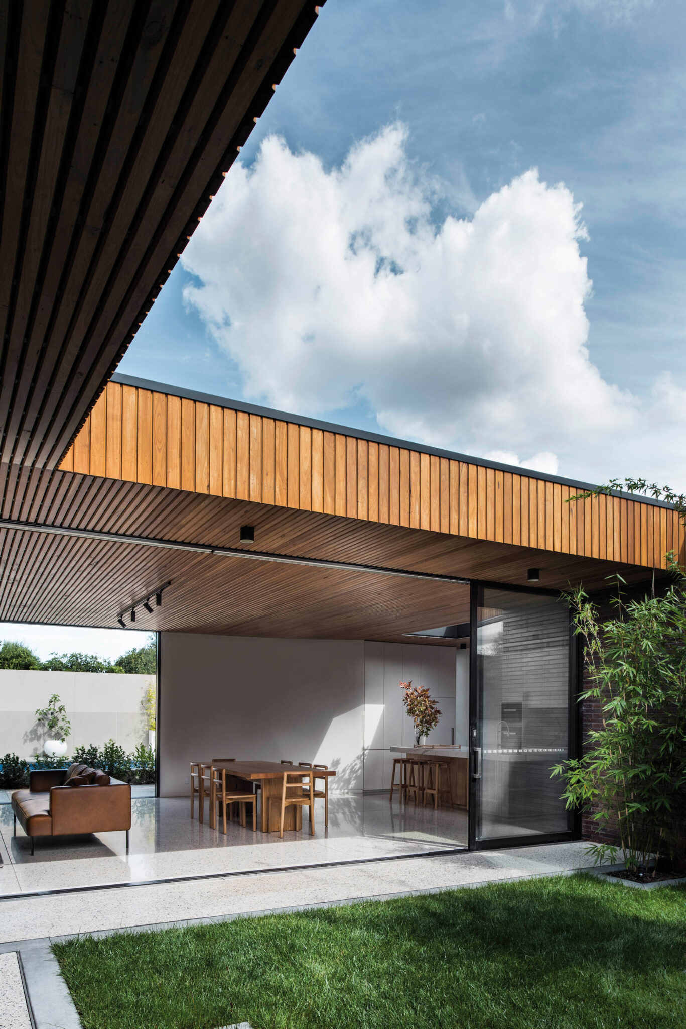 On accède au jardin central depuis plusieurs pièces de la maison ; là, c’est la fluidité des mouvements qui est mise en exergue tandis que le choix des matériaux connecte aussi les deux mondes. De fait, les lattes de bois plaquées sur les plafonds de la maison, guident