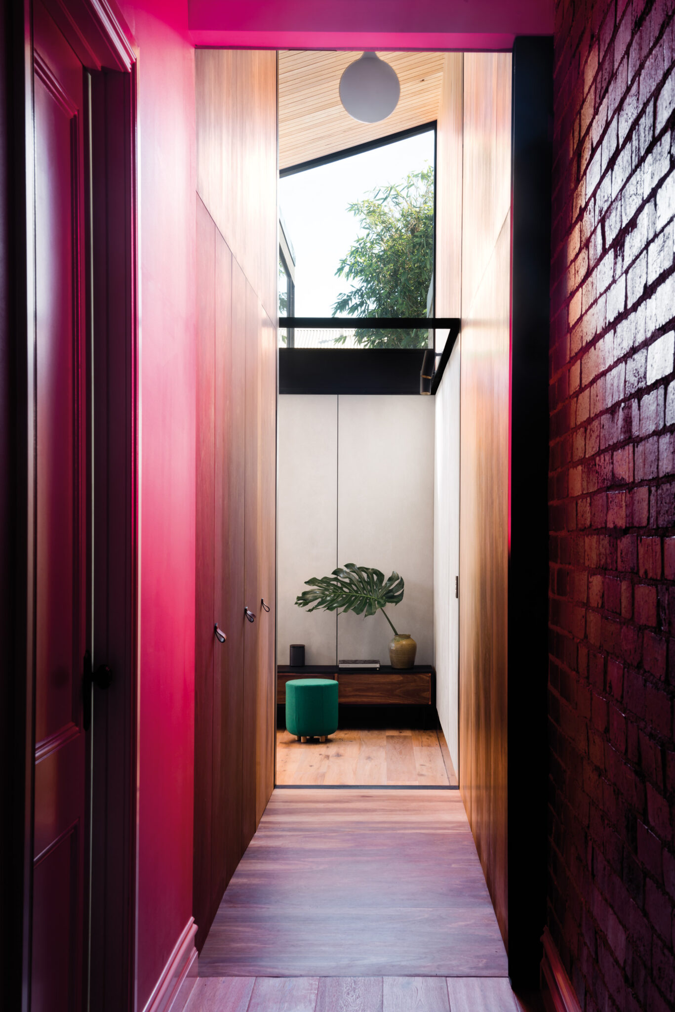 Pour la maison Corridor, c’est d’un ouvrage d’extension et de rénovation dont il s’agit. Un travail de cohésion mais aussi de cohérence entre les parties, celles existantes et celles à venir. Pour ce faire, les architectes ont trouvé là, la celle d’un long couloir, de 5 mètres de hauteur et 2 mètres de longueur, chambre d’écluse entre les deux mondes. C’est ce connecteur qui permet l’association de deux styles, deux genres, sans donner l’impression d’un subterfuge trop facile. Au contraire, véritable clé de voûte du nouvel ensemble, le « corridor » porte les stigmates des deux. Plus synthèse que compromis, il est le passage obligatoire entre les deux mondes qui alors s’associent sans vergogne. Là, Michael et Adi ont à nouveau utilisé le bois pour marquer l’alliance, annonçant au passage les bardages et plaquages de bois blond qui couvrent le nouvel espace. Un espace où de larges baies vitrées ont été placées sur les parties les plus hautes des murs pour capturer plus aisément la lumière du jour. D’autres fenêtres s’ouvrent également pour donner cette fois-ci un accès direct au jardin de la maison Corridor.