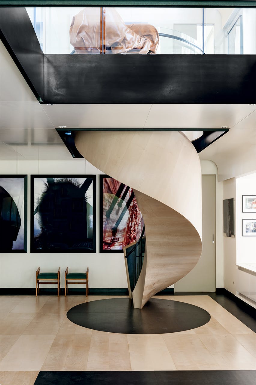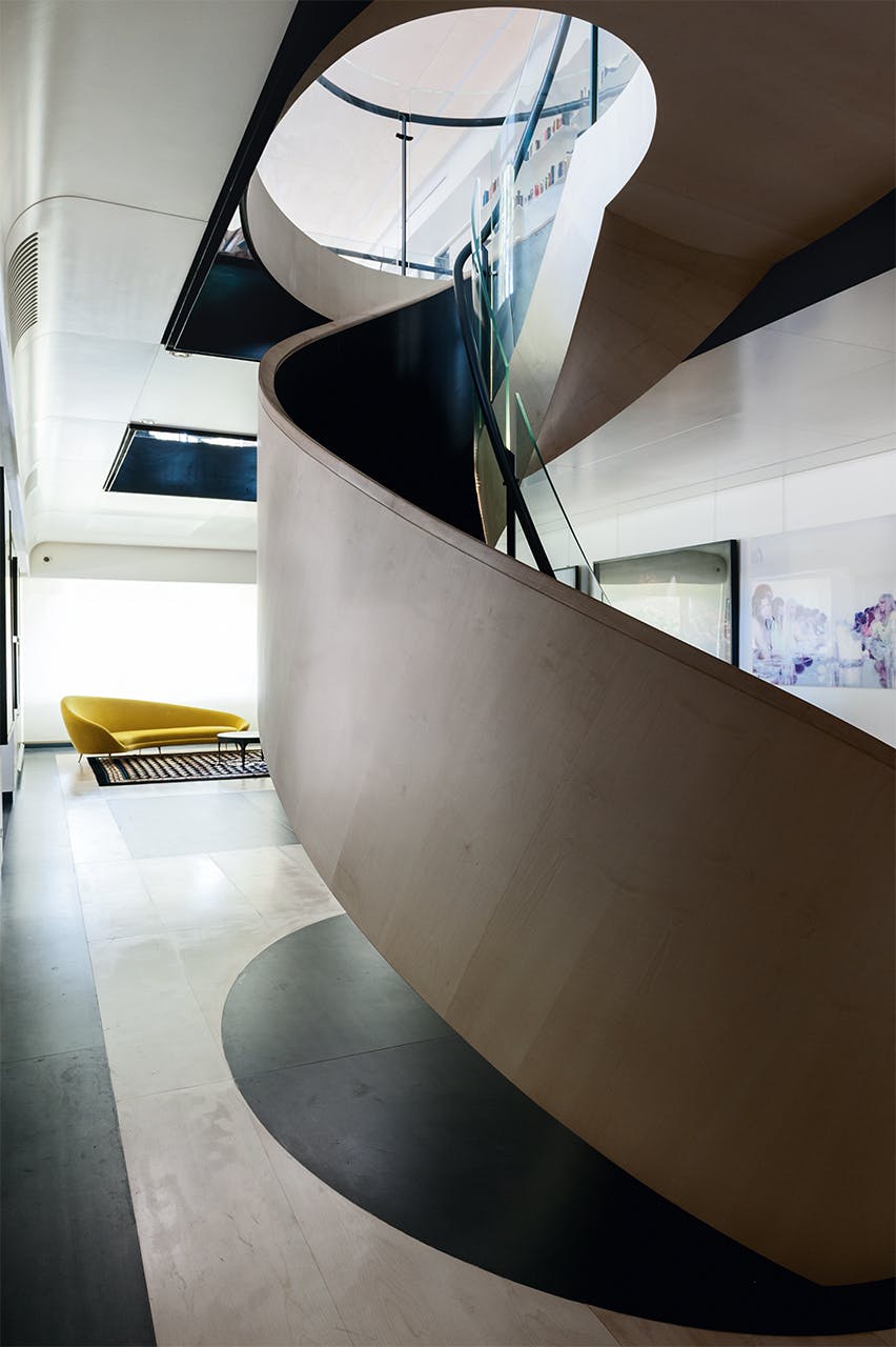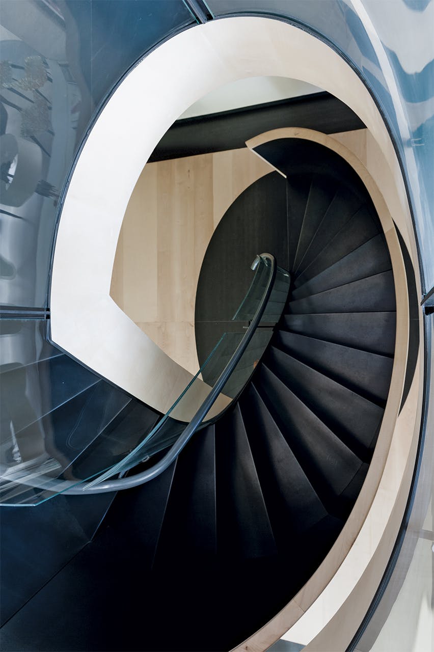L’escalier sculptural est construit en bois d’érable et est une pièce solide de l’artisanat. Il dessine sur une ellipse, avec un très petit axe où la courbe de bois et de verre est à la limite de ce qui est physiquement possible à réaliser.