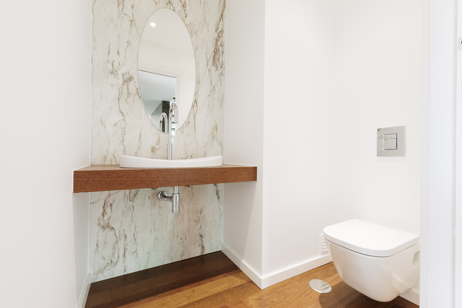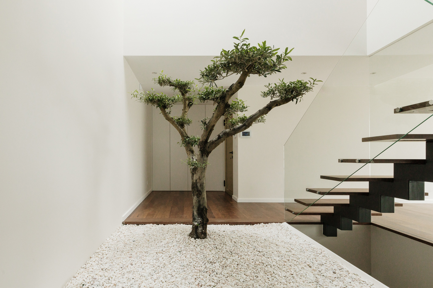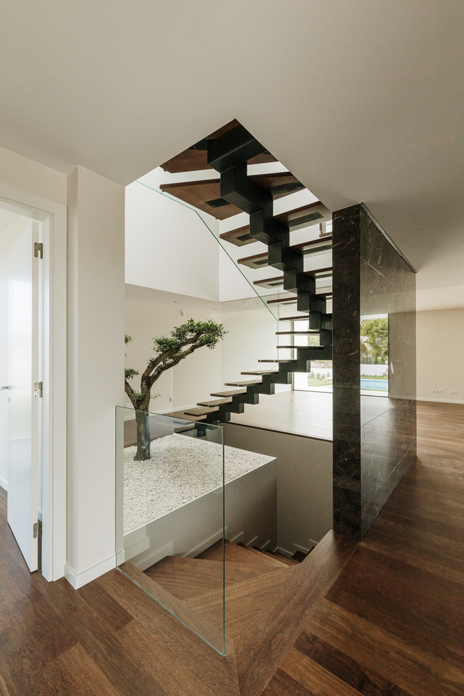 Le premier niveau est dédié au salon avec la cuisine, le salon, une salle de bains et une chambre d’amis, tandis que l’étage est dédié à la zone nuit avec trois suites avec salle de bains et dressing. Les différents niveaux sont reliés par un escalier lumineux, avec des marches en bois desserrées, soutenues par une structure en métal, dans un seul espace ouvert et avec un éclairage zénithal. Dans cette zone, un jardin intérieur accueille les invités de la famille.
