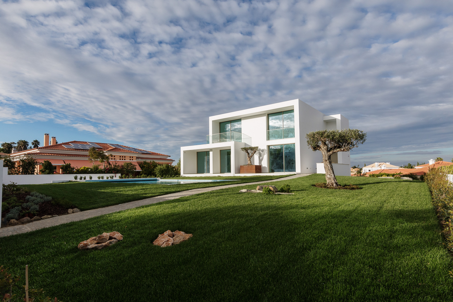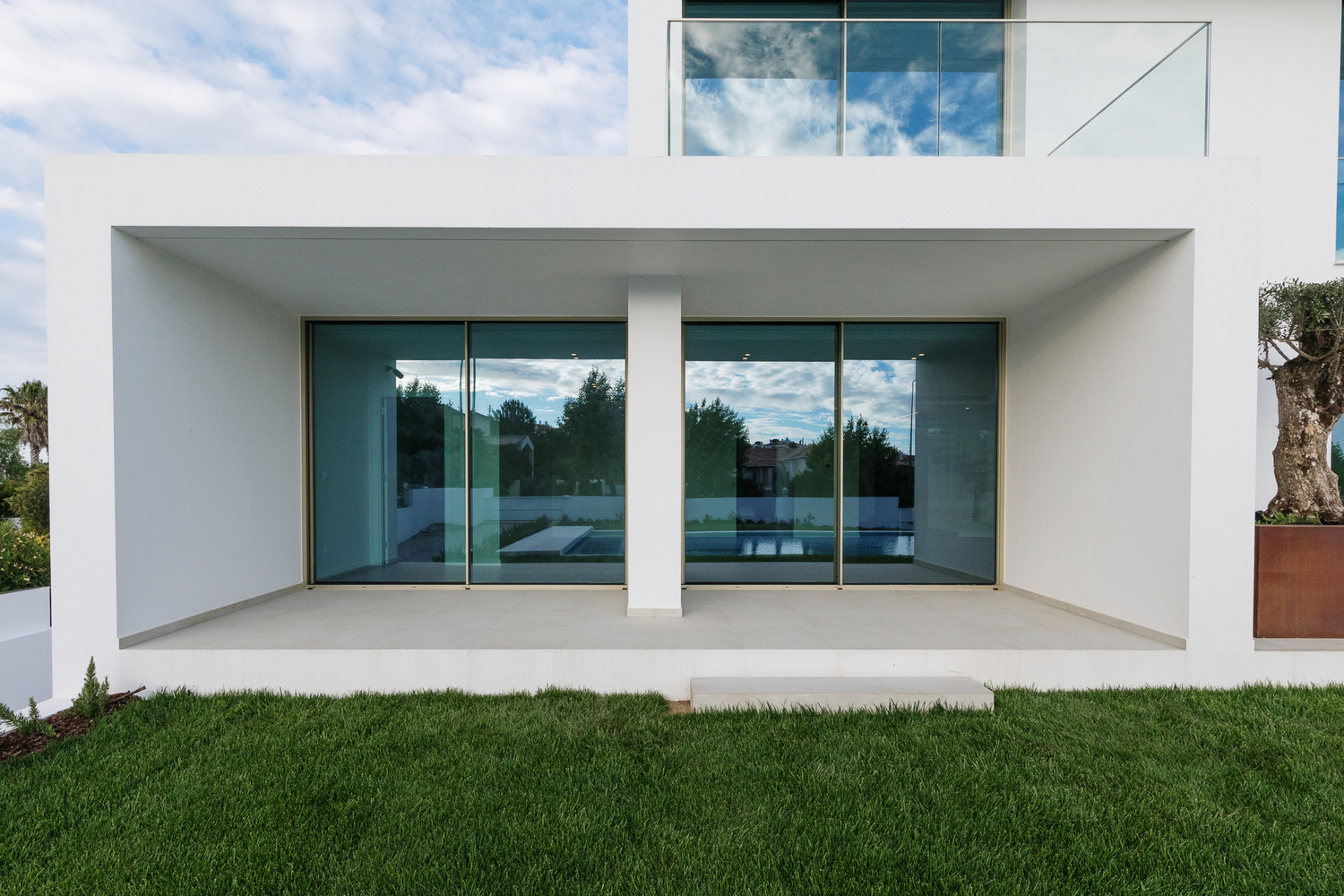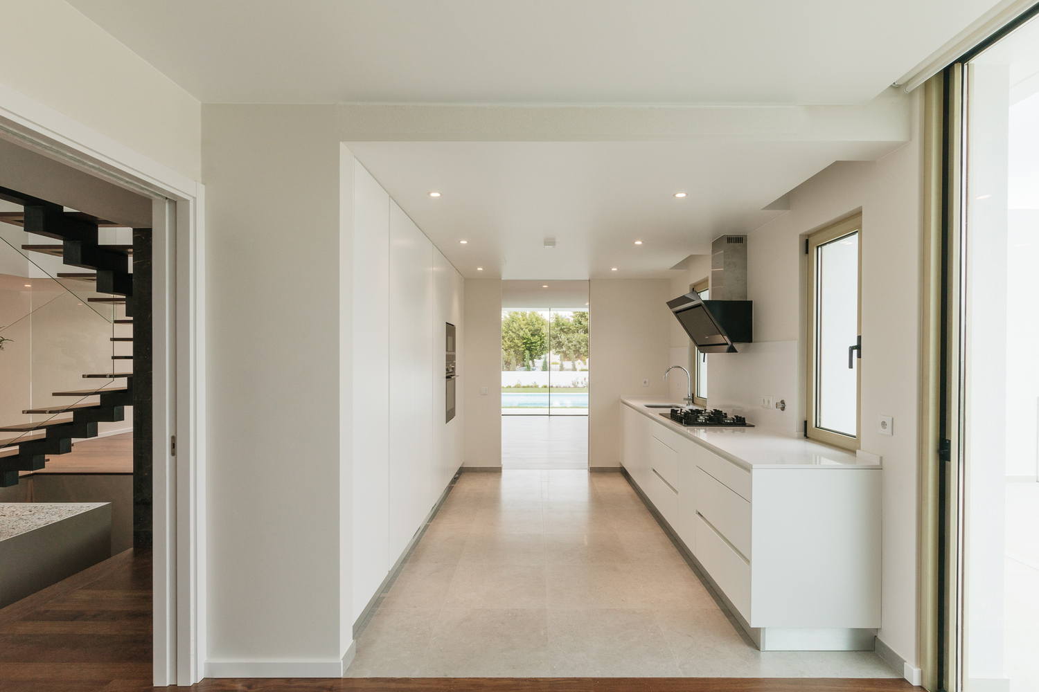 La palette de matériaux utilisée est minimisée, la recherche simplifie le langage architectural pour améliorer pleinement le concept, mais sans sacrifier la fonctionnalité et la pertinence de la sélection. La maçonnerie en pierre locale devient le protagoniste, comme vous pouvez le trouver dans le mur de l’escalier qui relie le plancher en bois. Extérieurement, le rendu blanc caractérise les volumes, contrastant avec le jardin en pelouse verte et l’immense piscine commandant la parcelle. Tous les espaces extérieurs sont articulés par ceux du logement, même avec la connexion des oliviers, rendant l’environnement continu, avec un confort et une habitabilité élevés.
