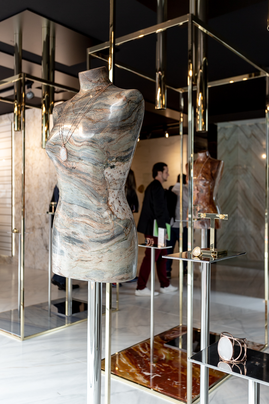 Ici, cet espace, conçu comme un grand jardin dans lequel des blocs de marbre monumentaux ont été de faux gratte-ciel, est devenu un carrefour de rencontres entre professionnels du secteur et de nouvelles opportunités commerciales. enfin, une présence constante dans toutes les installations créées par Alessandro La Spada ne pouvait pas être laissée de côté : l’éclairage de Clan Milano, une jeune réalité dans le design d’intérieur dont La Spada est également directeur artistique. Les deux lustres Pois ont épousé la matérialité di marbre éthéré.