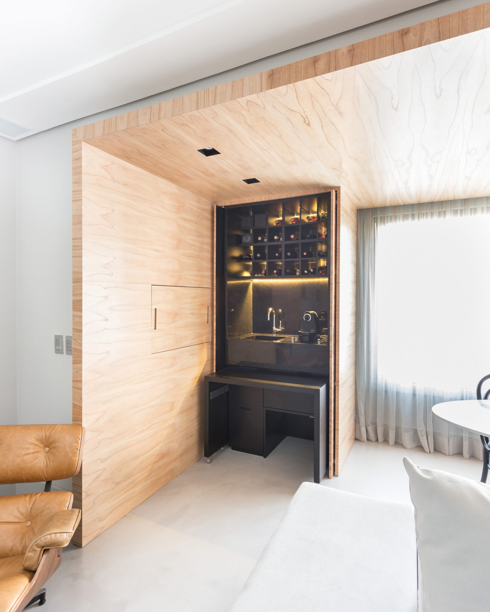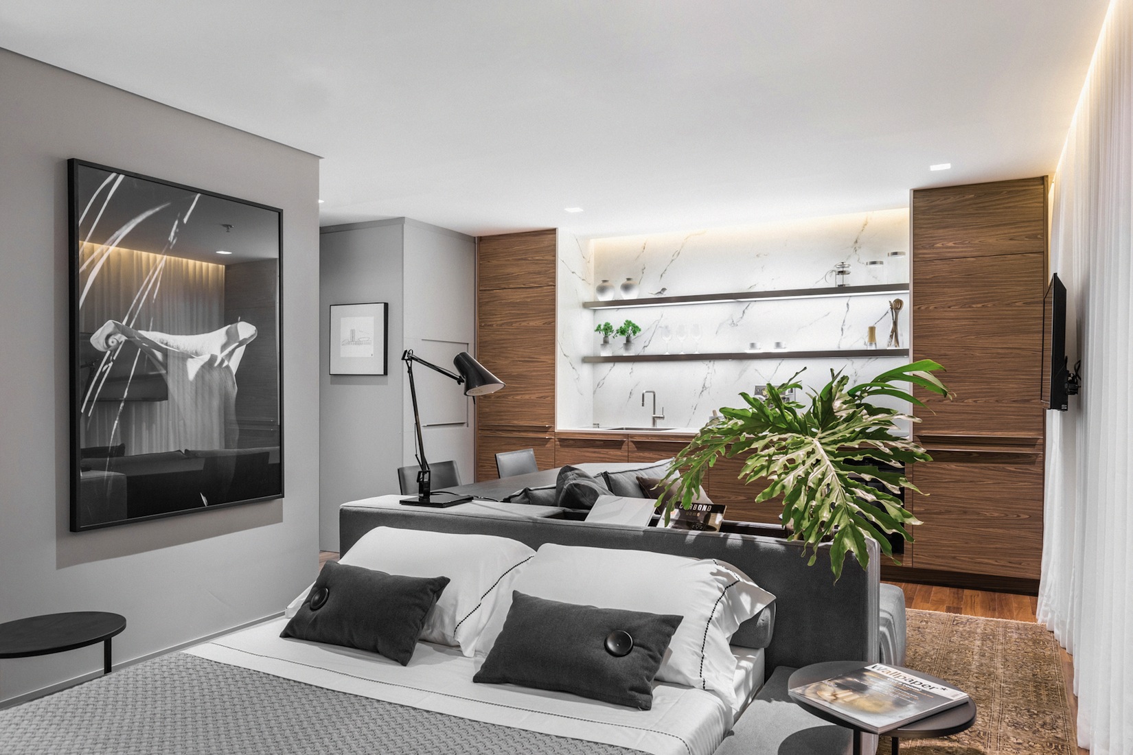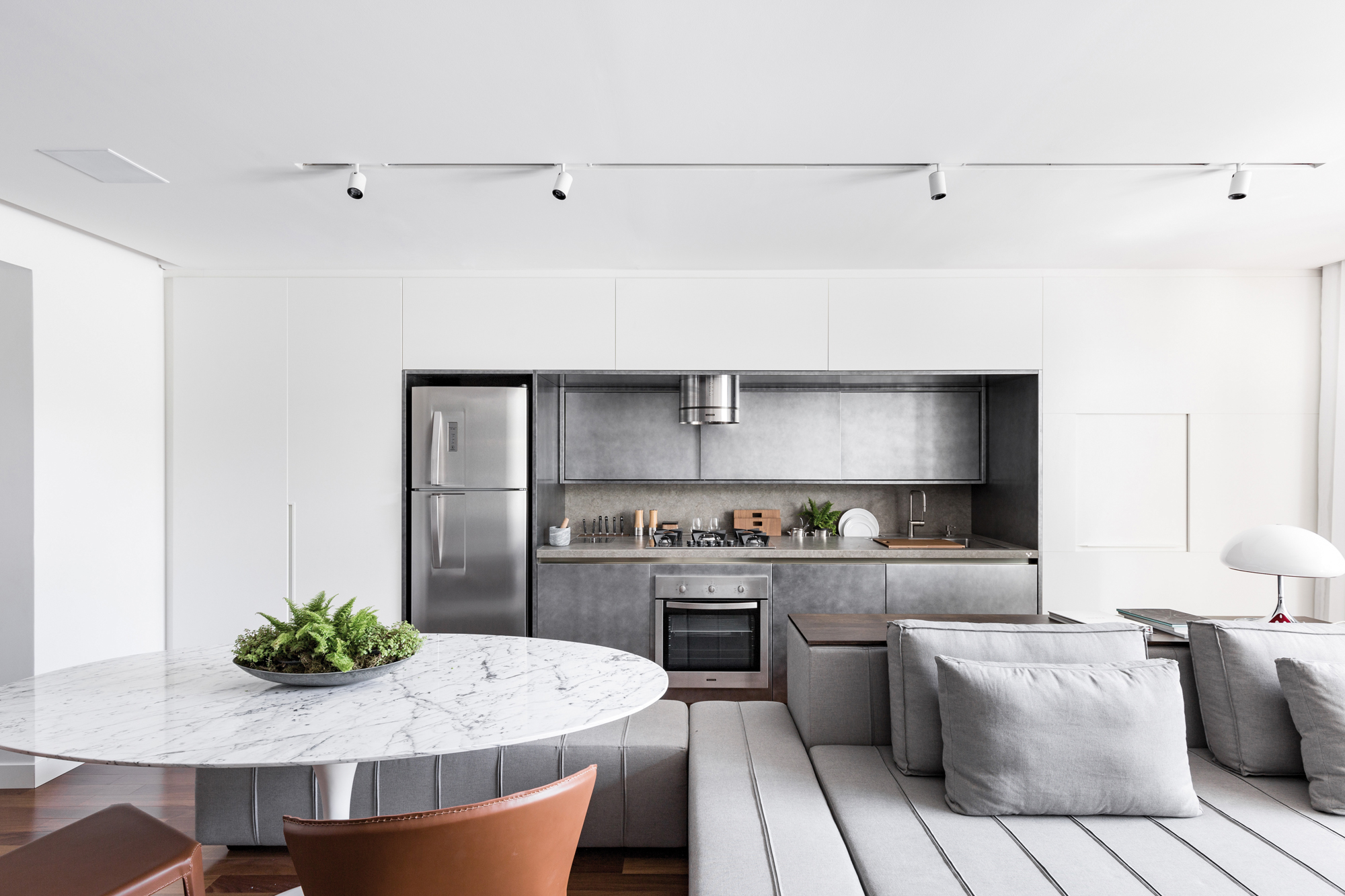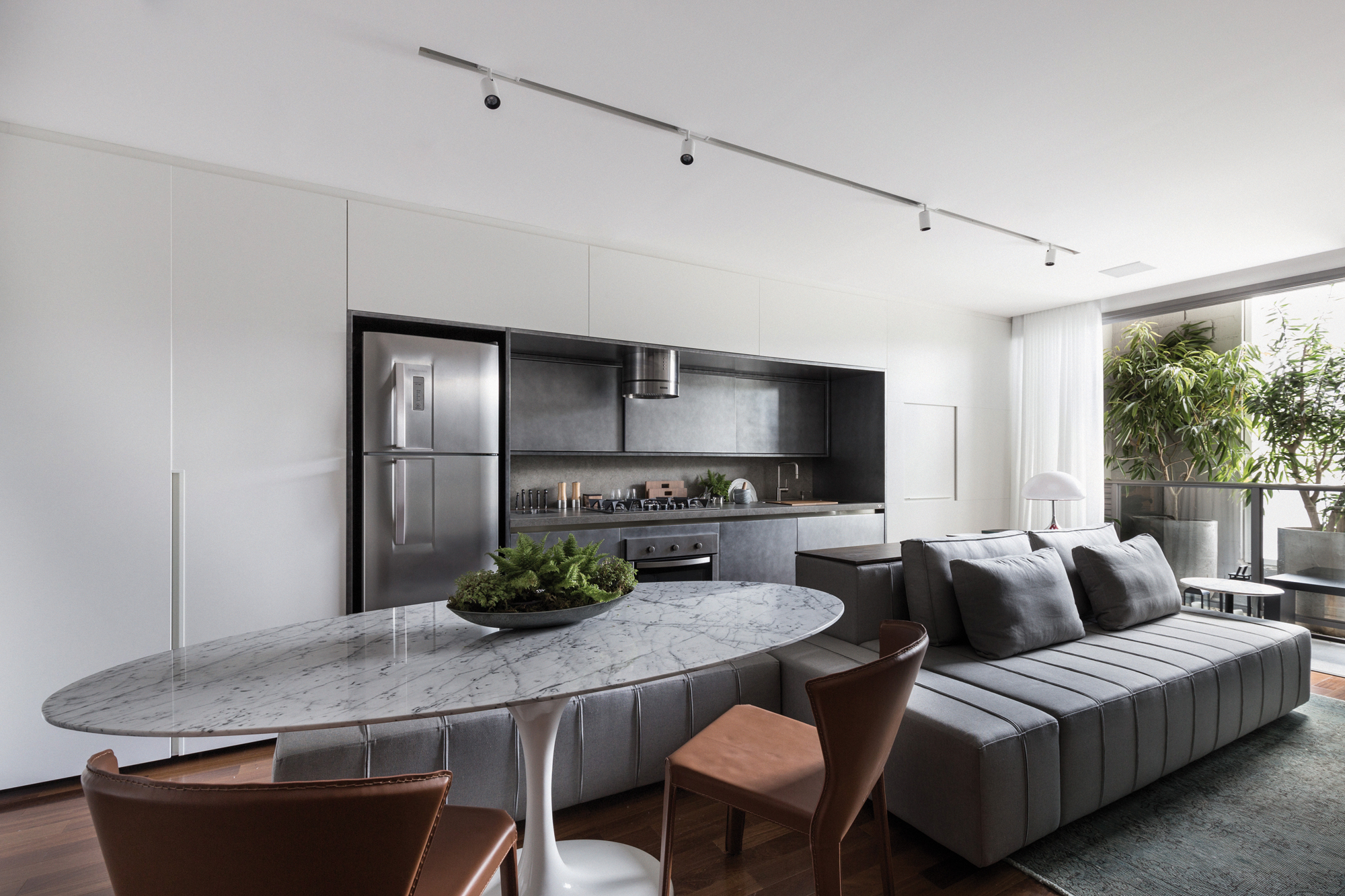 Mais alors, comment faire sortir de sa rigueur, sa torpeur même, un lieu qui par essence doit servir les habitants qui l’occupent ? Ici, João Pedro Crescente et Raquel Zaffalon changent d’instrument. Pour briser froideur et ordre, ils utilisent quelques gimmicks qui, bien plus que de créer la tempête, posent les choses. Avec en pièce maîtresse ce canapé, un idiome fort de l’agence, qui s’impose comme l’incarnation physique d’un confort sans rigueur et sans limite. Partout, de l’appartement JB ou Anita, le sofa est presque démesuré. Si ce n’est par la taille, ce pourra être par sa couleur franche et péremptoire comme dans l’appartement Aspen où son cuir orangé rompt tous les codes mis en place autour de lui, pour venir s’imposer incontournable, comme un centre névralgique et perturbateur. Le point culminant de toutes les sensibilités.