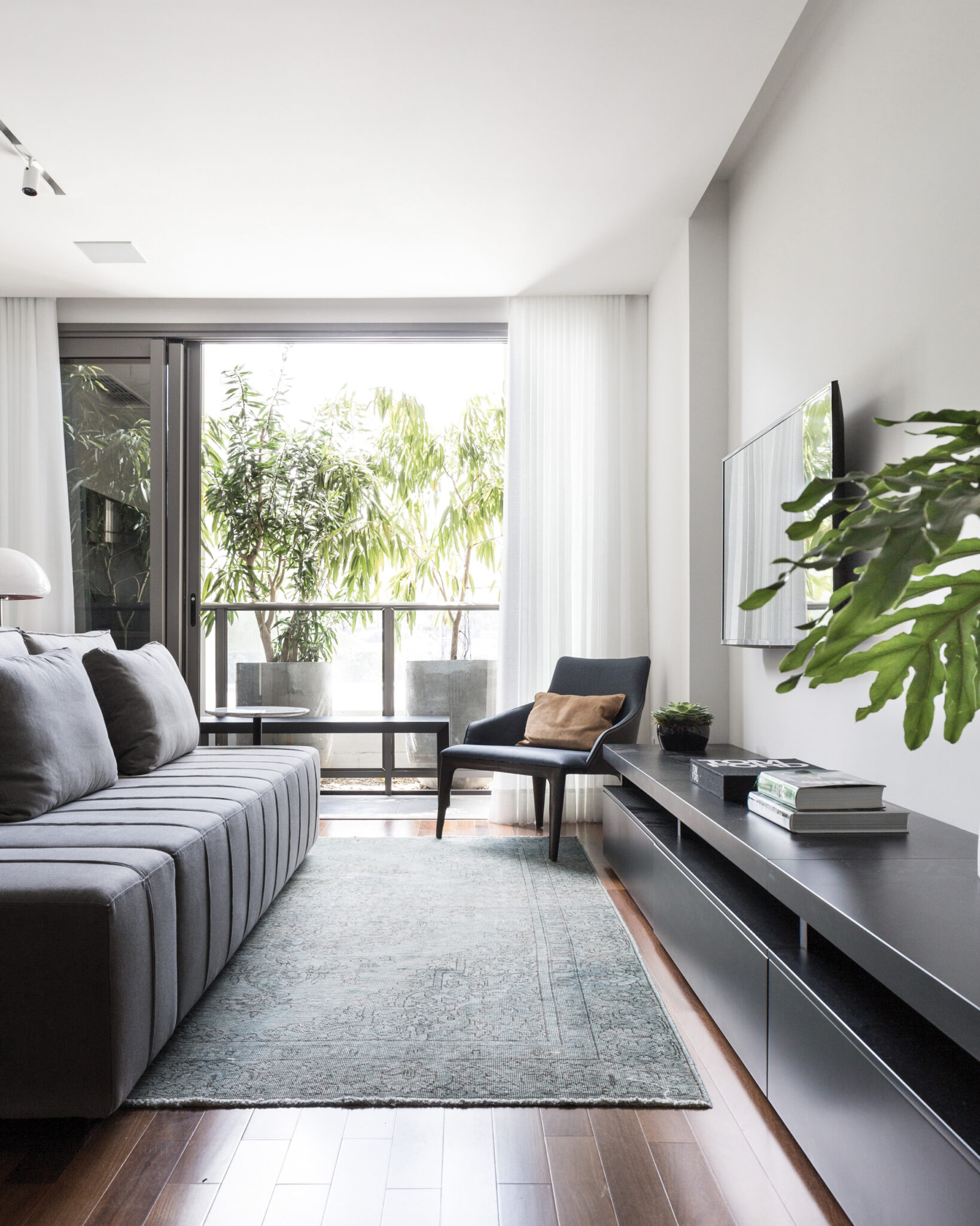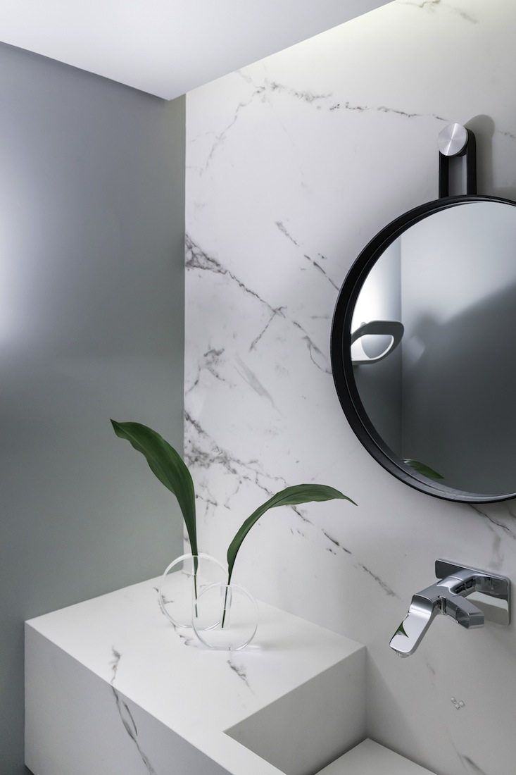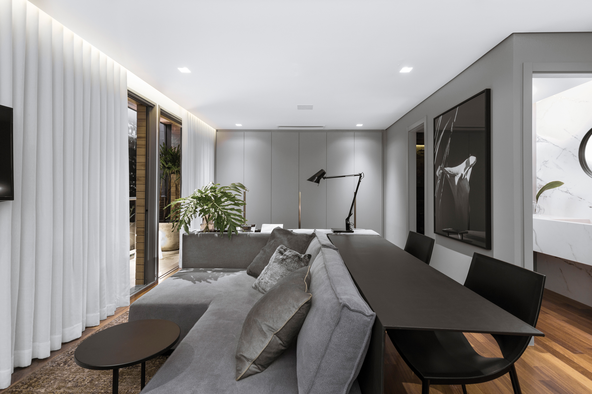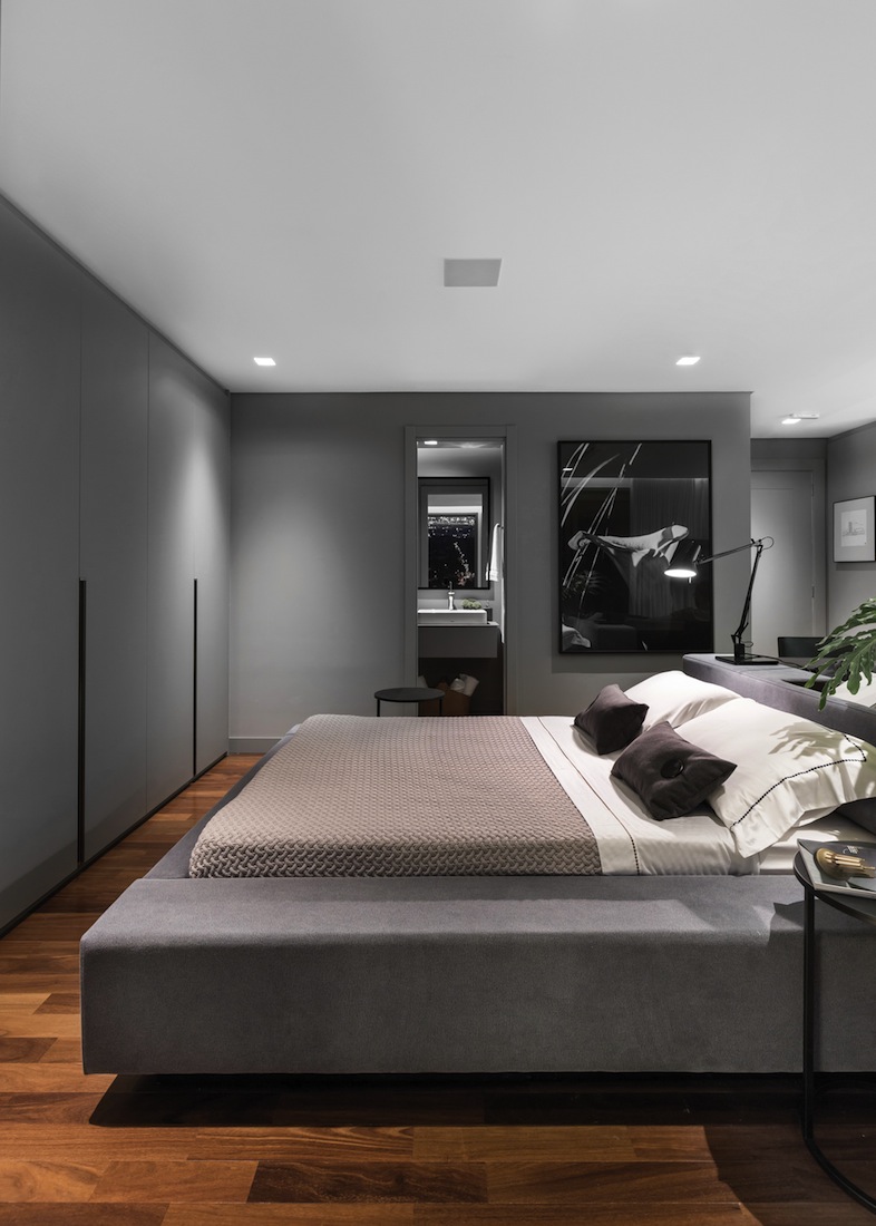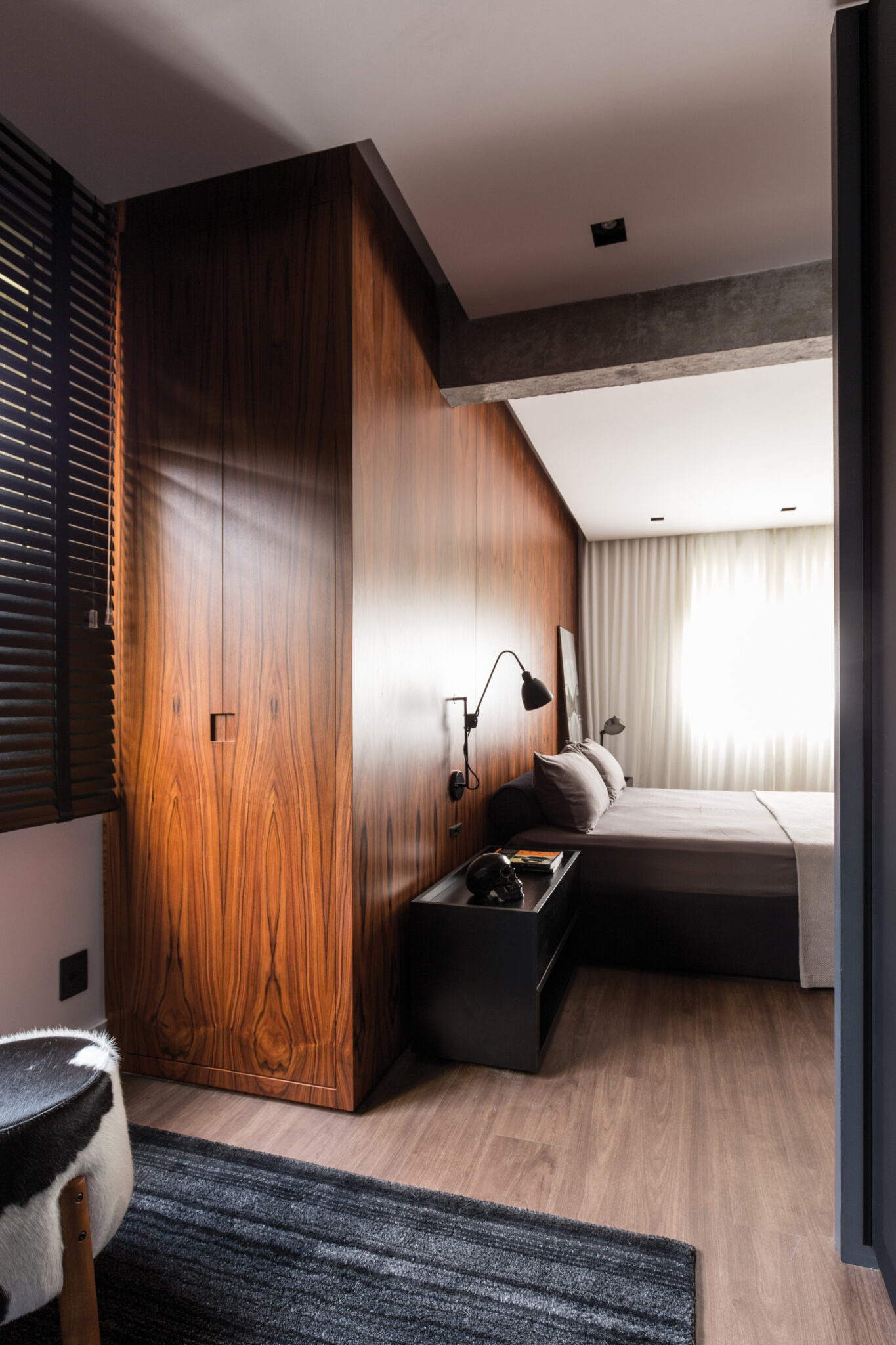 Mais alors, comment faire sortir de sa rigueur, sa torpeur même, un lieu qui par essence doit servir les habitants qui l’occupent ? Ici, João Pedro Crescente et Raquel Zaffalon changent d’instrument. Pour briser froideur et ordre, ils utilisent quelques gimmicks qui, bien plus que de créer la tempête, posent les choses. Avec en pièce maîtresse ce canapé, un idiome fort de l’agence, qui s’impose comme l’incarnation physique d’un confort sans rigueur et sans limite. Partout, de l’appartement JB ou Anita, le sofa est presque démesuré. Si ce n’est par la taille, ce pourra être par sa couleur franche et péremptoire comme dans l’appartement Aspen où son cuir orangé rompt tous les codes mis en place autour de lui, pour venir s’imposer incontournable, comme un centre névralgique et perturbateur. Le point culminant de toutes les sensibilités.