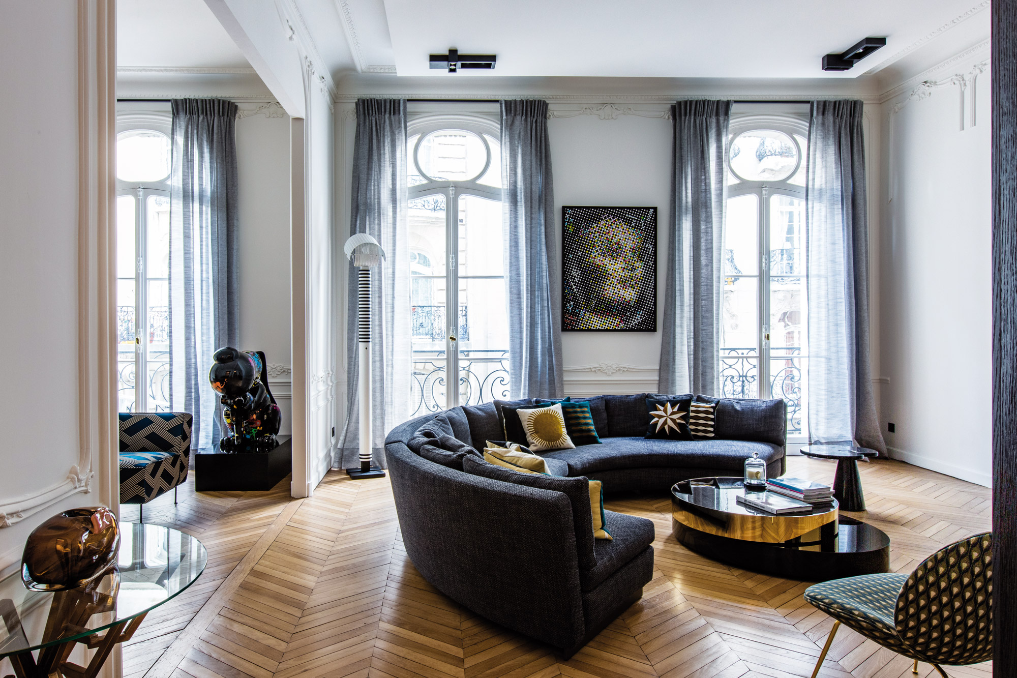 Le restaurant Lazare d’Éric Frechon, gare Saint-Lazare à Paris, le restaurant et boulangerie Le Vrai à Milan, la boutique Fou de Pâtisserie à Paris, c’est elle ! Karine Lewkowicz a signé quelques jolis lieux gourmands, mais pas seulement… L’architecte d’intérieur parisienne s’illustre également dans le domaine résidentiel, et a pensé de nombreux intérieurs privés sublimes. L’une de ses dernières réalisations, le projet Beauséjour à La Muette à Paris, conçu en collaboration avec l’architecte d’intérieur Aline Abramczyk, confirme le talent de cette créative dynamique ! Livré il y a moins d’un an, cet appartement de 230 m2, au deuxième étage d’un immeuble haussmannien, était, avant sa rénovation, plutôt vétuste, et encombré par une enfilade de petites pièces sombres… « Il était cependant intéressant de conserver certains éléments, comme le parquet et les moulures d’origine, se souvient Karine. Et d’exploiter au mieux les belles hauteurs sous plafond. » Afin de répondre à la demande des propriétaires, qui souhaitaient une grande suite parentale, deux autres chambres, avec chacune une salle de bains, et d’importants espaces de réception, les pièces ont été largement ouvertes, les volumes ont été répartis de manière cohérente et des perspectives sont nées. Cette perception de grandeur, elle se dessine dès l’entrée. De part et d’autre du couloir central, très ouvert, apparaissent les pièces de vie désormais très lumineuses : les salons d’un côté, la salle à manger et la cuisine de l’autre. Avec une pièce forte et théâtrale : une verrière rythmée par des courbes de bois noir dont le dessin et les arrondis évoquent les contours de la fenêtre du salon opposé ! « Pour la décoration, nous sommes parties d’une page blanche, raconte Karine. La propriétaire s’était séparée de tout son mobilier, et elle avait envie que l’on bâtisse ensemble son projet décoratif. Ainsi, nous avons chiné avec elle des meubles au fur et à mesure, fréquenté des salles de ventes… » Les volumes sont peuplés de luminaires et de meubles contemporains, mais aussi de mobilier des années 1950, 1960, 1970… Un joyeux mélange que l’architecte a su gérer pour apporter une vraie cohérence au projet. Ainsi, dans le grand salon, figurent notamment le canapé Seymour et la table basse Benson de Rodolfo Dordoni (Minotti), des luminaires Kreon au plafond, deux fauteuils Gubi, le lampadaire Shogun noir et blanc de Mario Botta et un guéridon de Mangiarotti. Le petit salon marie banquette (tissu Dedar) et une table basse Gubi, fauteuils des fifties de la galerie Alexandre Guillemain et suspension Vibia. Quant à la salle à manger, elle abrite, avec justesse, la table Nassau de PH Collection, des chaises Viccarbe (tissu Dedar), une suspension Stilnovo des années 1950, une applique dénichée chez Artcurial, une enfilade en chêne noirci provenant de la Galerie 13 Avril et une banquette sur mesure, recouverte de tissu Dedar. Jouxtant la salle à manger, la cuisine entièrement sur mesure, en bois laqué et chêne, joue la différence avec sa tonalité verte, son plan de travail en Corian et son marbre noir et blanc au veinage prononcé et peu commun ! L’achat d’œuvres d’art, spécialement pour cet appartement, a aussi été une étape majeure. Quelques belles pièces ornent désormais les murs, à l’image du tableau de JonOne dans l’entrée, de Robert Combas dans la salle à manger, de Jean Faucheur (Addict Galerie) dans le grand salon, et d’une photographie de Julia Fullerton-Batten dans la suite parentale. Particulièrement réussie, cette dernière pièce enferme la chambre, un dressing en noyer et une salle de bains magnifique, pourvue de carreaux de zellige et de pierre grise et bleue, dont le sol se distingue avec ses motifs graphiques associant deux teintes. De la suite se dégage par ailleurs une impression de grandeur, renforcée par la création d’une cloison mi-hauteur entre la chambre et la pièce d’eau, qui ne perturbe pas la majesté du volume. Ces intérieurs, assez simples en apparence, cachent en réalité une multitude de détails soignés, et la décoration sur mesure et raffinée confère une vraie personnalité à l’habitation.
