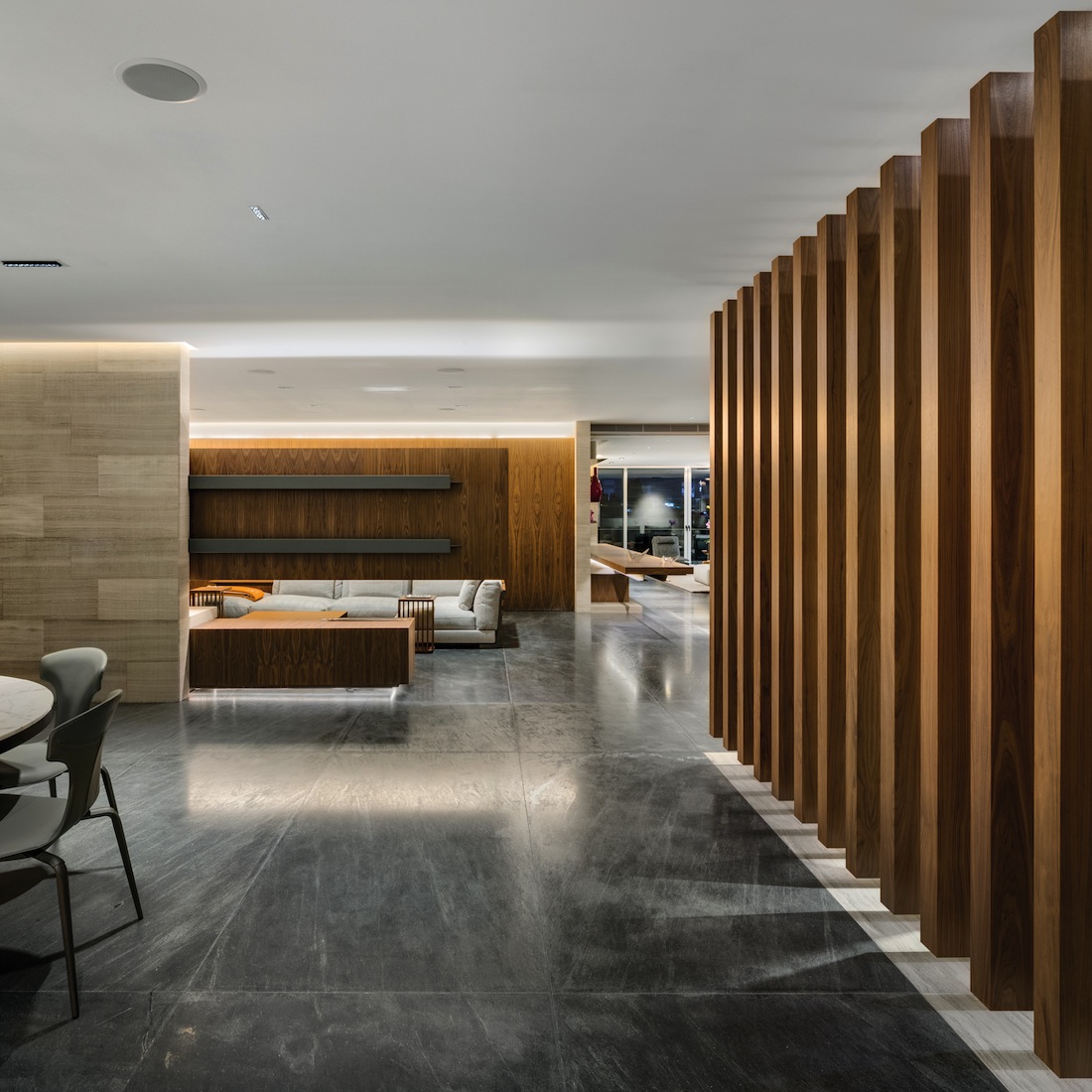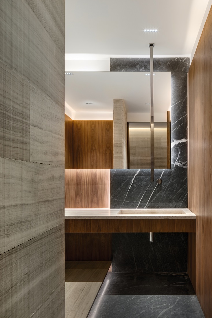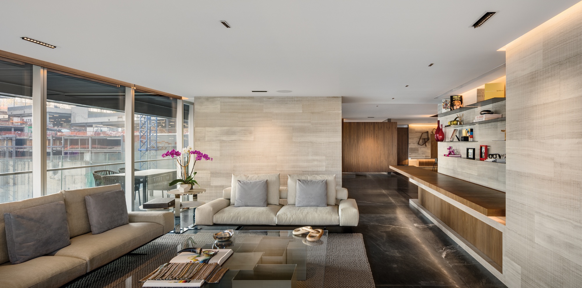 Les volumes sont recouverts au sol et sur certains murs de marbre précieux, et les espaces sont simplement marqués par des parois de bois noble. Avec quelques effets de matières, du marbre rainuré notamment, qui créent un jeu d’ombres et de lumières ajoutant du caractère et du rythme au lieu. Si le volume principal demeure complète- ment ouvert, certaines zones peuvent être intimisées par des portes coulissantes en bois à la légèreté apparente. La cuisine, quant à elle, est partiellement cloisonnée par d’imposants claustras de bois. De cet appartement aux tonalités neutres émane une remarquable unité. Notamment grâce au choix des matériaux, à celui d’un éclairage subtil et parfait, et à la belle sélection de mobilier. Si Archetonic a imaginé beaucoup de meubles sur mesure, la pièce à vivre compte de nombreuses créations de l’éditeur italien Flexform, reconnu pour ses meubles aux lignes sobres et distinguées et à la beauté intemporelle. Ainsi se côtoient ici de belles pièces de la marque : une composition d’angle du système de sièges Cestone de Antonio Citterio, aux dossiers et accoudoirs en cuir de sellerie tressé, une table basse Groundpiece de Antonio Citterio, recouverte elle aussi de cuir de sellerie, des tables basses Vienna (design Flexform) ; dans le second salon, les canapés Wing de Antonio Citterio sont accompagnés d’un fauteuil A.B.C.D. du même designer. L’ensemble se veut très harmonieux, chaleureux, confortable et d’un raffinement extrême.