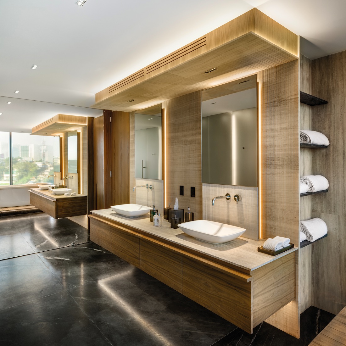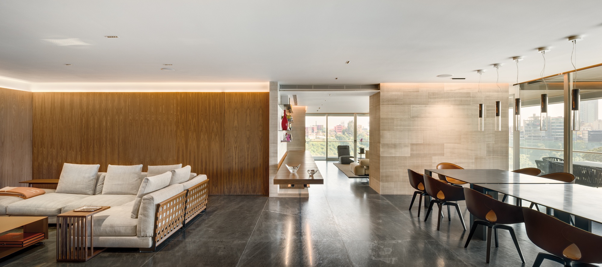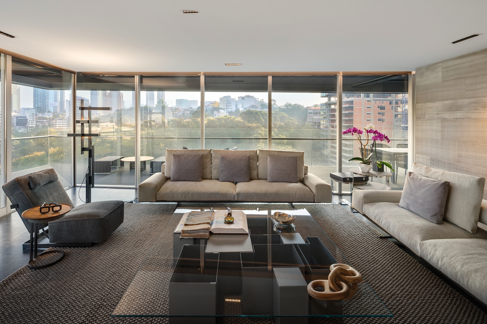 Depuis plus de trente ans, l’agence d’architecture Archetonic basée à Mexico City, et dirigée par Jacobo Micha Mizrahi et Jaime Micha Balas, multiplie les projets d’envergure – résidentiels, commerciaux, culturels, etc. – à travers le pays et au-delà de ses frontières. Pour l’appartement GVLE, étalé sur 470 m2 dominant Mexico City, les architectes ont puisé leur première inspiration dans l’environnement du bâtiment, la nature. Un cadre qui se dévoile tout au long du projet grâce à l’omniprésence de parois vitrées donnant sur une longue terrasse courant autour de l’appartement. Pour les intérieurs, place est faite à la sobriété, pour ne pas perturber la mise en valeur de cette relation constante entre le dedans et le dehors.