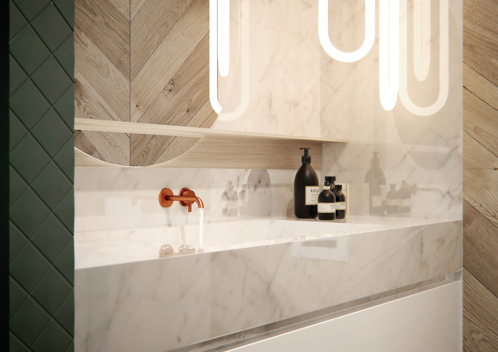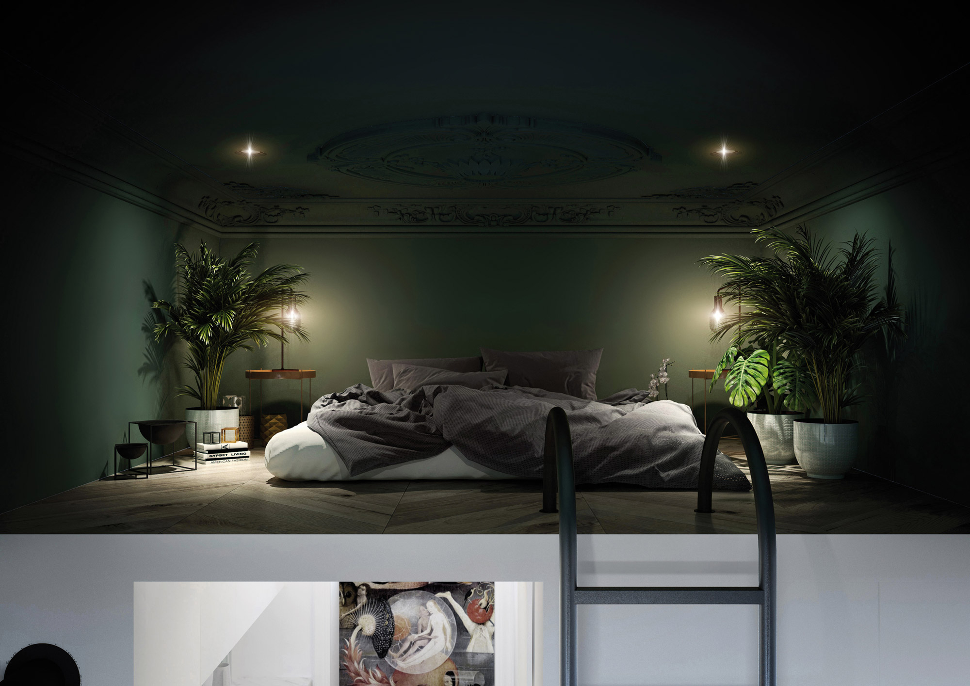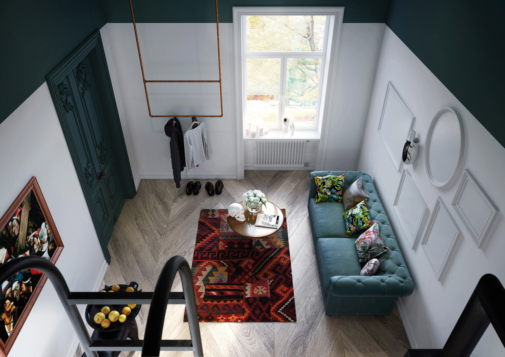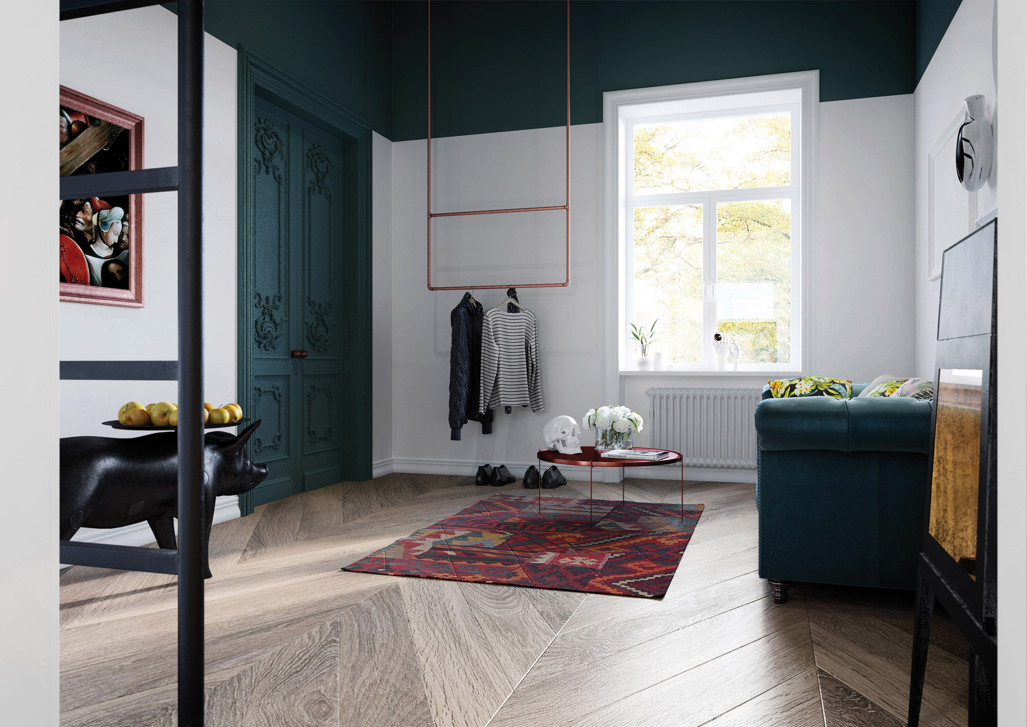 Animé par un mysticisme pénitent, peignant une humanité vouée à l’échec et à l’amoralité, Bosch est ce que l’on pourrait appeler, un peintre d’opinions. Au XVe siècle, il offrait alors une vision nouvelle et radicale de l’esprit de l’époque, plus enclin à célébrer sans équivoque le christianisme. Si le sujet était pris à contre-pied, les couleurs utilisées par Jérôme Bosch étaient, elles aussi, franches et sans compromis. Cette honnêteté visuelle servira d’inspiration à la jeune décoratrice qui a structuré ce petit espace en faisant un méticuleux usage des couleurs et des matériaux. On y trouve d’abord du blanc qui domine le périmètre, lui offrant au passage une sublime luminosité, probe, sereine. Au sol, un parquet de chêne clair continue d’apporter à la pièce une clarté douce et chaleureuse. Ce sera alors à la mezzanine, qui abrite la petite chambre circonscrite dans un cube bleu canard, de rompre le silence mystique de l’opalin, puis au tour de la pièce d’eau, avec sa céramique vert sapin, de trancher à nouveau dans l’impavide fraîcheur de l’appartement. Loin du choix hasardeux, les couleurs embrassées rappellent les tableaux (Le Christ portant la croix et détails du tableau Le Jardin des délices) de Bosch présents dans l’appartement. Des verts et bleus, profonds et froids, que la richesse des matériaux choisis vient contrecarrer sans pudeur. Une savoureuse sélection de mobilier – une porcelaine murale de Fos Ceramiche, la table Pig de Front trouvée chez Moooi, la chaise Synnes de Falke Svatun (Menu), un tapis ethnique et un crâne, vanité ultime du caractère transitoire de la vie humaine, laissé presque par hasard sur une table – vient enfin compléter le tableau de cet espace devenu cabinet de curiosités, où la vie et la mort, thèmes de prédilection de Bosch, sont évoquées dans la plus élégante des poésies.