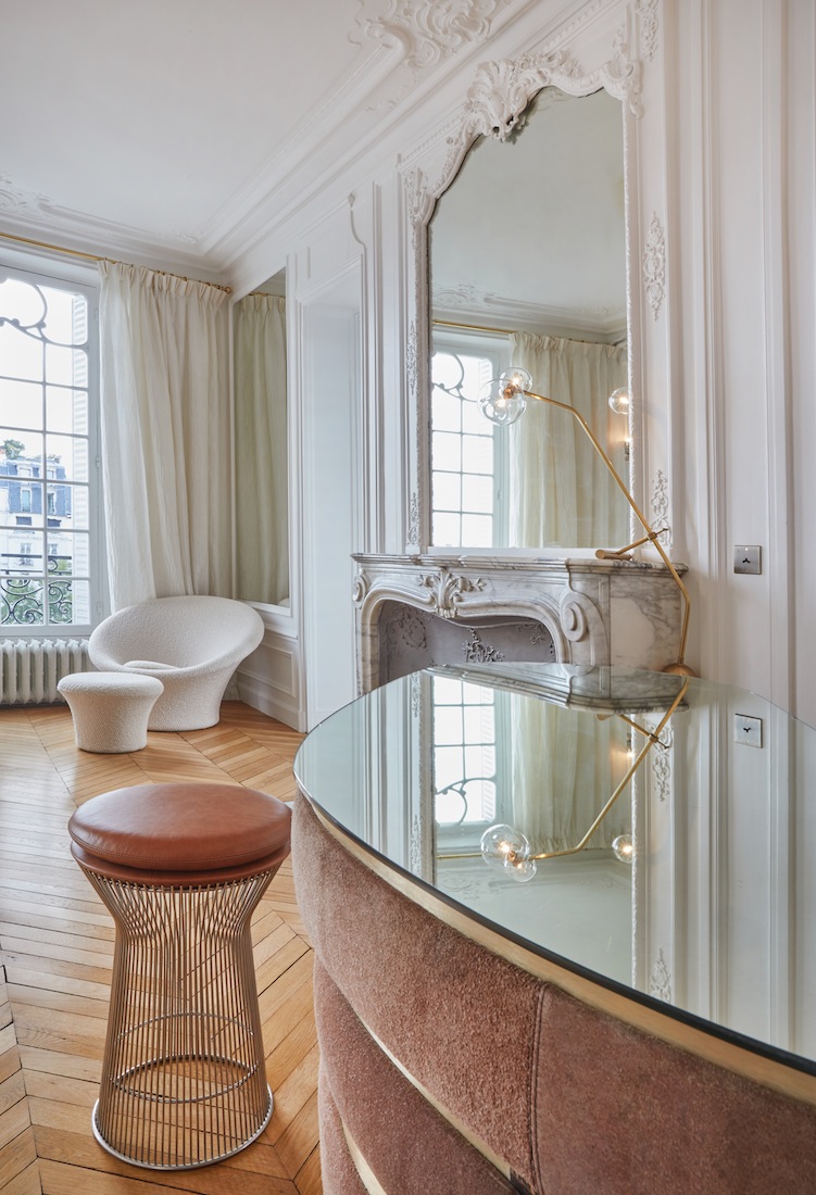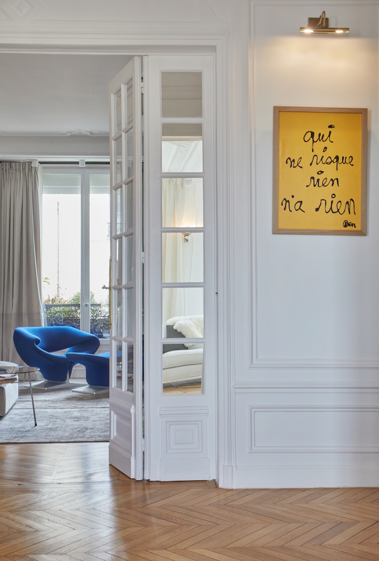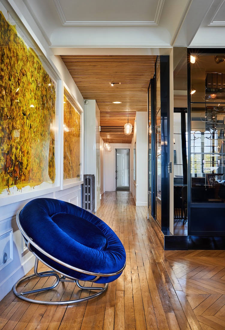 La présence d’un mobilier remarquable s’impose par ailleurs comme une constante au cœur du projet. « Nous sommes passionnés de mobilier design, et nous aimons chiner », nous confie la propriétaire… L’appartement regorge en effet de belles pièces, à l’image, dans le grand salon, des longs canapés de Vittoria Frigerio, du bar d’angle de Willy Rizzo (années 70), des tabourets de Warren Platner (Knoll, 1966), du fauteuil Mushroom de Pierre Paulin en laine bouclée (Artifort, 1960), de la table basse de l’artiste Arman, des luminaires de Schwung, etc. Dans le salon TV, un fauteuil Ribbon bleu Klein original de Pierre Paulin (1966) répond à un canapé Erba et à des appliques vintage de Gaetano Sciolari… Toutes ces créations s’allient joliment avec les nombreuses œuvres d’art contemporain, l’autre passion des propriétaires, créées par des artistes illustres ou émergents.