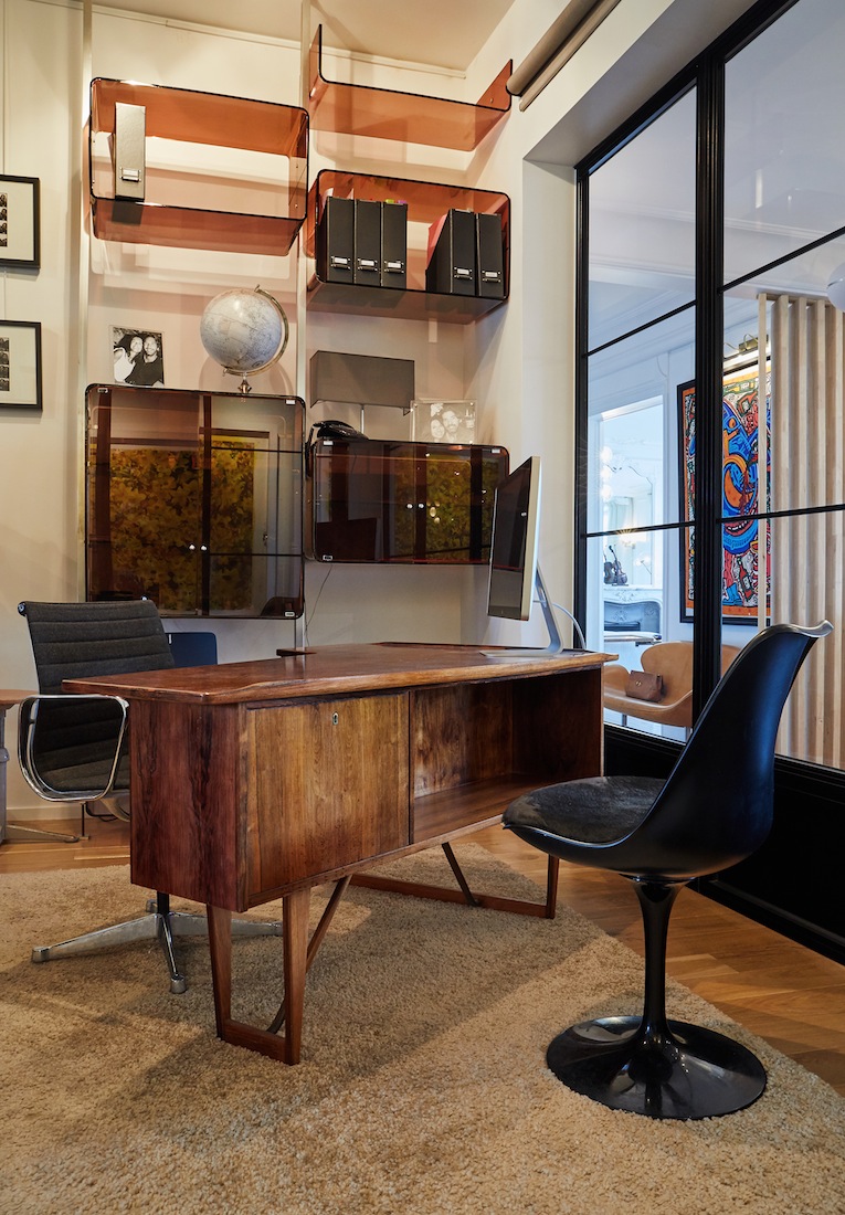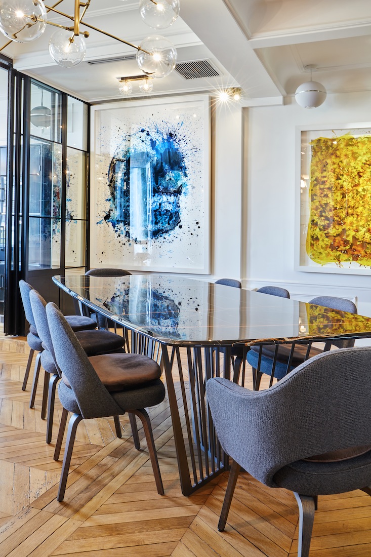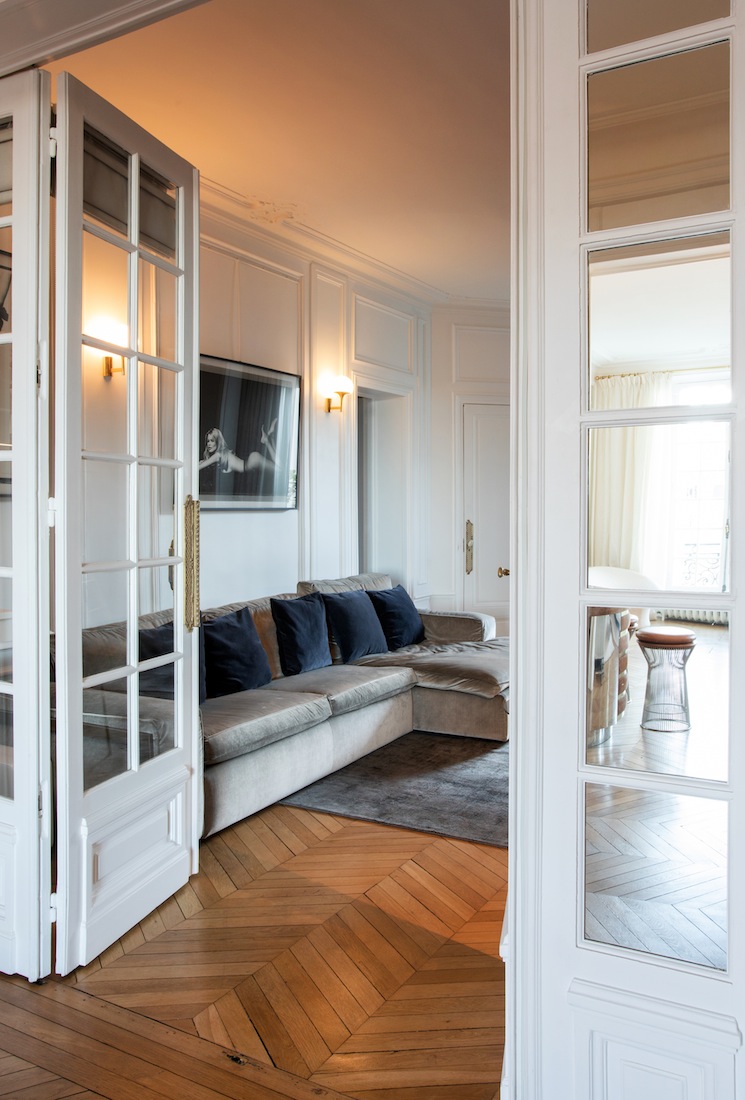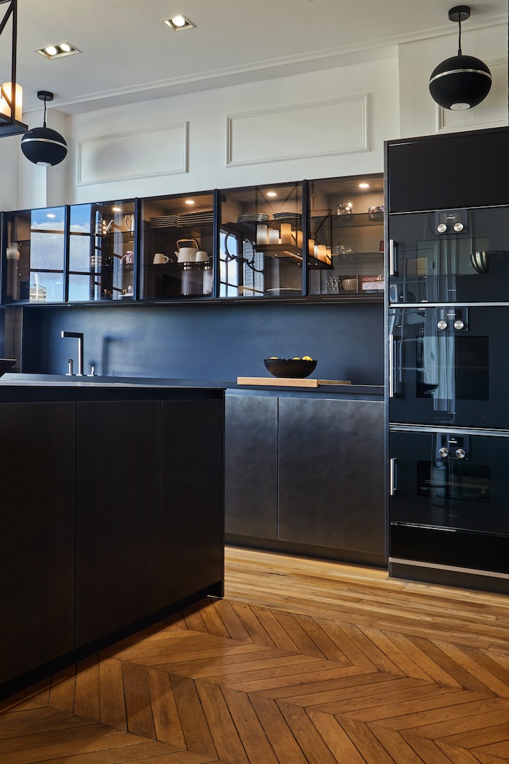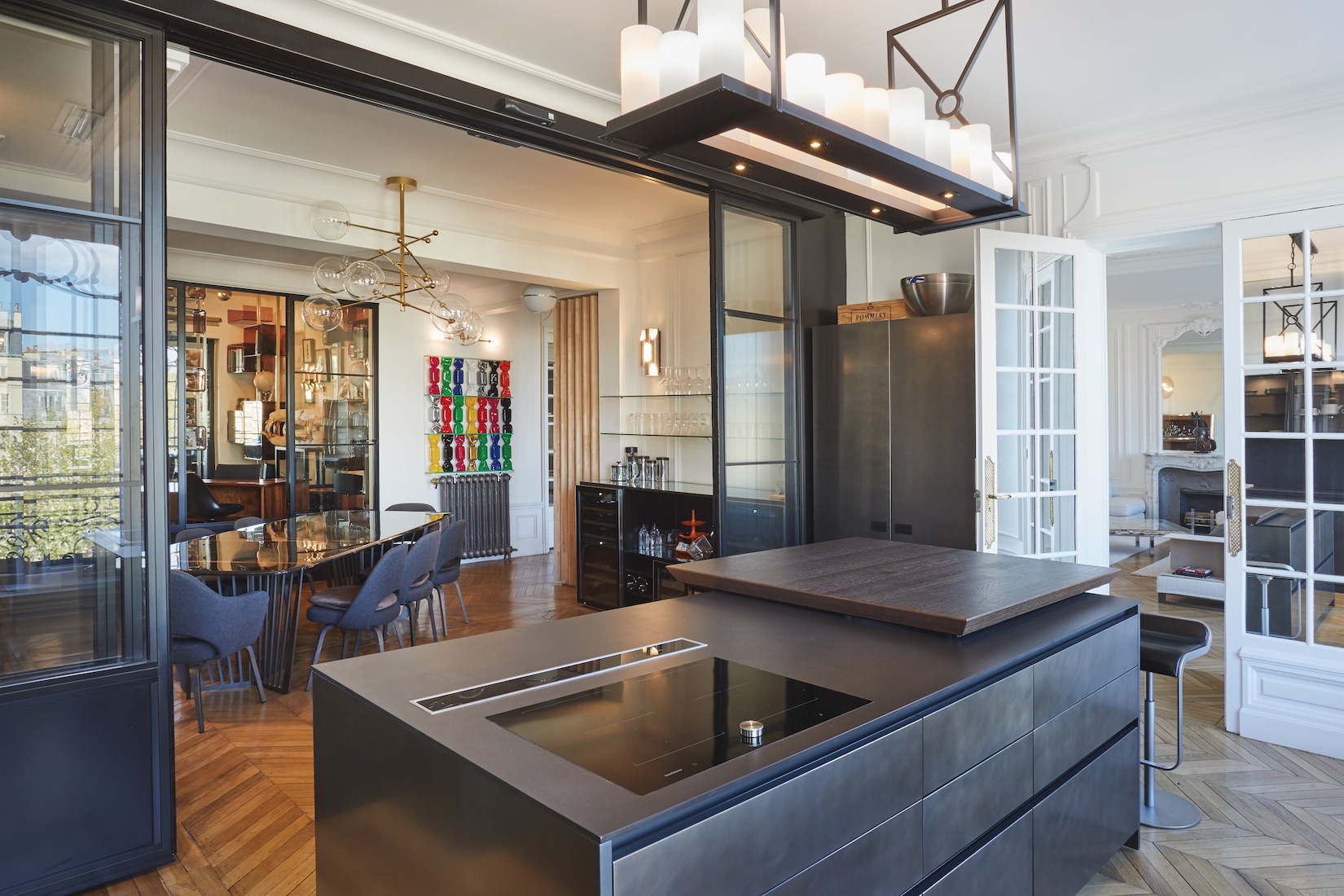 Sur les quais de Seine, l’immeuble de 1898, qui abrite cet appartement haussmannien, a fière allure… Outre la beauté de son architecture et son standing, il enferme des parties communes d’époque et de luxueuses habitations, dont ce bien fabuleux de 250 m2 habitables au 4e étage avec ascenseur, rénové il y a un an par Vivian Ronez qui a redistribué les volumes, choisi le mobilier et mis en scène les œuvres d’art. Désormais composé de trois chambres côté cour, avec une salle de bains pour chacune, il profite aujourd’hui de beaux espaces de réception très lumineux, avec des vues somptueuses sur l’Île Saint-Louis, la Seine et Paris. Il possède même une chambre de service avec vue sur les toits de Notre- Dame, ainsi qu’un garage historique dans l’immeuble voisin tout à fait inédit, avec un ascenseur pour une deuxième voiture, et une trappe menant à une cachette qui avait été réalisée durant la guerre… Véritable balcon sur la Seine, le salon principal, baigné de lumière naturelle, offre des volumes généreux, de larges fenêtres, dont une cintrée, et affiche une esthétique grandiose, tandis qu’un autre salon TV et vidéo invite les hôtes à la détente. Muni d’une grande bibliothèque sur mesure et voisinant avec une pièce cachant une douche avec hammam en béton ciré gris, il a aussi été conçu pour pouvoir se transformer en master si besoin. La cuisine et la salle à manger ont été entièrement repensées. L’espace a été ouvert, et la salle à manger jouit désormais d’un beau volume, agrémenté d’une cave à vin, d’une cave à cigares et d’une magnifique table de repas avec un plateau en marbre noir Sahara. Elle jouxte la cuisine séparée par des menuiseries sur mesure en aluminium brossé et en verre, dont les portes automatiques peuvent aussi se fermer pour intimiser l’espace. Faite sur mesure par Euromobil, en inox avec une finition cuivre et avec un plan de travail en granit foncé, la cuisine, très élégante et équipée Gaggenau, comprend un îlot central animé par une table amovible. En face, en lieu et place d’une ancienne pièce aveugle, un bureau-atelier, fermé par le même type de menuiserie que la cuisine, se découvre à travers ses montants vitrés, et révèle ses notes vintage : un bureau de Svend Aage Madsen (1960), une bibliothèque modulable en plexi de Michel Ducaroy (Ligne Roset) très seventies, une chaise de bureau Eames, etc.
