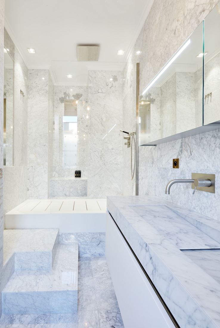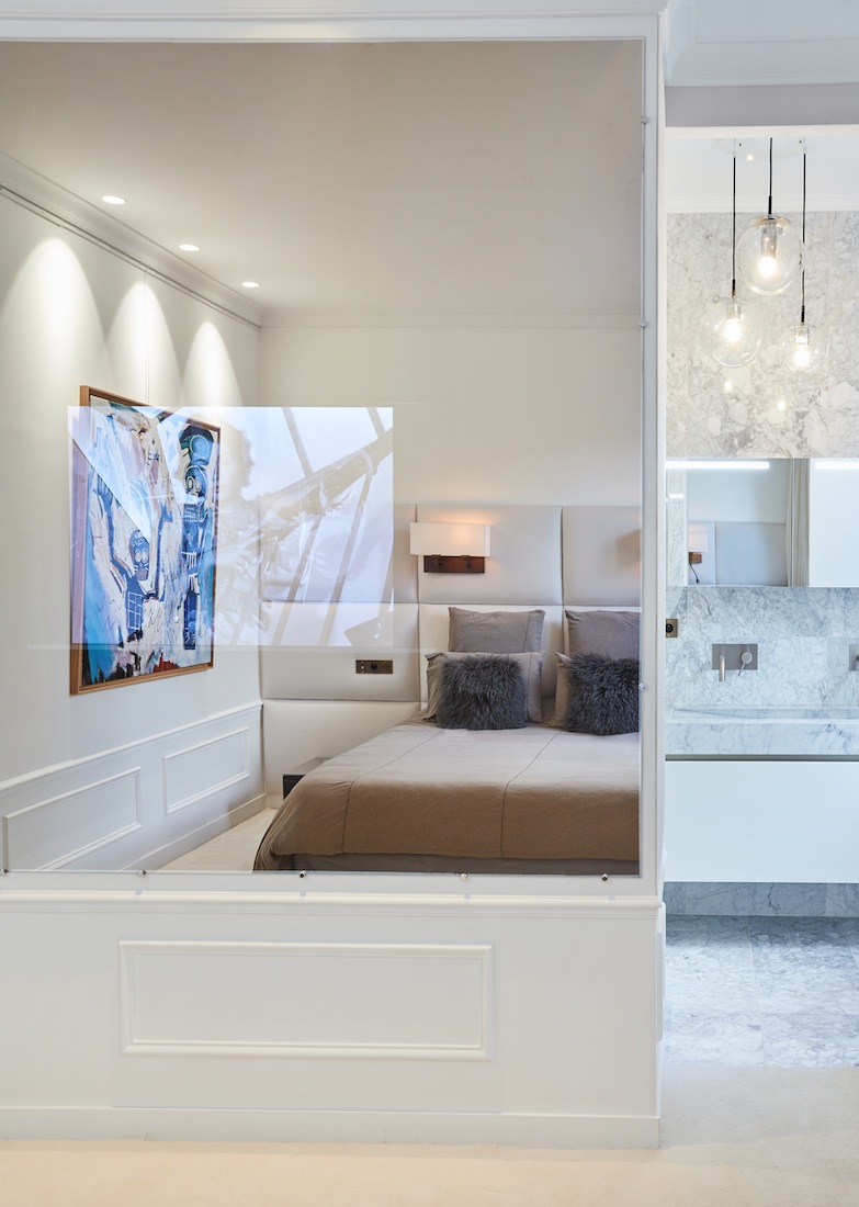 Elles confèrent une personnalité forte à chaque espace, les transcendent même. Jusque dans la master bedroom, avec dressing laqué et verre et une salle de bains en marbre. Parmi, les œuvres sélectionnées, des tableaux de Philippe Pasqua, de Robert Combas, de Ben, de Jérémy Douay, une pièce unique de Laurence Jenkell, un violon d’Arman bleu Klein, des photographies de Claudia Schiffer et Karen Mulder signées Marc Hispard, etc. L’ensemble brille par sa cohérence et son raffinement ! Et les amateurs de ce genre d’habitation d’exception pourront même l’acquérir, car il est aussi proposé à la vente.
