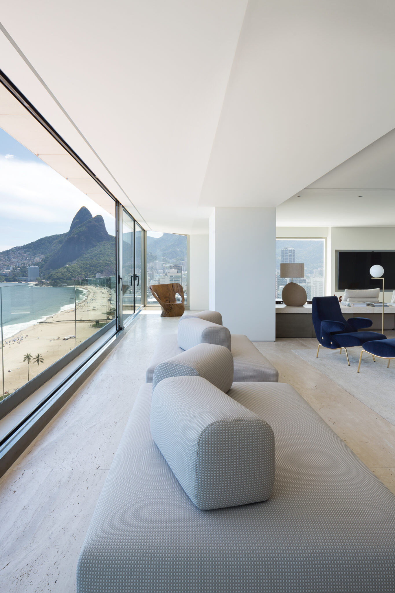 Si chacune de ses réalisations demeure résolument unique, l’architecte y laisse son empreinte… Rare et précieuse. Adepte des « espaces purs, grands et très transparents », il accorde une place prépondérante à l’indispensable lumière dans ses projets. Il aime jouer avec la modularité des volumes, les magnifier avec son mobilier et des pièces d’auteurs, trouver le juste équilibre entre luxe et minimalisme. L’homme, passionné depuis son enfance par l’architecture, est un véritable esthète en quête perpétuelle de l’excellence… Son nouveau projet à Rio de Janeiro, l’appartement RS, illustre ces précédents propos. Avouons que le cadre est idyllique et qu’il participe largement à la réussite de l’ensemble ! L’appartement de 520 m2 profite d’une vue à 360 degrés sur la plage paradisiaque d’Ipanema, mythique à Rio de Janeiro. Et l’architecte a fait en sorte que les propriétaires jouissent au maximum de ce cadre d’exception.
