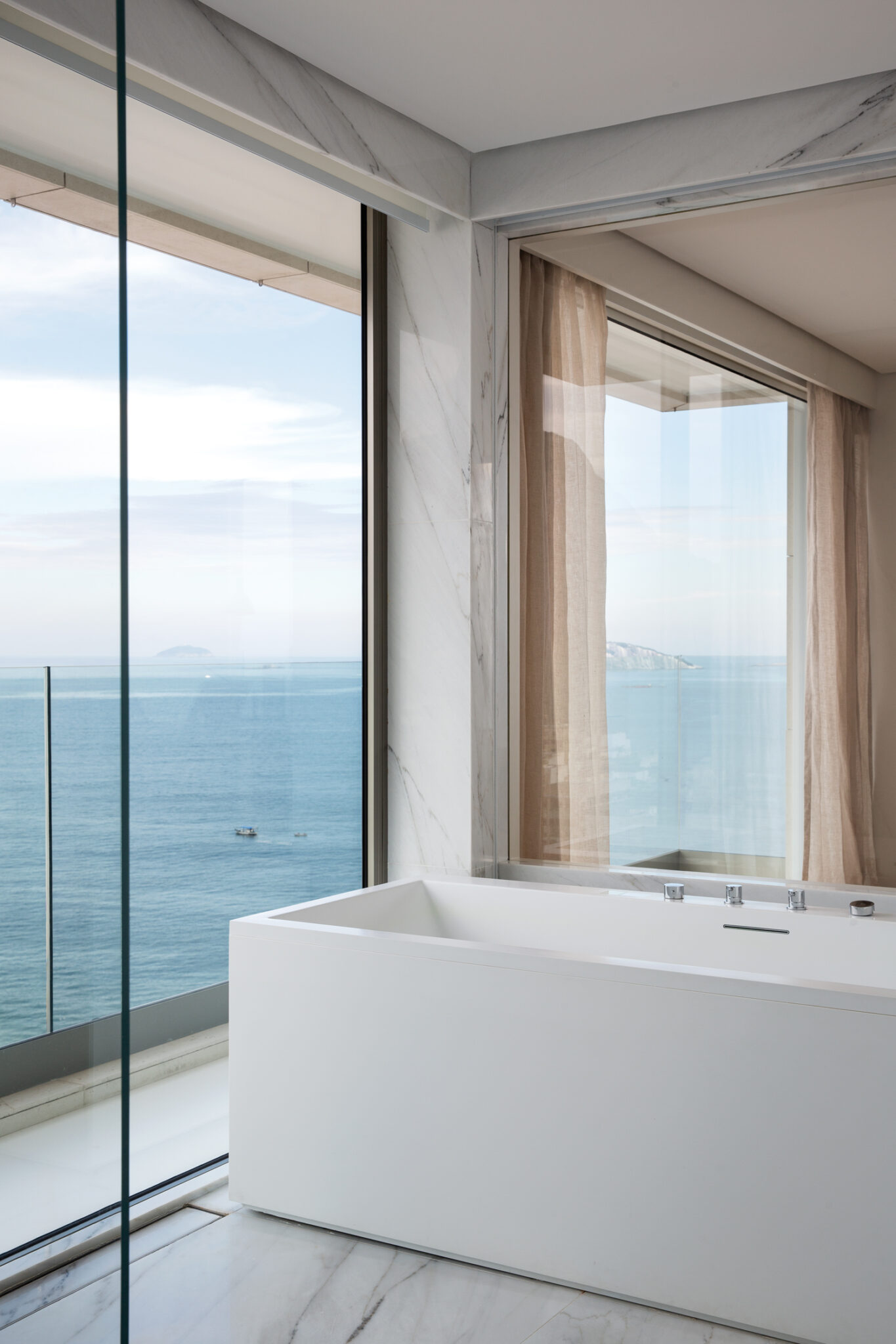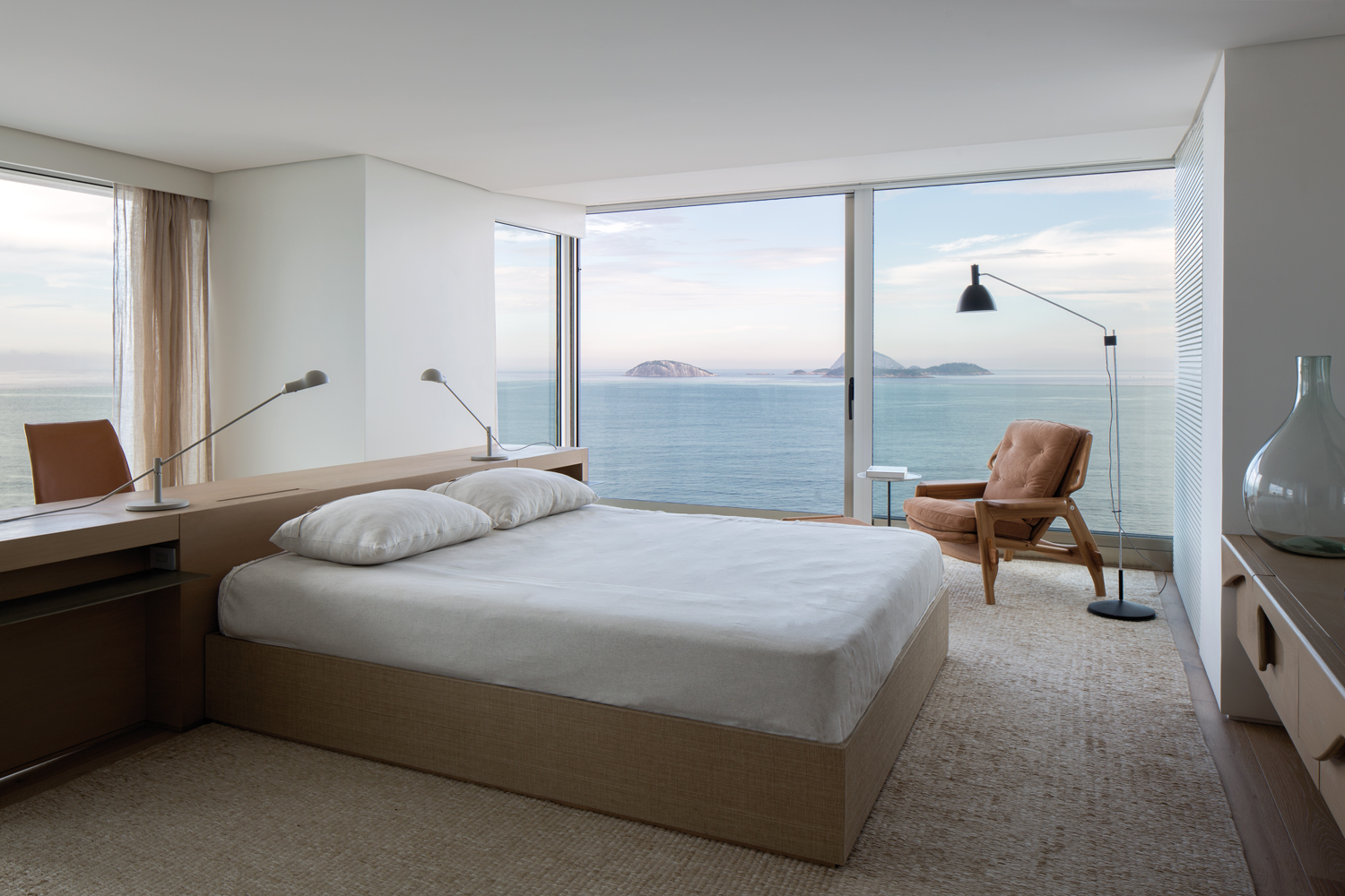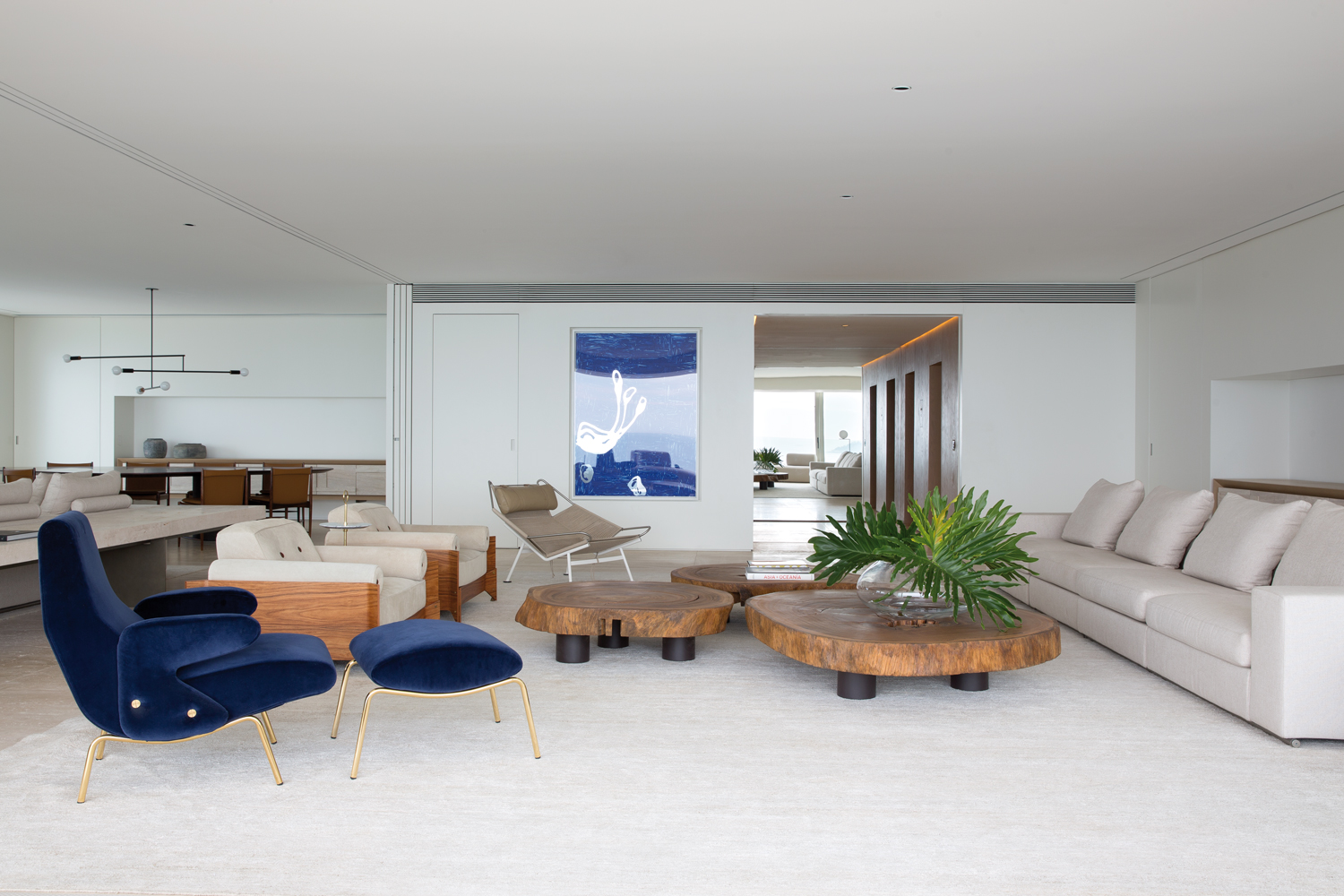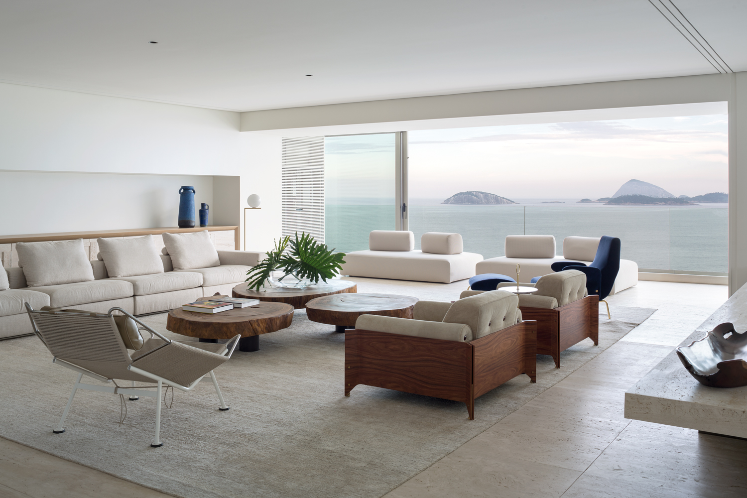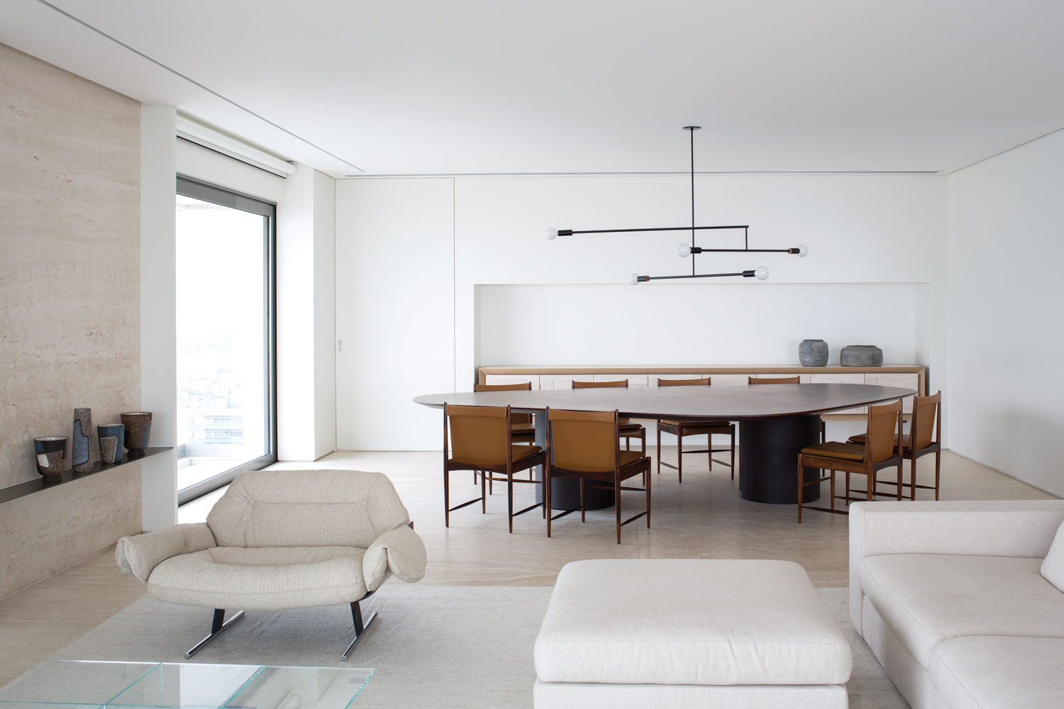 Pour leur résidence secondaire, ces derniers souhaitaient que l’espace soit imaginé, certes pour leurs propres séjours, mais aussi pour pouvoir recevoir confortablement leurs amis. Arthur Casas a conçu le plan de l’appartement – pourvu de cinq suites, d’un salon/salle à manger et d’une zone de service – de manière à ce que les chambres, réchauffées par du chêne clair, épousent les façades de l’immeuble pour offrir des vues à couper le souffle. De même, l’immense pièce de vie embrasse littéralement le panorama. L’autre idée était de pouvoir intimiser certaines zones. Aussi, les espaces du salon et de la suite parentale peuvent être divisés grâce à la mise en place de portes coulissantes discrètes qui ferment ces pièces aux proportions généreuses. Si l’esthétique minimaliste, chère au créateur brésilien, règne ici, les intérieurs, plutôt conviviaux et chaleureux, sont réchauffés par une sélection pointue de meubles, issus d’éditeurs nationaux et internationaux et dessinés par Arthur Casas lui-même. Pour l’appartement RS, il a esquissé la table Amorfa, l’abat-jour Belly et le buffet Willys dans la pièce à vivre. Tournée vers le paysage, cette dernière, inondée de lumière naturelle, montre des tonalités claires, du travertin Navona au sol, sur certains murs et sur le mobilier, des touches de bleu et d’autres meubles fabuleux, des années 50, 60 et d’aujourd’hui : fauteuil Flag Halyard de Hans J Wegner, fauteuils Brasiliana de Jorge Zalszupin, fauteuil Delfino de Erberto Carboni (Arflex), canapé Groundpiece de Antonio Citterio (Flexform), tables basses en bois de Tora Brasil, canapés Ribbon de Paola Lenti, fauteuil en bois Cará de Hugo França, etc. Des pièces emblématiques qui participent à l’harmonie du projet, à sa perfection, à sa beauté.
