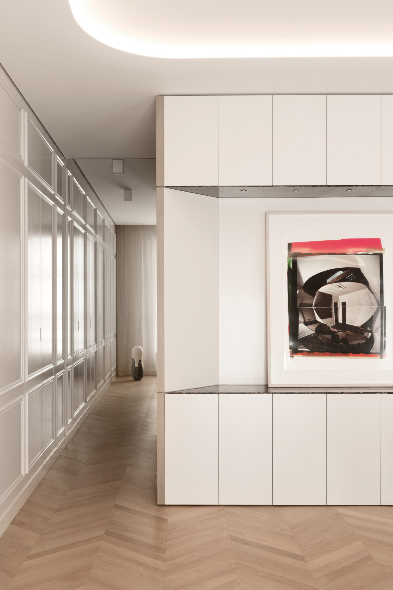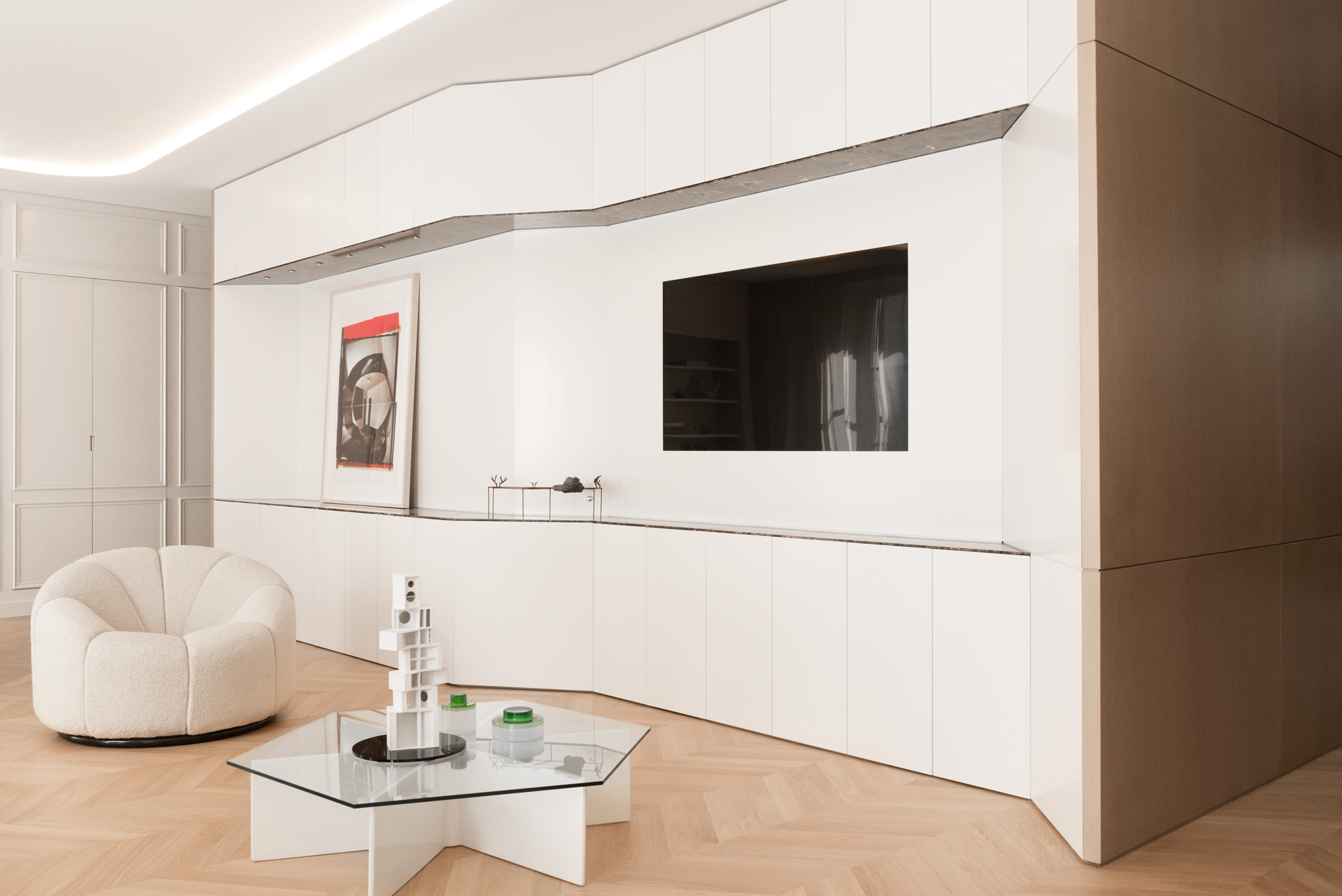 Pour l’un de ses derniers projets en date, situé rue de Lille à Paris, l’architecte d’intérieur Ramy Fischler a fait comme il fait toujours : il s’est dépouillé de tous ses projets antérieurs pour appréhender, vierge, l’appartement de 130 m² qu’on lui proposait de réagencer. Comme à son habitude, c’est dans la résolution des problématiques de l’espace que Ramy Fischler a entamé son analyse. Après cela, les choses sont venues lentement, naturellement. Car Ramy Fischler aime prendre son temps. Le temps de comprendre, mais aussi le temps de trouver la solution qui correspondra à cet appartement et à lui seul. « Chaque projet me fait travailler avec un large nombre de corps de métiers », souligne l’architecte. Des corps de métiers qu’il aime écouter et avec lesquels il échange sur ces solutions qu’il veut apporter. Pour l’appartement de la rue de Lille, c’est l’espace qui était au coeur de l’enjeu. Un espace à redéfinir entièrement, pour mieux répondre aux modes de vie actuels. En substance, si toutes les parties « bourgeoises » de l’appartement ont été conservées, par souci d’authenticité mais aussi de beauté classique (les parquets et les moulures, etc.), le reste, tout le reste, a lui, été retiré, détruit. Les cloisonnements d’origine tombés, Ramy Fischler et sa petite équipe peuvent alors s’approprier la superficie totale du lieu, pour établir un nouveau schéma, un nouveau code, avec, au coeur de l’espace, le salon, la pièce maîtresse de nos habitations actuelles.