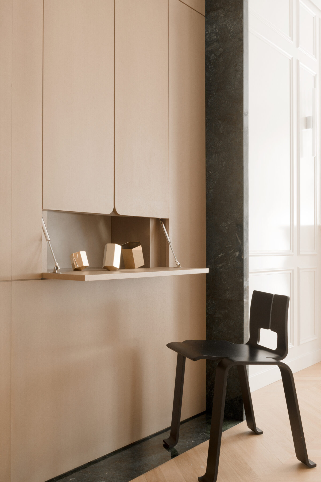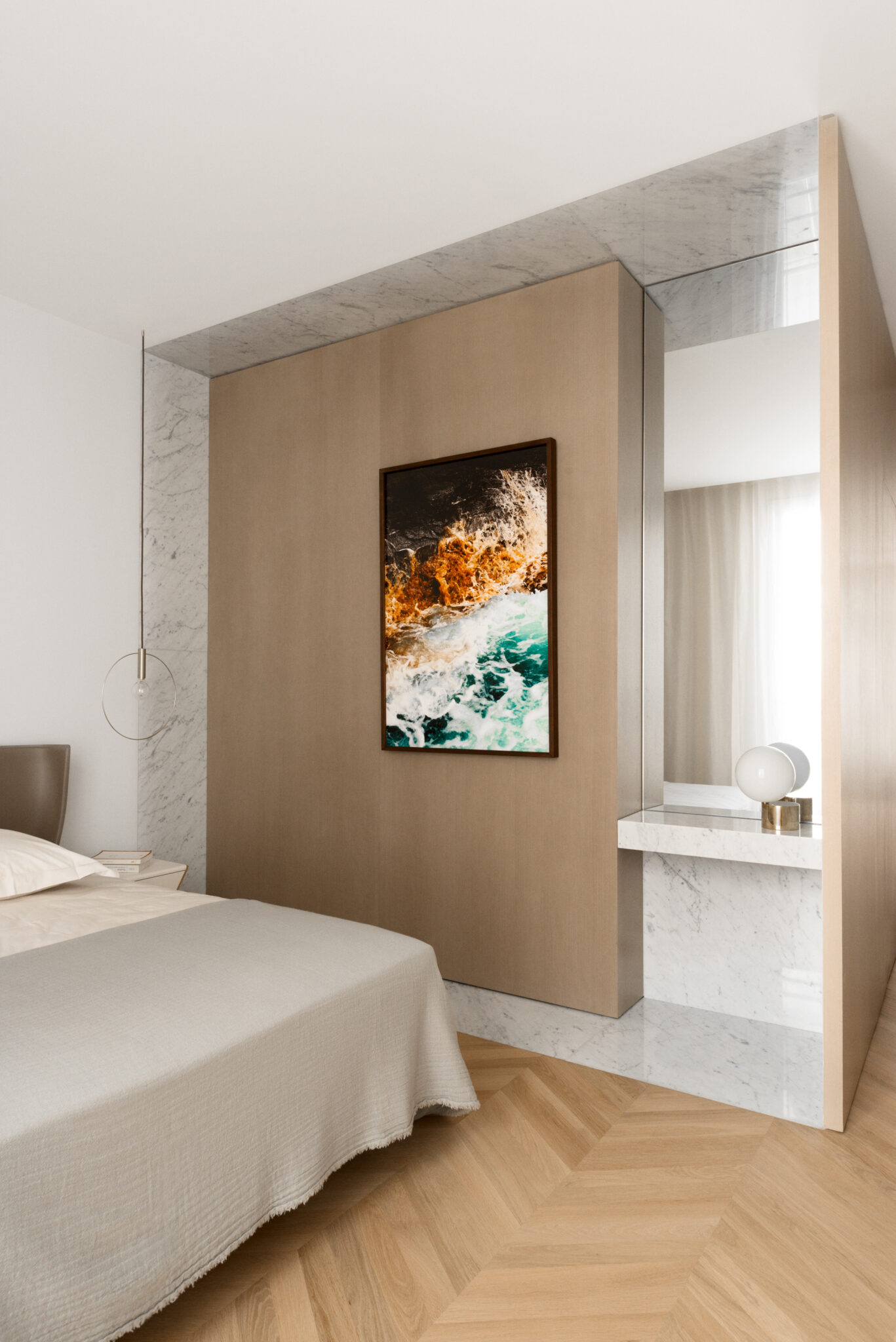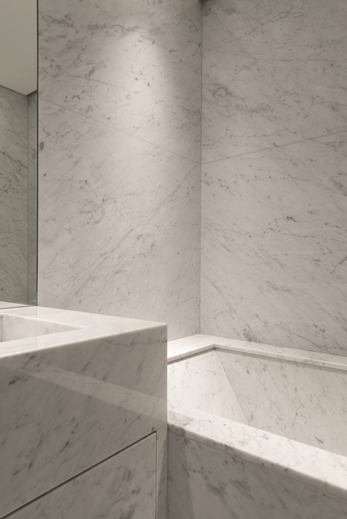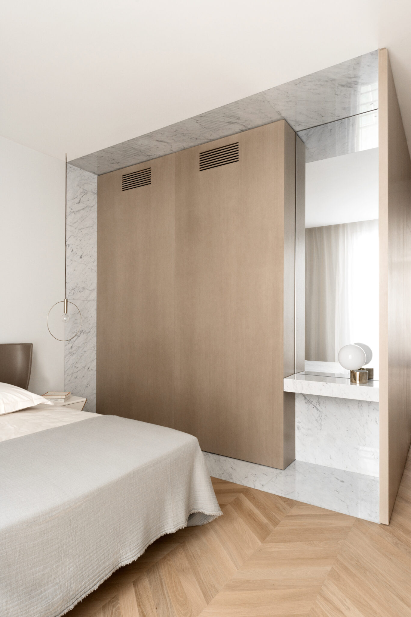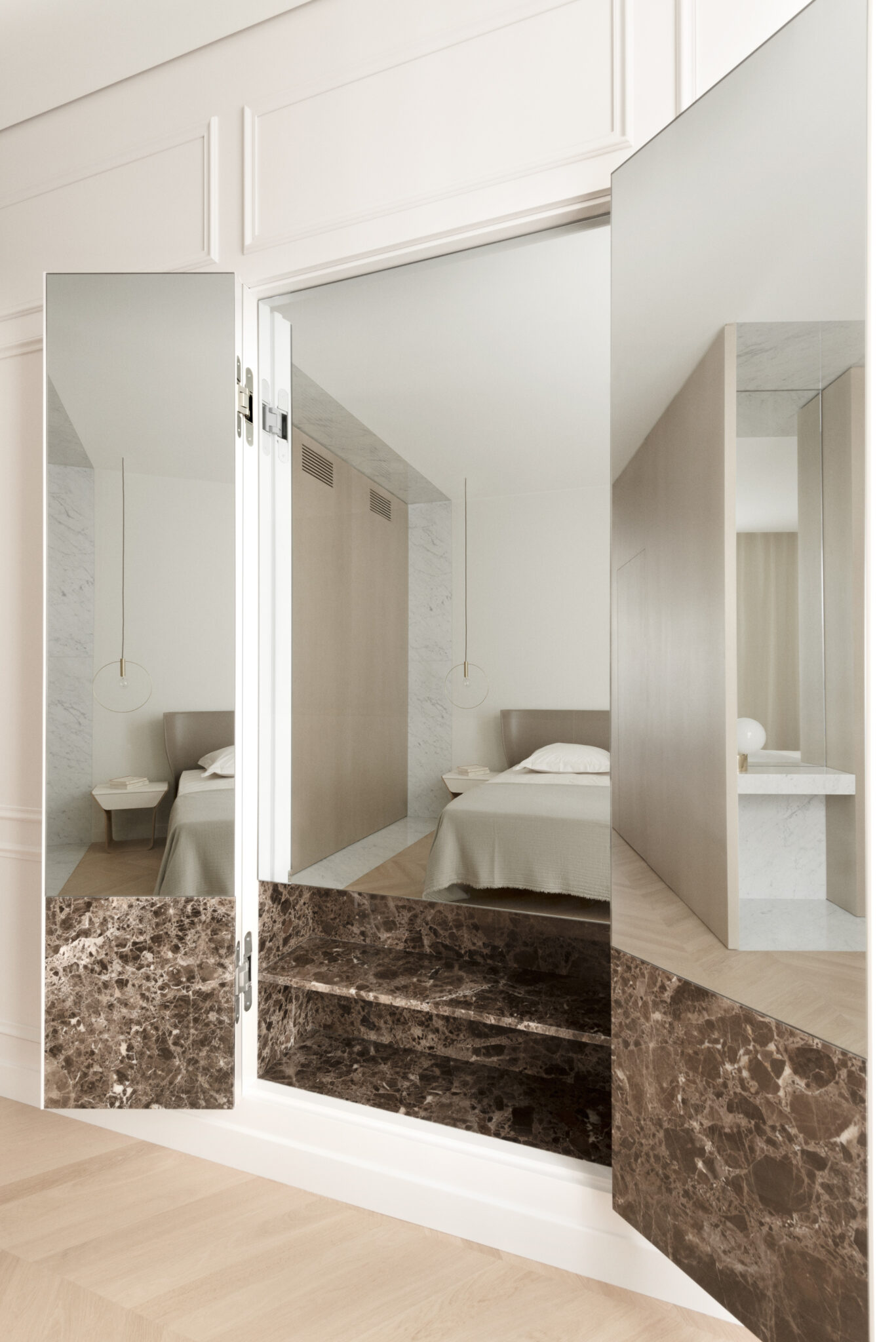posséder entièrement l’appartement. Ce sera donc aujeu de portes coulissantes de gérer en un glissement, la redistribution totale de cet appartement, créant ad libitum des espaces intimes ou pleinement ouverts. Presque narcissique, le mécanisme semble ainsi redonner les commandes de l’espace à ses propriétaires. Un mécanisme que Fischler aime décrire : « Bourgeois moderne qui aime posséder, et jouir de ce qu’il vient d’acquérir. » Pour habiller ce nouvel univers, Fischler n’a utilisé qu’une palette restreinte de matériaux : des bois et des marbres. Des matières qu’il a toutefois investies avec le plus grand des soins, en mélangeant les types, pour offrir un nuancier d’une simplicité sublimement délicate et à la fois extraordinairement riche. Mais c’est sur le rendu final que nos yeux d’apocryphes vont juger. Et comme à son habitude, la seule qu’il aime vraiment, Fischler prend le contre-pied de toutes les attentes. Plus qu’une contradiction, l’homme en a même fait sa marque de fabrique. « Je ne m’autorise jamais de refaire ce que j’ai déjà fait », martèle-t-il à plusieurs reprises. Pourtant, c’est sur la sensation du résultat que l’on retrouve la griffe Fischler. La sensation d’une mise en scène parfaitement orchestrée, une « esthétique cinématographique », précise Fischler, qui semble naturellement transcender le quotidien, ici comme sur tous ses projets. Un quotidien où toutes les commodités pragmatiques de l’espace, semblent avoir disparues. Si elles ont pourtant été le fruit des premières réflexions du travail de l’architecte, aucune n’apparaît à l’oeil nu, pour ne laisser place qu’a un ensemble d’une époustouflante cohérence. Et de dévoiler une quotidienneté sublimée, totalement transcendée.