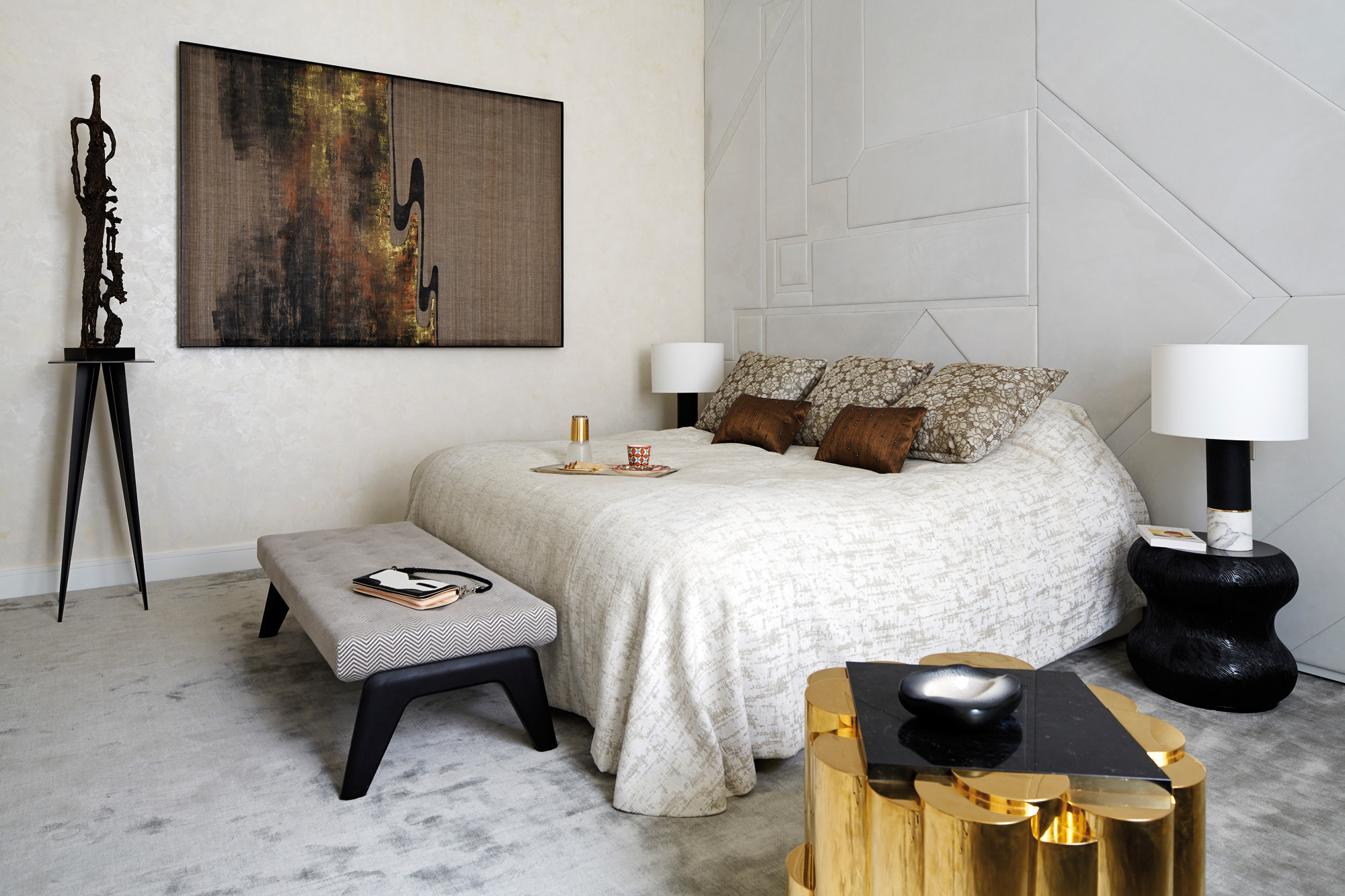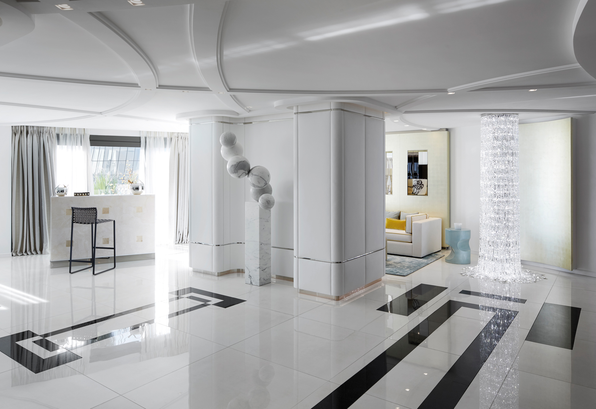N’oublions pas, non plus, sa capacité à introduire des oeuvres d’art contemporain dans les intérieurs… L’un de ses derniers projets à Cannes, un penthouse de 330 m2 donnant sur la Croisette livré cette année, n’échappe pas à ces règles. Cet appartement d’exception montre d’emblée, dans la pièce de réception, deux oeuvres monumentales qui se répondent : une sculpture de Pascal Haudressy en marbre blanc et un bonbon noir de Laurence Jenkell. « Le client souhaitait un appartement contemporain dans un esprit bord de mer, avec une atmosphère luxueuse à l’image d’un hôtel 5 étoiles », explique Stéphanie Coutas. Ici, le marbre, l’albâtre, les bois précieux et le cuir, traités de façon très moderne, ajoutent une touche supplémentaire de luxe. Tout comme cette cascade de gouttes en cristal Swarovski qui donne du rythme à l’espace. Et nous fait oublier, comme le sol graphique et l’éclairage du plafond très travaillé, le manque de hauteur de ce dernier. L’art de contourner les défauts et de les embellir… Quant aux détails, ils sont partout, à l’image des poignées en bronze martelé d’une immense porte coulissante dans un hall.