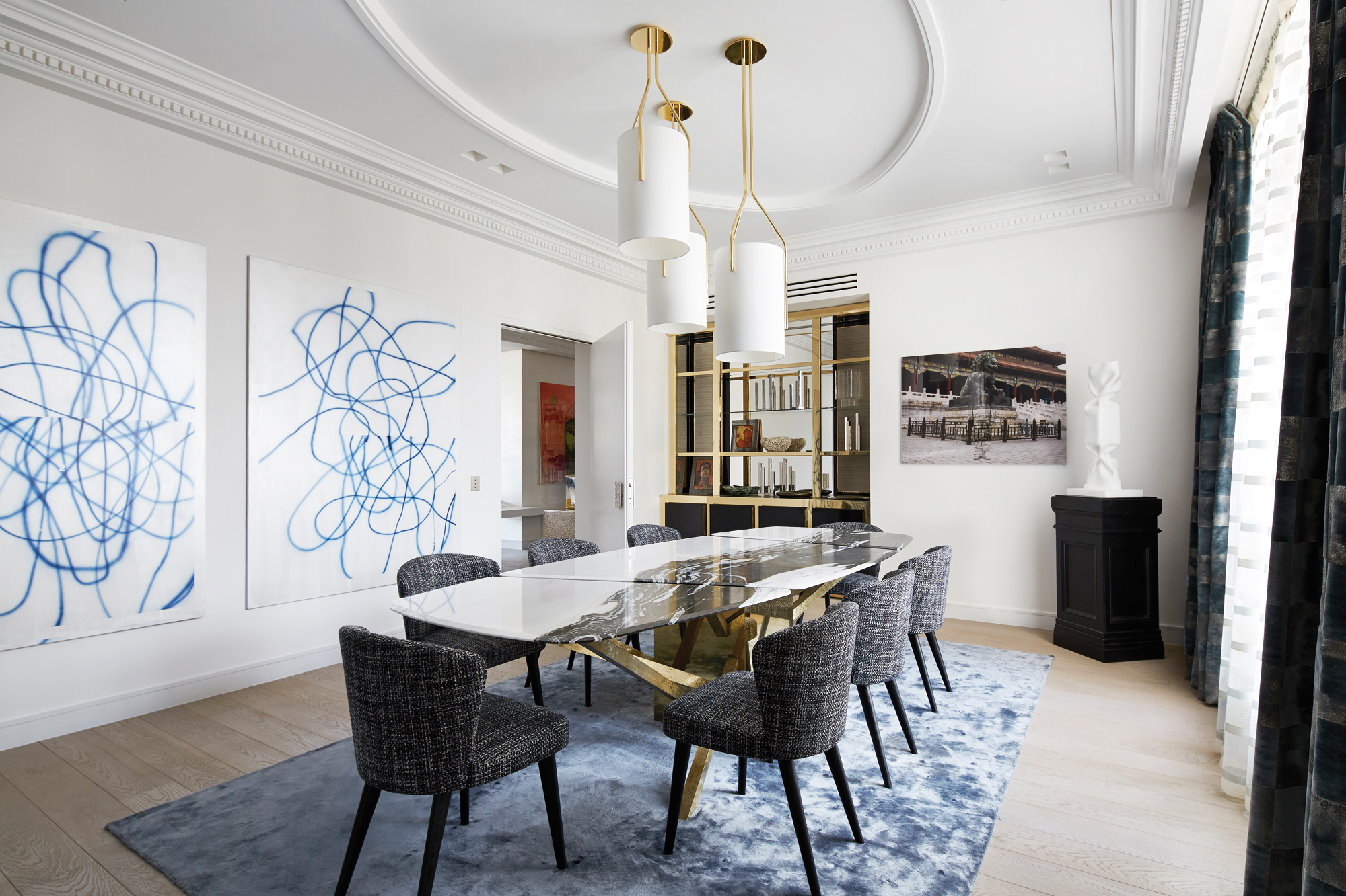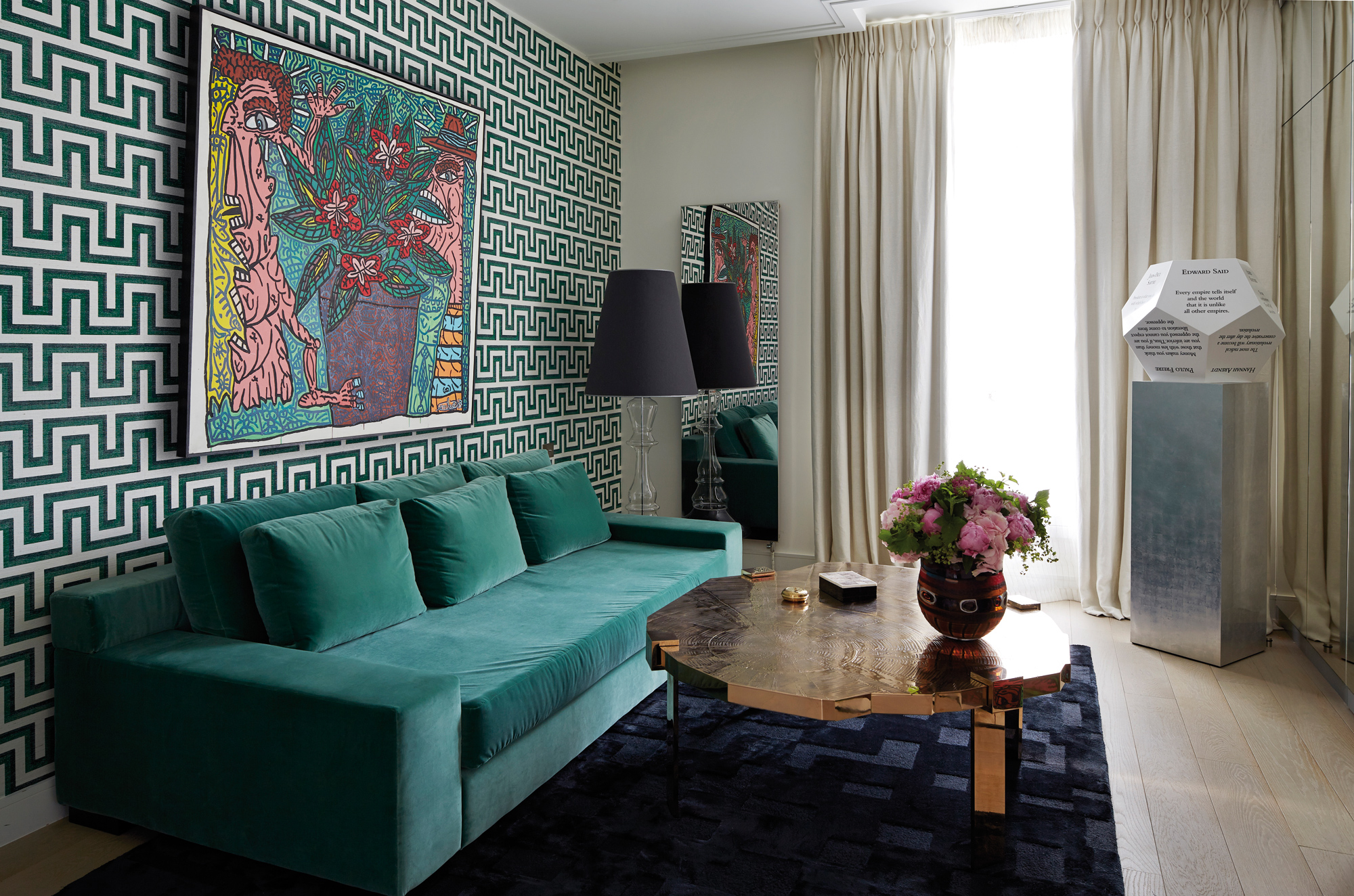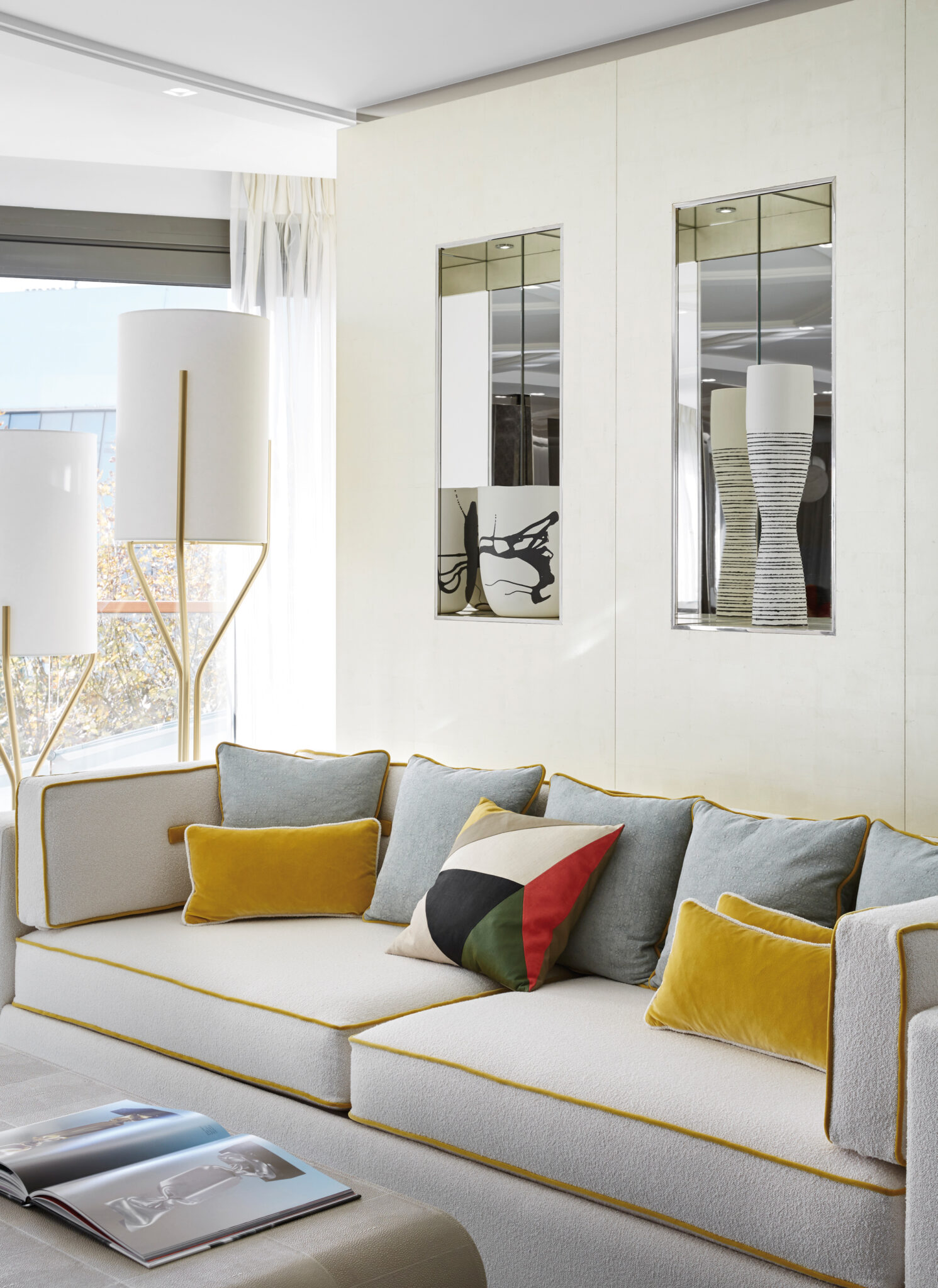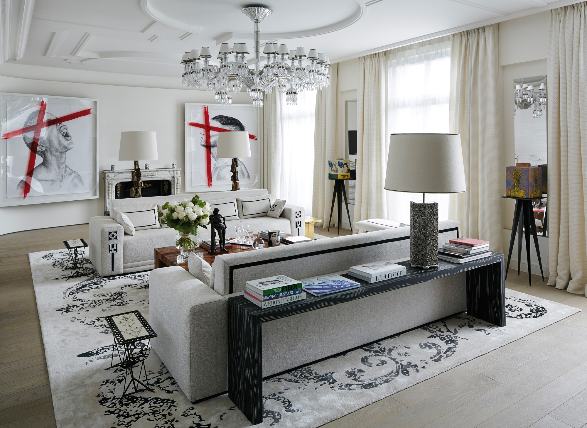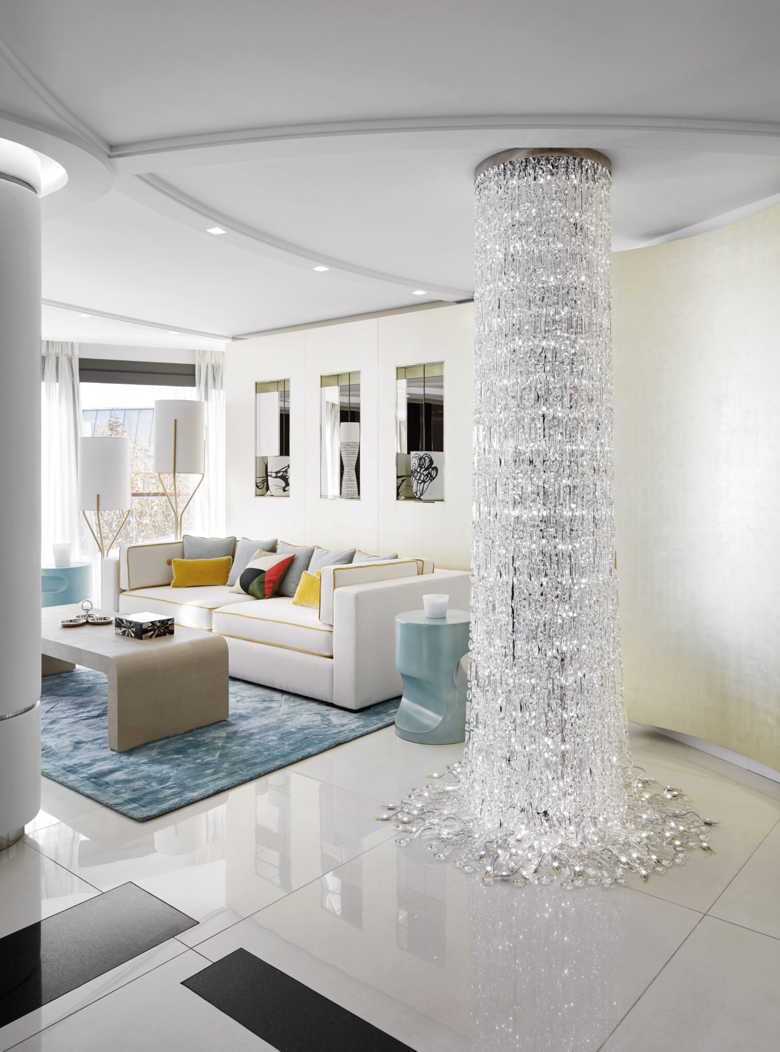 Si certains mobiliers et luminaires proviennent d’éditeurs réputés (Tom Dixon, Minotti, Molteni, Knoll, Vitra, etc.), un grand nombre de pièces a été dessiné par la décoratrice elle-même, puis achevé par de belles maisons. Oui, Stéphanie Coutas excelle aussi dans le domaine du design. « Depuis deux ans, nous avons commencé à dessiner des collections. Nous travaillons actuellement sur l’univers de la salle de bains pour THG, avec des créations que nous sortirons en 2018. Nous avions aussi dessiné un très joli lustre avec Baccarat. » Ce lustre, on peut l’admirer dans le salon de son nouvel appartement, place des Etats-Unis à Paris. Un intérieur dans lequel elle a osé confronter différents sujets avec un goût évident. Dans ce même espace, se côtoient une pièce monumentale réalisée avec Baccarat et suspendue à un plafond pensé spécialement pour l’accueillir, des canapés fabriqués par B&B Italia qu’elle a désignés, des tables d’appoint vintage des années 1950 en métal et céramique, un tapis à motifs conçu avec Tai Ping, les céramiques de Robert Combas, une sculpture d’Arik Levy, etc. Et les étonnants tableaux de l’artiste The Kid pour lequel elle a eu un « coup de foudre », et qui semblent flotter dans l’espace…