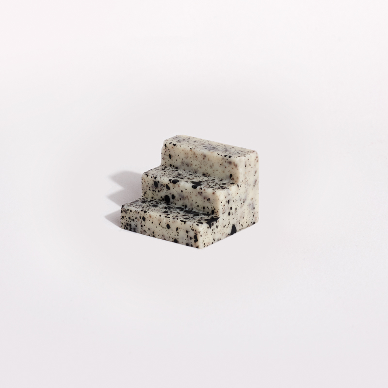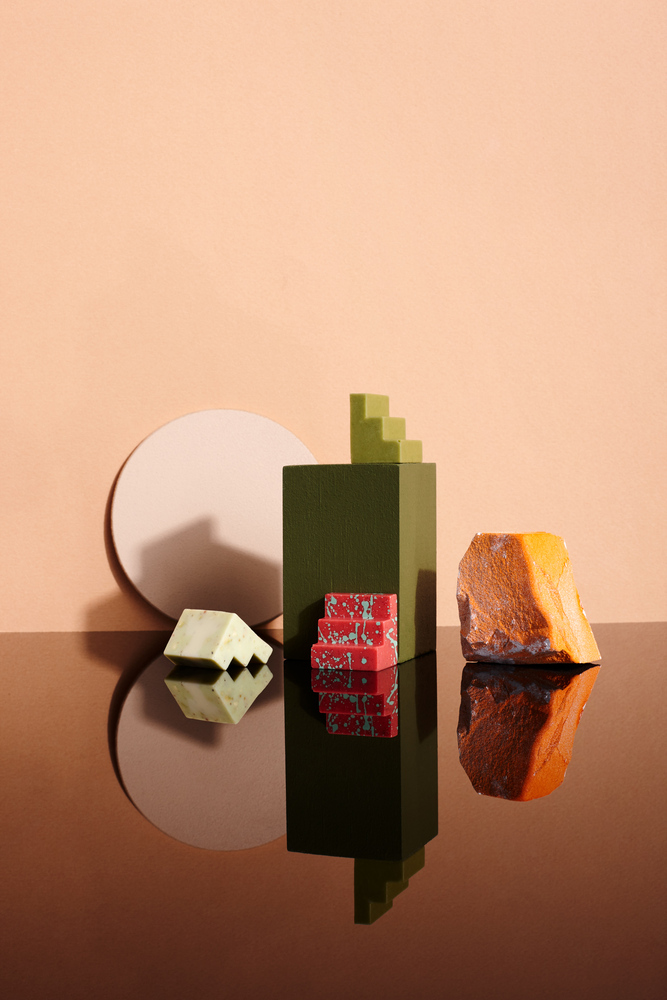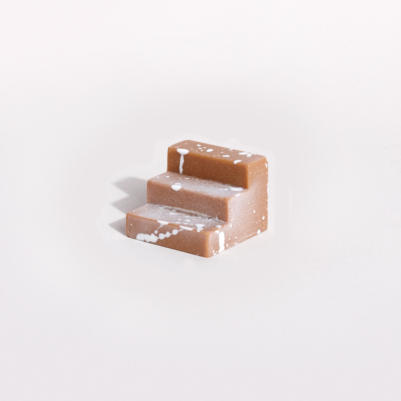 Ces formes architecturales ressemblant à un escalier, sont faites de sorte qu’une connexion s’établisse entre deux morceaux, il faut les manger ensemble, ils se complètent l’un et l’autre. On fait référence ici à la relation complémentaire entre le concepteur et son client. Les produits finaux sont donc des pavés modulaires qui s’emboitent, permettant de combiner deux saveurs (matcha, vanille, fraise,cassis…).