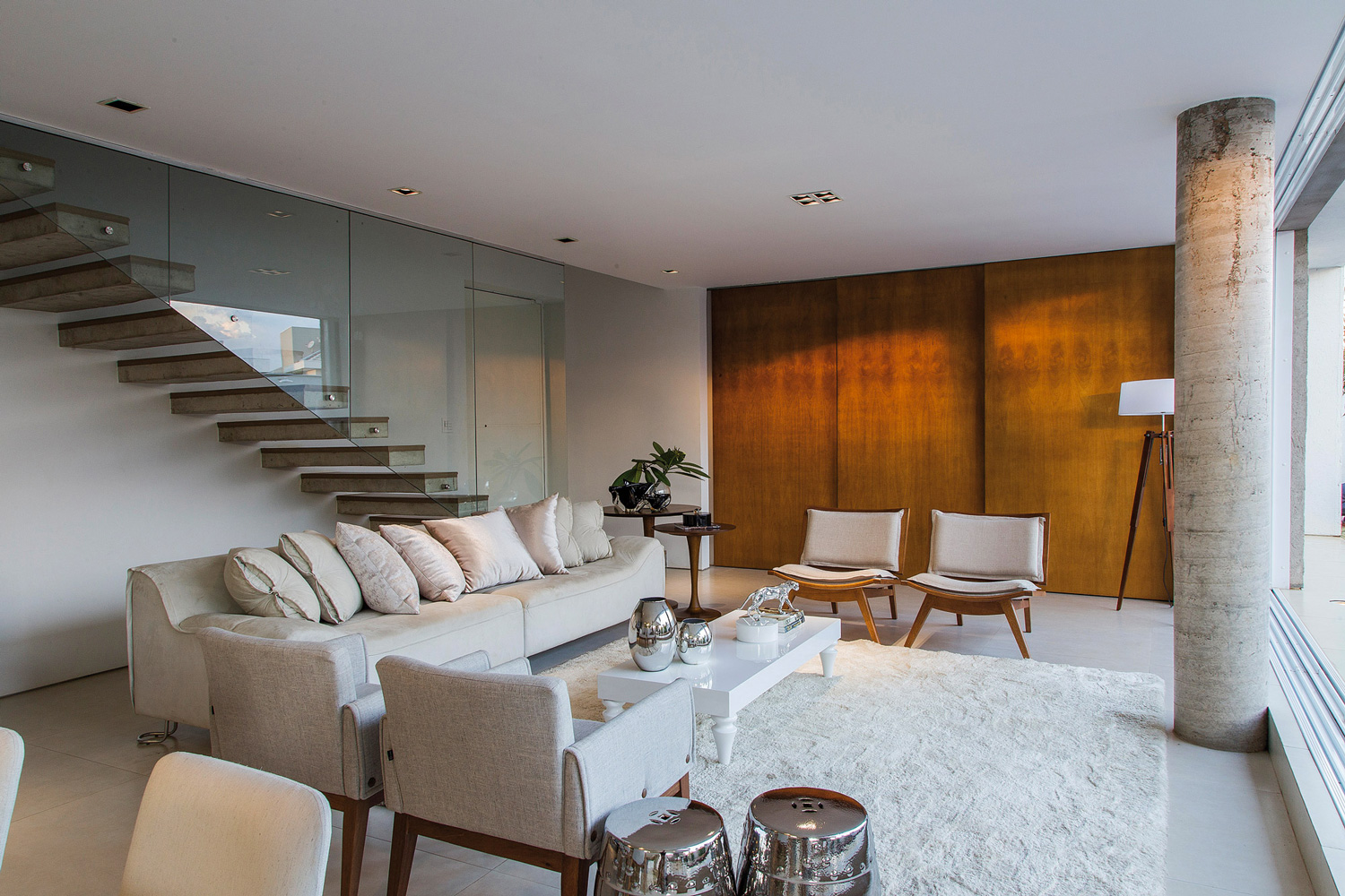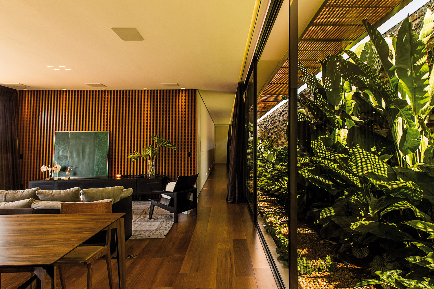 Ce sera le cas de la Casa C131 ou encore RR et même celui de ce projet en cours, la Casa Montanha où les enceintes s’érigent comme celles d’une fortification imprenable. Chaleur du bois, modernité du béton, aspérités du Corten® et large transparence du verre contribuent ainsi à bâtir des résidences séduisantes, aux lignes sobrement épurées. À l’intérieur, l’esprit est entièrement dévoué au confort. Les espaces, toujours généreux en taille, prennent le relais pour offrir des pièces chaleureuses, baignées de lumière naturelle. C’est le choix de l’aisance qui l’emporte mais aussi celui de la personnalité et de l’intime. On y retrouve une sublime utilisation et multiplicité des matériaux – des carrelages et du bois (encore !) aux sols et aux murs mais aussi du béton – qui apportent à eux tous une véritable chaleur aux espaces. Si la gamme des couleurs s’en tient aux tons naturels – écru, anthracite, blanc ou cuivré –, c’est sans aucun doute pour mieux faire le lien avec ce qui se tient, là, à quelques mètres : les jardins, les plantes ou tout bonnement, le monde extérieur. Comme une célébration faite ouvertement à ce grand pays d’Amérique du Sud. Une ode complexe, intense et chargée de soleil.