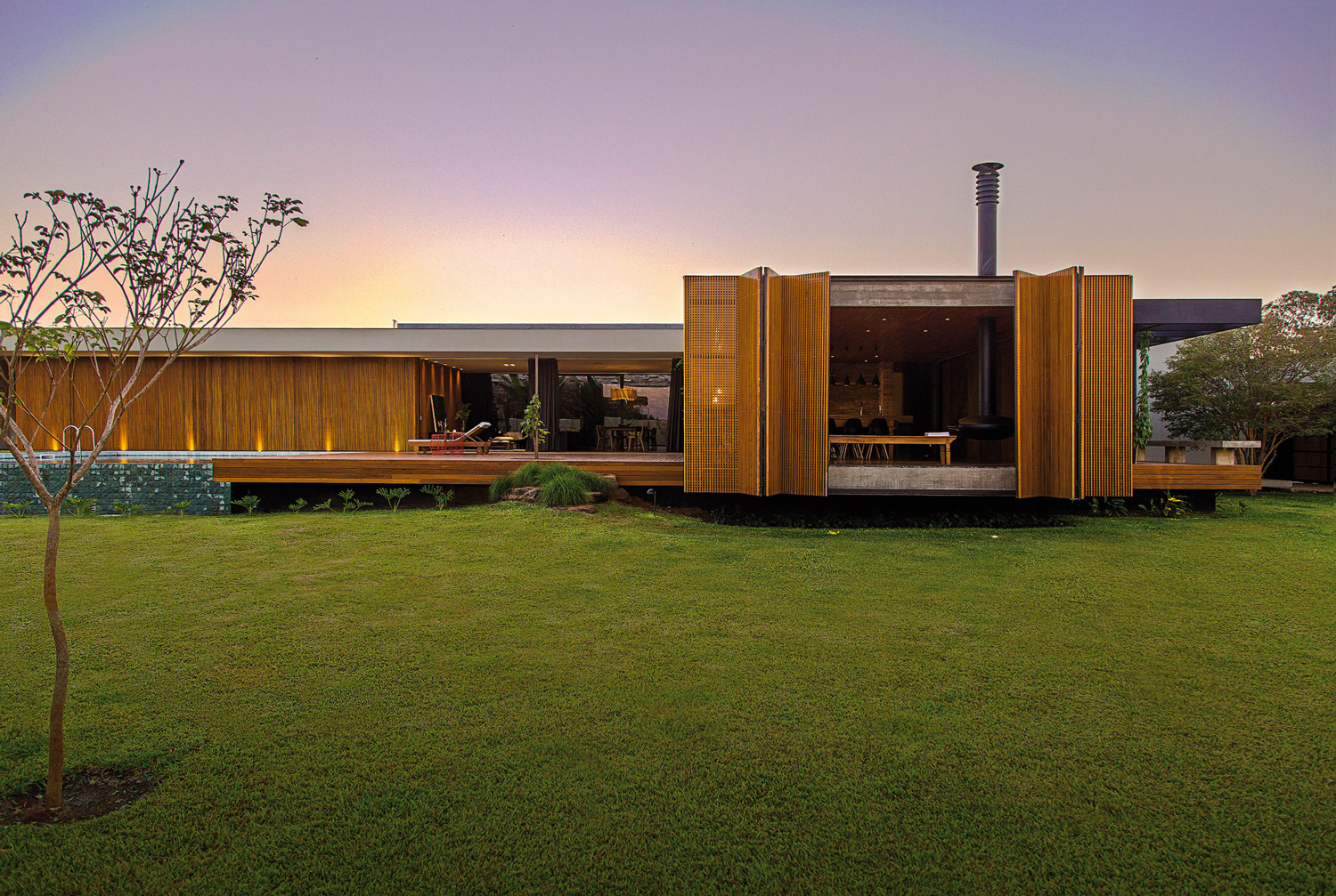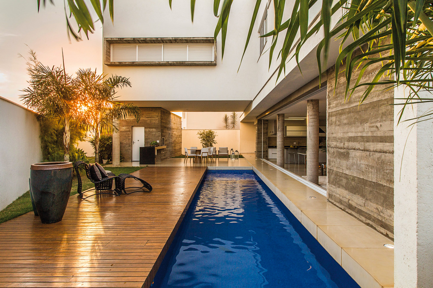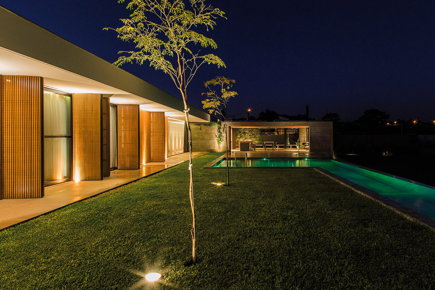 Dans cette région du nord-est de l’état de São Paulo, le climat subtropical montagneux domine toutes les activités des près de 350 000 habitants de la ville de Franca. Avec ses hivers secs et ses étés doux et pluvieux, la ville se transforme au fur et à mesure des saisons pour vivre pleinement une région largement demeurée sous le joug d’une nature abondante. Conséquence directe d’une climatologie aussi généreuse que capricieuse, l’architecture qui ne cesse de multiplier les efforts pour développer des habitations à vivre dedans/dehors. C’est le choix franc et clair de l’agence de Filipi et Mariana Garcia Oliveira, m+f arquitetos, qui n’a de cesse, depuis sa création en 2009, de dessiner des demeures qui se vivent au fil des saisons sans jamais se soucier de l’état du ciel.