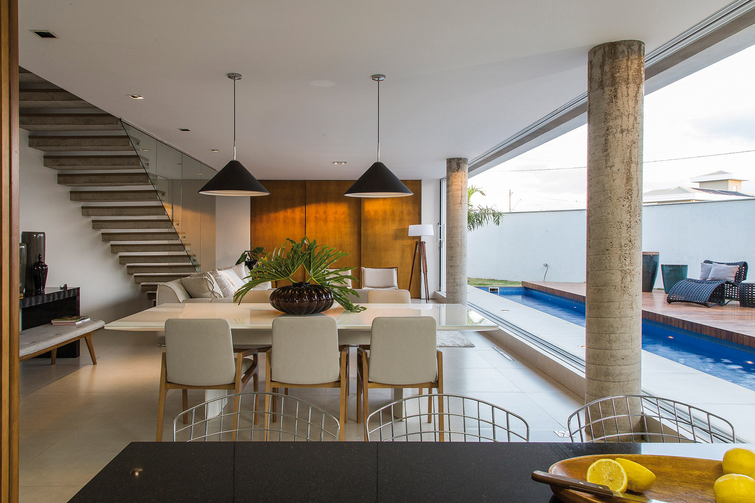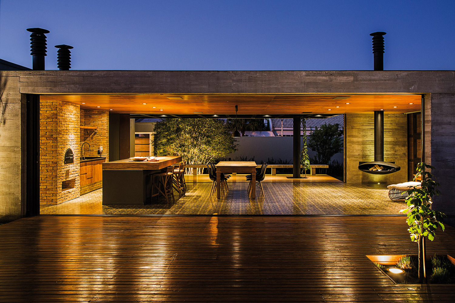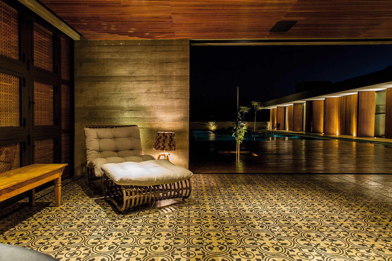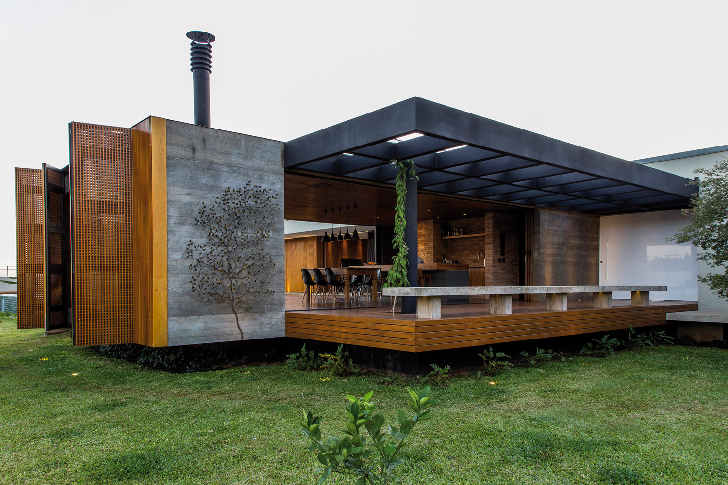 Dans cette région du nord-est de l’état de São Paulo, le climat subtropical montagneux domine toutes les activités des près de 350 000 habitants de la ville de Franca. Avec ses hivers secs et ses étés doux et pluvieux, la ville se transforme au fur et à mesure des saisons pour vivre pleinement une région largement demeurée sous le joug d’une nature abondante. Conséquence directe d’une climatologie aussi généreuse que capricieuse, l’architecture qui ne cesse de multiplier les efforts pour développer des habitations à vivre dedans/dehors. C’est le choix franc et clair de l’agence de Filipi et Mariana Garcia Oliveira, m+f arquitetos, qui n’a de cesse, depuis sa création en 2009, de dessiner des demeures qui se vivent au fil des saisons sans jamais se soucier de l’état du ciel.