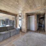 À seulement quelques centaines de mètres du centre de Megève, face au Mont-Blanc, le chalet Infinity surplombe le village et ses alentours. Son architecture traditionnelle se fond magnifiquement dans l’environnement végétal de ce versant. Le vieux bois et la pierre de roche tranchent radicalement avec les 470 m2 intérieurs où la décoration, imaginée par Vivian Ronez, allie contemporanéité, classicisme et originalité d’un habitat singulier caractérisant son style, reconnaissable parmi tant d’autres. L’escalier de verre et d’acier vous transporte dans les trois étages du chalet. L’immense volume enfermant séjour, salle à manger et cuisine est marqué par une charpente apparente aux poutres impressionnantes – provenant d’une abbaye en Italie ayant été démontée –, et révèle une véritable symphonie de matériaux, luxueux et confortables d’inspiration Art déco. Cet espace jouit d’une vue à couper le souffle sur le village et les sommets alpins ; la luminosité met particulièrement en valeur le squelette de tyrannosaure qui se tient prêt à bondir au-dessus de la cuisine, ainsi que chaque pièce de mobilier. Les meubles et de luminaires participent également à la magnificence de l’endroit, à l’image des immenses et profonds canapés en velours et des sièges de la cuisine de Ascensión Latorre ou encore de la suspension du designer italien Gino Sarfatti. La sélection d’œuvres d’art contemporain ajoute du caractère aux intérieurs, avec, dans le salon TV, deux pièces de l’artiste Arman, et une du fameux Robert Combas. Un Dinosaure rouge de Sui Jianguo surveille, quant à lui, la salle à manger… Le concepteur du chalet a par ailleurs sublimé les espaces avec de très belles matières. Dans la pièce de vie par exemple, un superbe mur en dalles de cuir, réalisé par un artisan local, Jérome Goulois (ancien de chez Hermès), impose son élégance ; dans l’une des chambres, les rideaux et tissus tendus sont en poulain noir (Eurolitex)… Le chalet dispose de six chambres pour quatorze couchages dont deux master rooms, les salles de bains sont toutes en pierre, dont certaines en marbre de Carrare, et l’endroit demeure familial avec tous les agréments pour satisfaire petits et grands : piscine intérieure, salle de sport, salle de cinéma, cave à vin, garage spacieux. Le chalet Infinity est un véritable joyau, une mélodie architecturale.