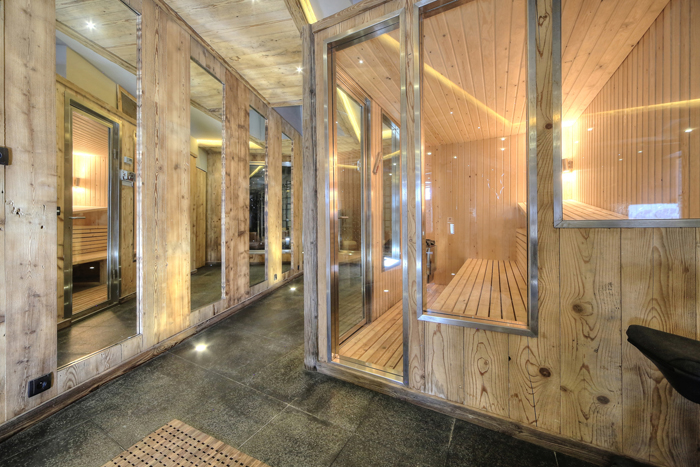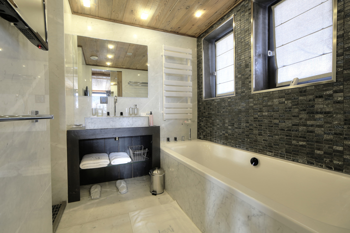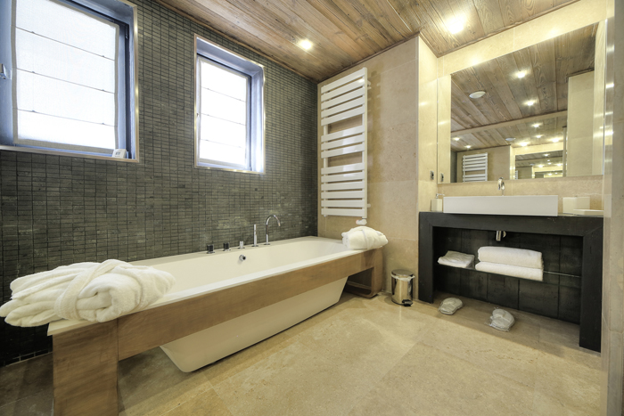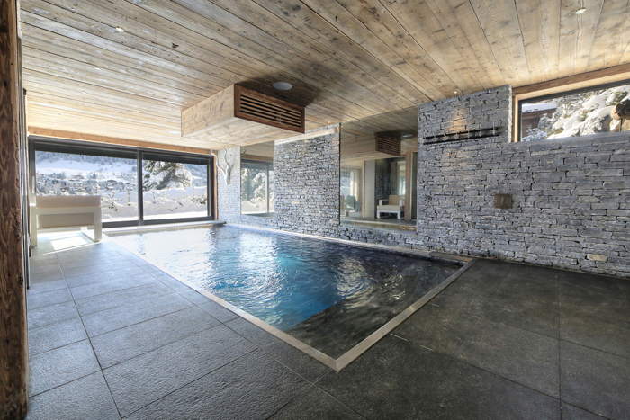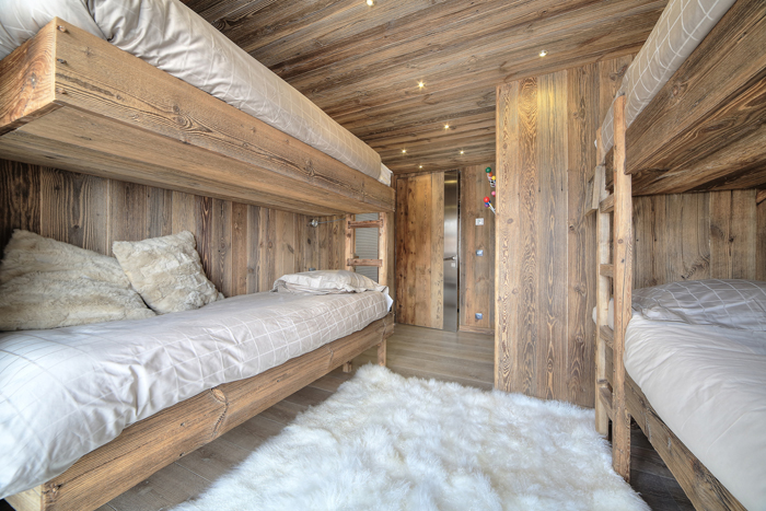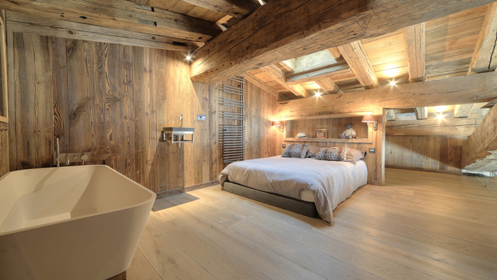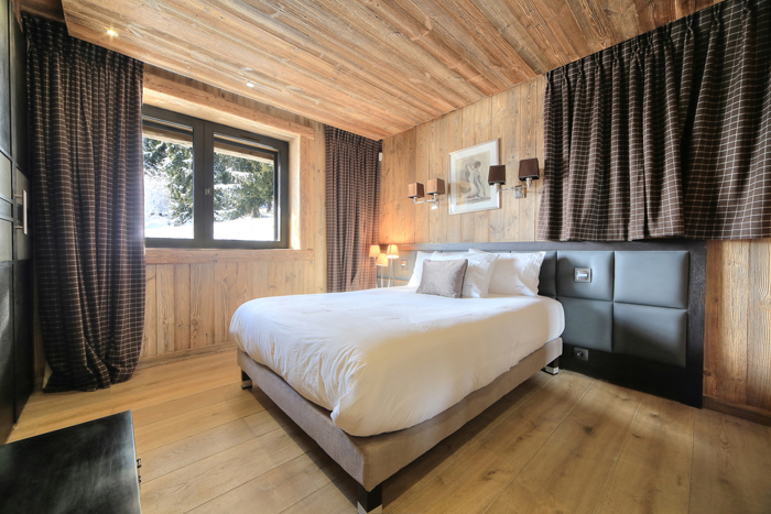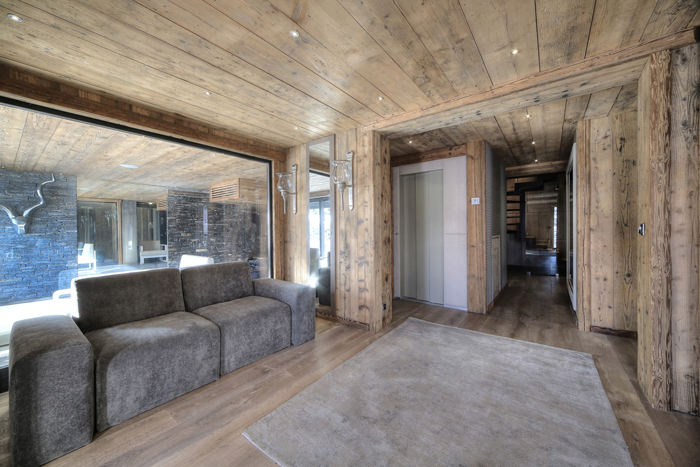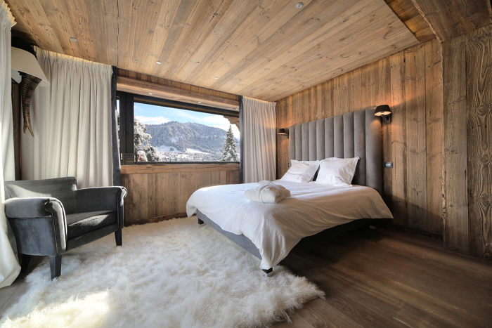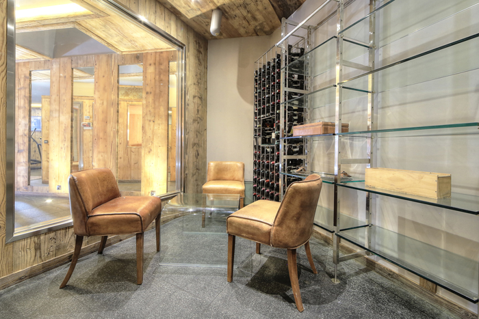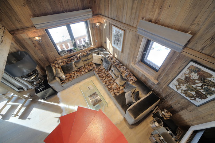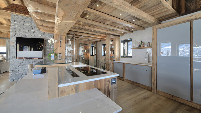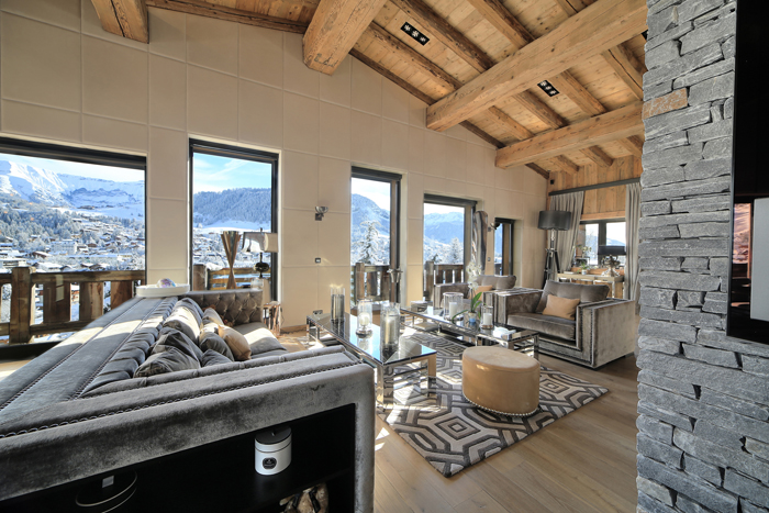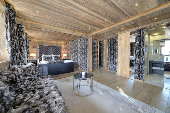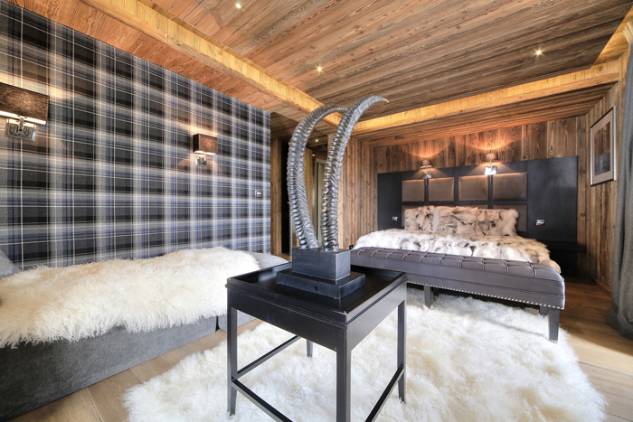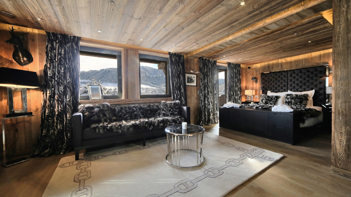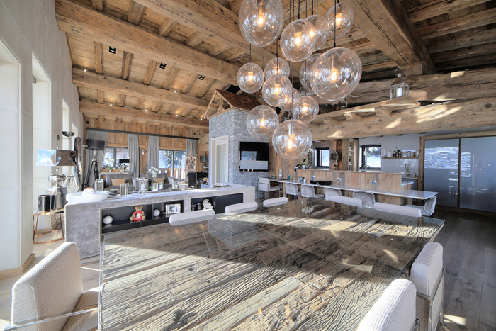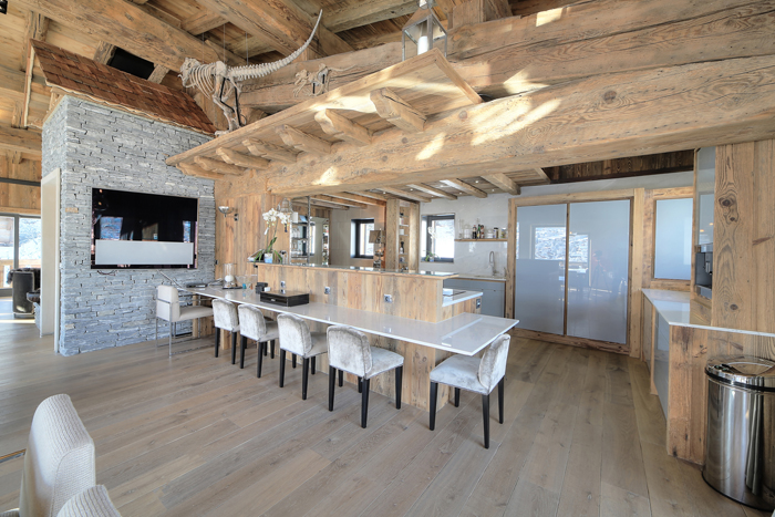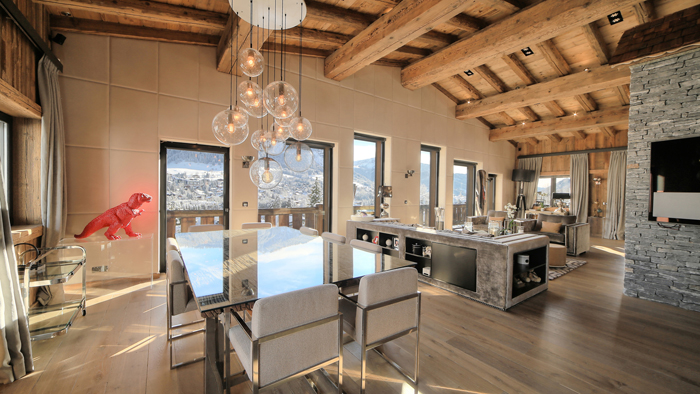 À seulement quelques centaines de mètres du centre de Megève, face au Mont-Blanc, le chalet Infinity surplombe le village et ses alentours. Son architecture traditionnelle se fond magnifiquement dans l’environnement végétal de ce versant. Le vieux bois et la pierre de roche tranchent radicalement avec les 470 m2 intérieurs où la décoration, imaginée par Vivian Ronez, allie contemporanéité, classicisme et originalité d’un habitat singulier caractérisant son style, reconnaissable parmi tant d’autres. L’escalier de verre et d’acier vous transporte dans les trois étages du chalet. L’immense volume enfermant séjour, salle à manger et cuisine est marqué par une charpente apparente aux poutres impressionnantes – provenant d’une abbaye en Italie ayant été démontée –, et révèle une véritable symphonie de matériaux, luxueux et confortables d’inspiration Art déco. Cet espace jouit d’une vue à couper le souffle sur le village et les sommets alpins ; la luminosité met particulièrement en valeur le squelette de tyrannosaure qui se tient prêt à bondir au-dessus de la cuisine, ainsi que chaque pièce de mobilier. Les meubles et de luminaires participent également à la magnificence de l’endroit, à l’image des immenses et profonds canapés en velours et des sièges de la cuisine de Ascensión Latorre ou encore de la suspension du designer italien Gino Sarfatti. La sélection d’œuvres d’art contemporain ajoute du caractère aux intérieurs, avec, dans le salon TV, deux pièces de l’artiste Arman, et une du fameux Robert Combas. Un Dinosaure rouge de Sui Jianguo surveille, quant à lui, la salle à manger… Le concepteur du chalet a par ailleurs sublimé les espaces avec de très belles matières. Dans la pièce de vie par exemple, un superbe mur en dalles de cuir, réalisé par un artisan local, Jérome Goulois (ancien de chez Hermès), impose son élégance ; dans l’une des chambres, les rideaux et tissus tendus sont en poulain noir (Eurolitex)… Le chalet dispose de six chambres pour quatorze couchages dont deux master rooms, les salles de bains sont toutes en pierre, dont certaines en marbre de Carrare, et l’endroit demeure familial avec tous les agréments pour satisfaire petits et grands : piscine intérieure, salle de sport, salle de cinéma, cave à vin, garage spacieux. Le chalet Infinity est un véritable joyau, une mélodie architecturale.