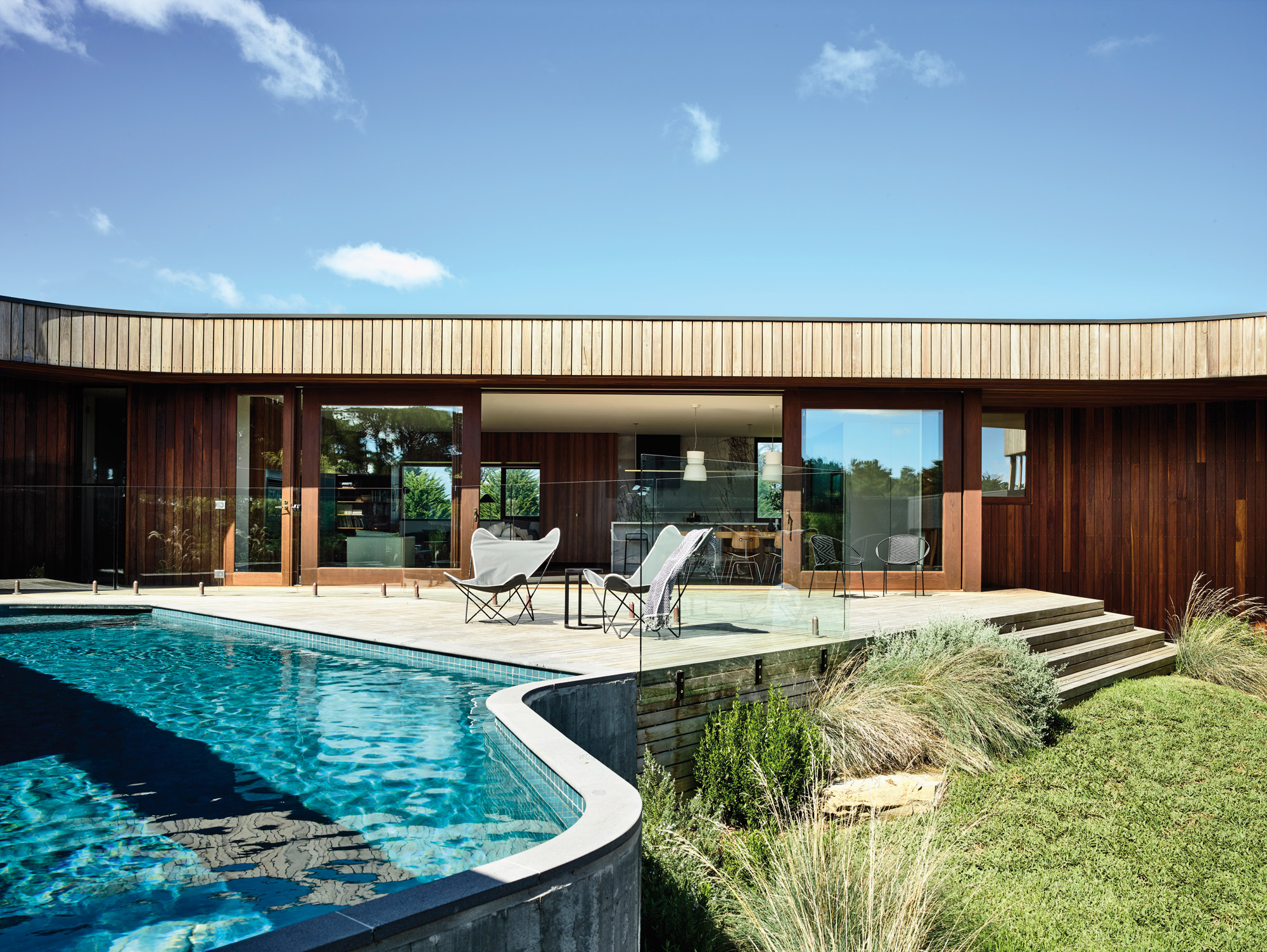 Au premier abord, c’est au bloc de béton, massif et imposant, que l’on fait face. Puis le bois prend le relais, adoucissant au passage les traits si bruts de l’agglomérat de minéraux. Épais et délicieusement grossier, le béton fait office de remparts, protégeant massivement du monde extérieur, la vie intérieure, secrète, de la maison. Là, un jardin suspendu et quelques archères offrant des vues sur les marécages voisins apportent aux hôtes leur espace privé de verdure. Un mur de verre, couvrant les deux étages, connecte la cour intérieure et les pièces de la maison, qui jouissent toute au passage de la lumière naturelle qui s’y infiltre dès le lever du jour. C’est d’ailleurs peut-être ce contraste du monde privé et de la vie intérieure, ou ce sens fort de l’enceinte, gardienne et protectrice de l’habitation, qui domine dans l’architecture de Stibbard et Fitzpatrick. Un sens que l’on retrouve dans les maisons 13th Beach Courtyard, Beach Brick et Bluff. Chacune s’érige en effet comme une petite forteresse. Bâties sur un terrain de golf, les trois maisons doivent toutes répondre aux besoins d’intimité des familles, mais aussi à celui de sa relation directe avec le monde naturel qui les entoure. Là encore, les enceintes jouent le rôle de cuirasse. Convexes, elles invitent à une vie tournée sur la vie intérieure de la maison, loin des regards d’autrui, laissant seuls les hôtes à choisir ou non d’observer, à partir de points stratégiquement choisis, la vie qui se déroule au-delà de leurs murs. Seule peut-être, la maison Ivanhoe paraît faire exception. Ou pas… Courbe dans sa forme structurelle – on n’échappe pas à ses instincts ! – elle offre – surprise ! –, et ce de toute part, un lien immédiat avec le paysage boisé qui l’entoure. Il faut dire, qu’exempte de voisinage direct, elle peut alors s’ouvrir complètement, sans pudeur, vers son environnement. Est-ce là exception à la règle ? En réalité pas vraiment, puisque c’est encore l’environnement qui, à nouveau, comme pour tous les projets de Stibbard et Fitzpatrick, détermine la maison. Son sens. Sa raison d’être.