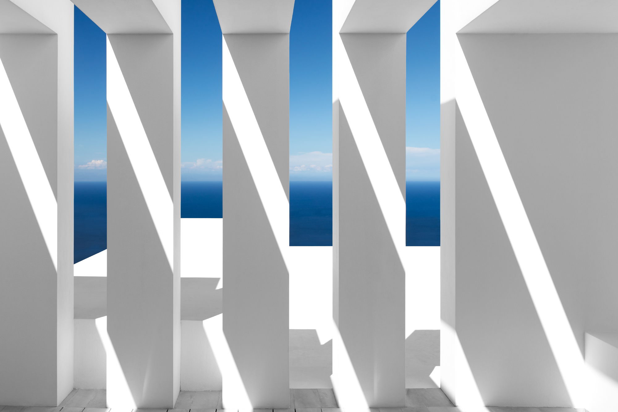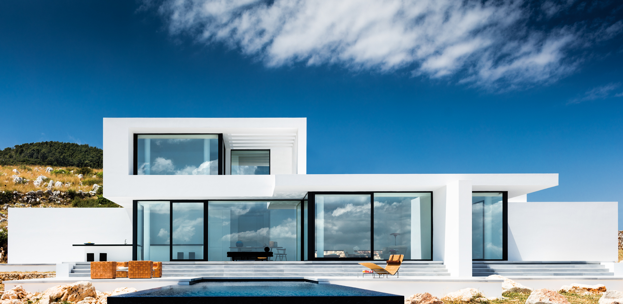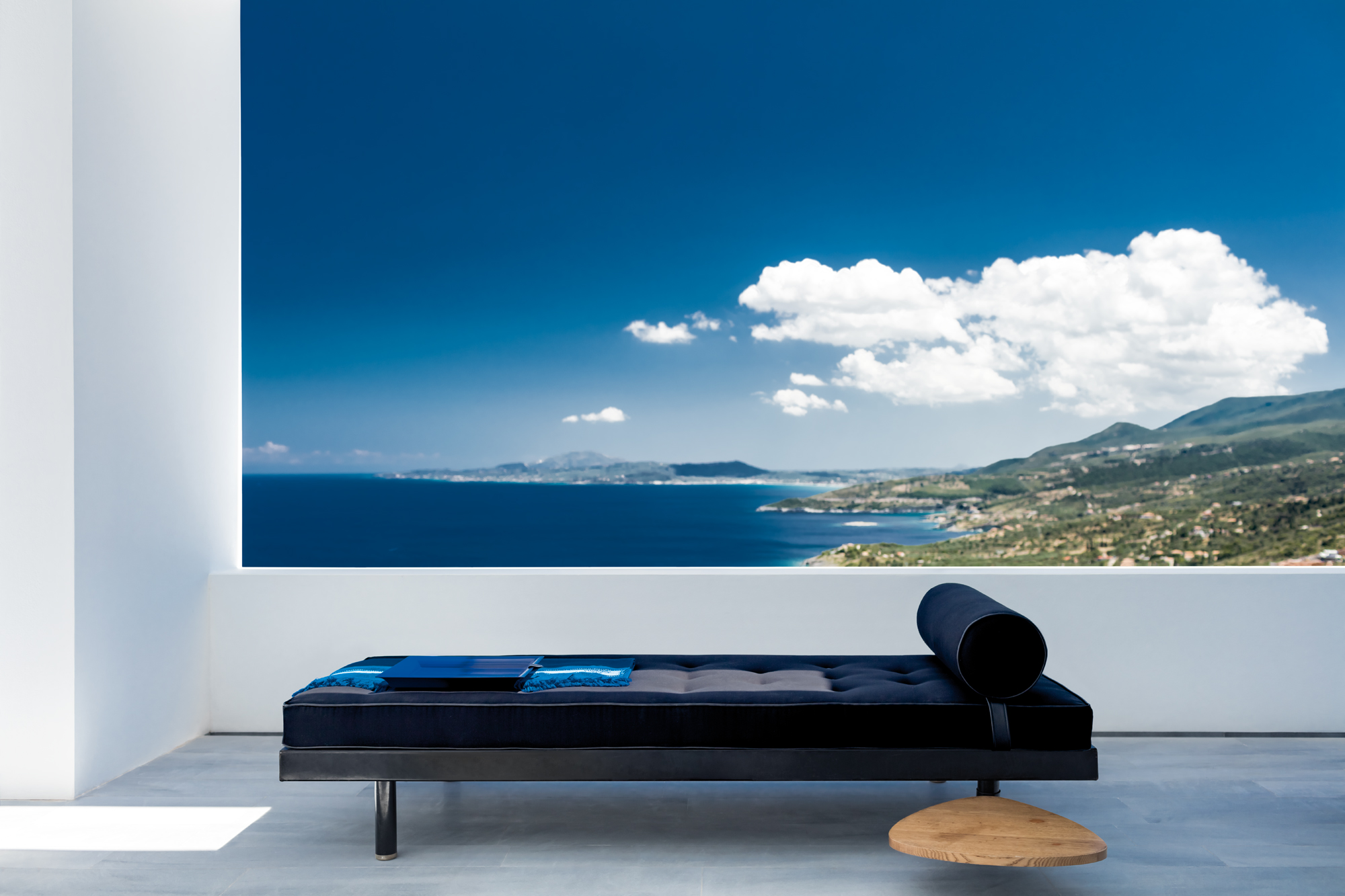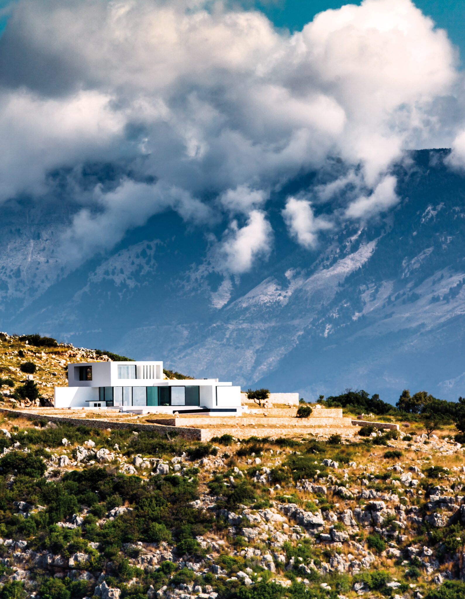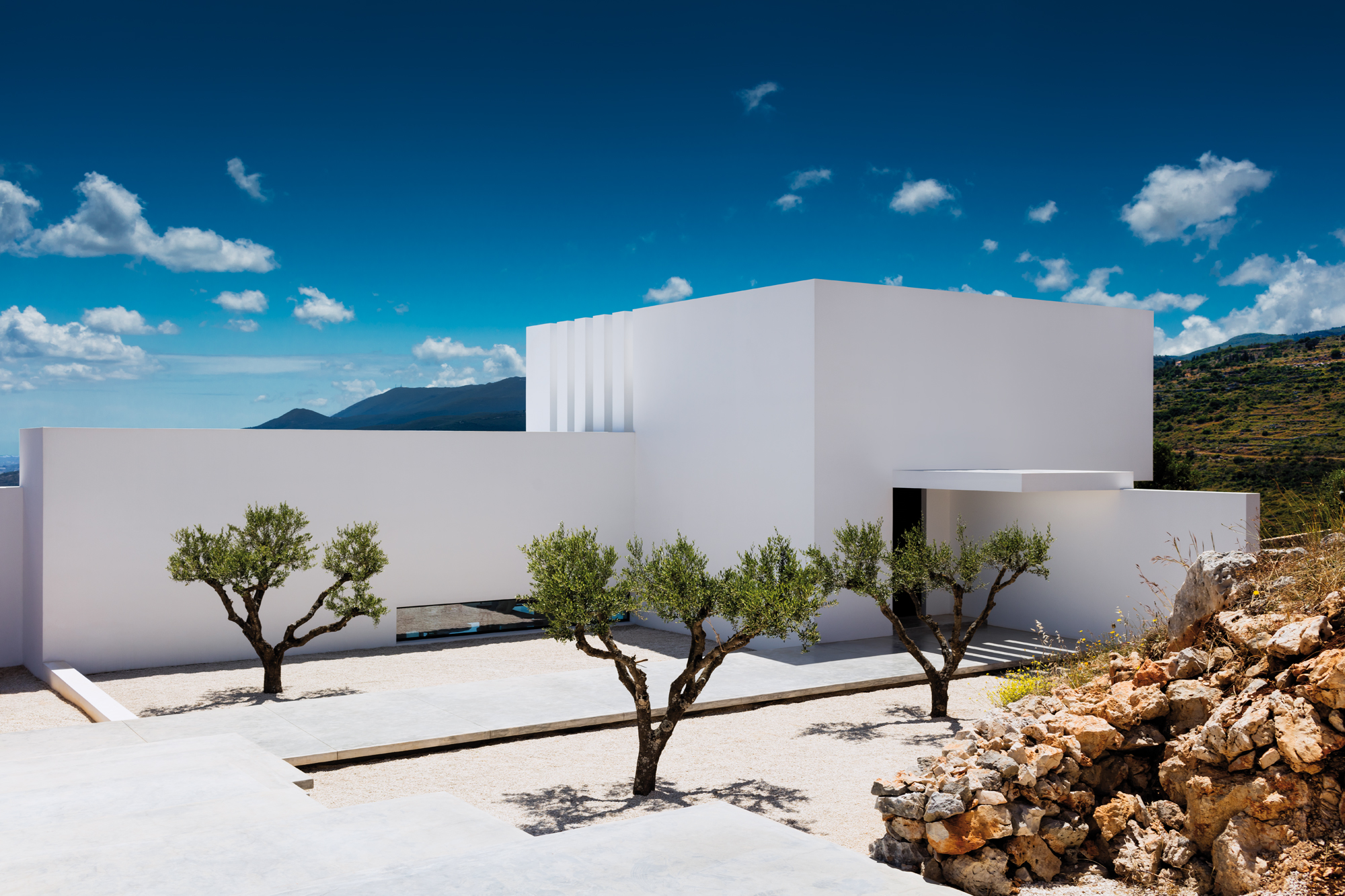 L’architecte belge Olivier Dwek conçoit des projets haute couture sur plusieurs continents. En Grèce, il avait déjà exprimé son immense talent en dévoilant la Silver House sur l’île de Zante (voir Artravel n° 66), qui lui avait valu de nombreux succès… Comme pour cette dernière demeure, c’est d’architecture vernaculaire grecque qu’il s’agit là… Et plus précisément de sa traduction contemporaine. À flanc de coteau, l’Australian House jouit d’un emplacement d’exception sur la pointe nord de l’île ionienne, avec une vue plongeante sur la Méditerranée, au cœur d’une nature encore sauvage, à proximité immédiate de la ruine d’un moulin antique et proche de l’île de Céphalonie semblant si accessible… Entièrement cadrée sur la mer et la montagne, cette villa immaculée de 250 m2 nous conte une fabuleuse histoire. Le blanc de l’architecture et le bleu du ciel et de la Méditerranée conversent en permanence, comme une évidence… Olivier Dwek a imaginé un projet aux contours intérieurs et extérieurs d’une extrême pureté pour ne perturber en rien le spectacle de la nature qui se joue ici… Presque opaque, l’arrière de la maison, rythmé par trois oliviers rappelant la végétation de l’île, un chemin de béton, la roche et les ruines d’un moulin antique, brouille les pistes. Il ne montre rien de la scène grandiose qui se déroule de l’autre côté…