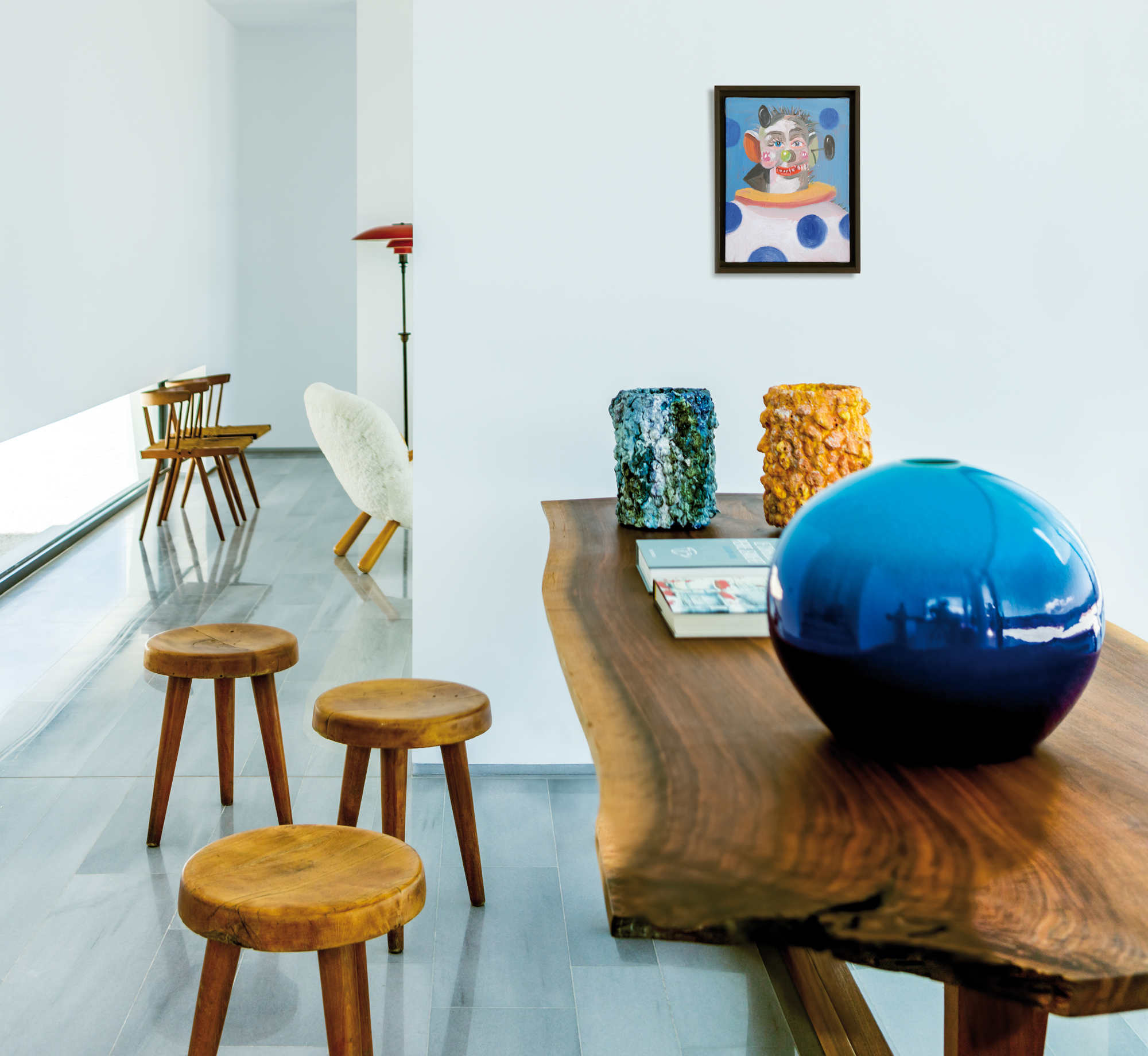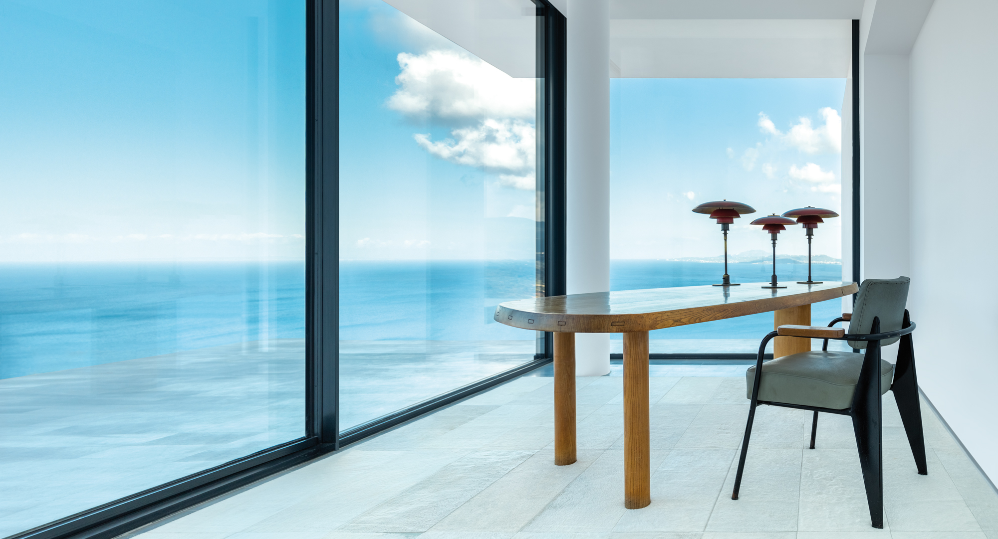 Olivier Dwek a par ailleurs eu carte blanche pour le choix du mobilier. Passionné par les arts décoratifs, par le mobilier moderniste des grands architectes du XXe siècle, il a sélectionné des pièces majeures des années 30 à 60, françaises, américaines et danoises. Ainsi, cette demeure de vacances mêle-t-elle des meubles signés, entre autres par George Nakashima, Charlotte Perriand, Ado Chale et Jean Prouvé. « Ce mobilier a beaucoup d’âme, il a une histoire, du caractère, et il contraste magnifiquement avec l’architecture immaculée de la résidence, et lui confère de la personnalité. » Des lampes de Poul Henningsen ou encore des céramiques de Yoshiro Kimura et de Tony Marsh complètent l’ensemble. Et toutes ces associations fonctionnent à merveille. En instaurant à la perfection un étroit dialogue entre nature sauvage et pureté formelle, Olivier Dwek est allé jusqu’au bout de son idée, de sa philosophie… Il a métamorphosé l’Australian House en un chef-d’œuvre essentiel et intemporel.