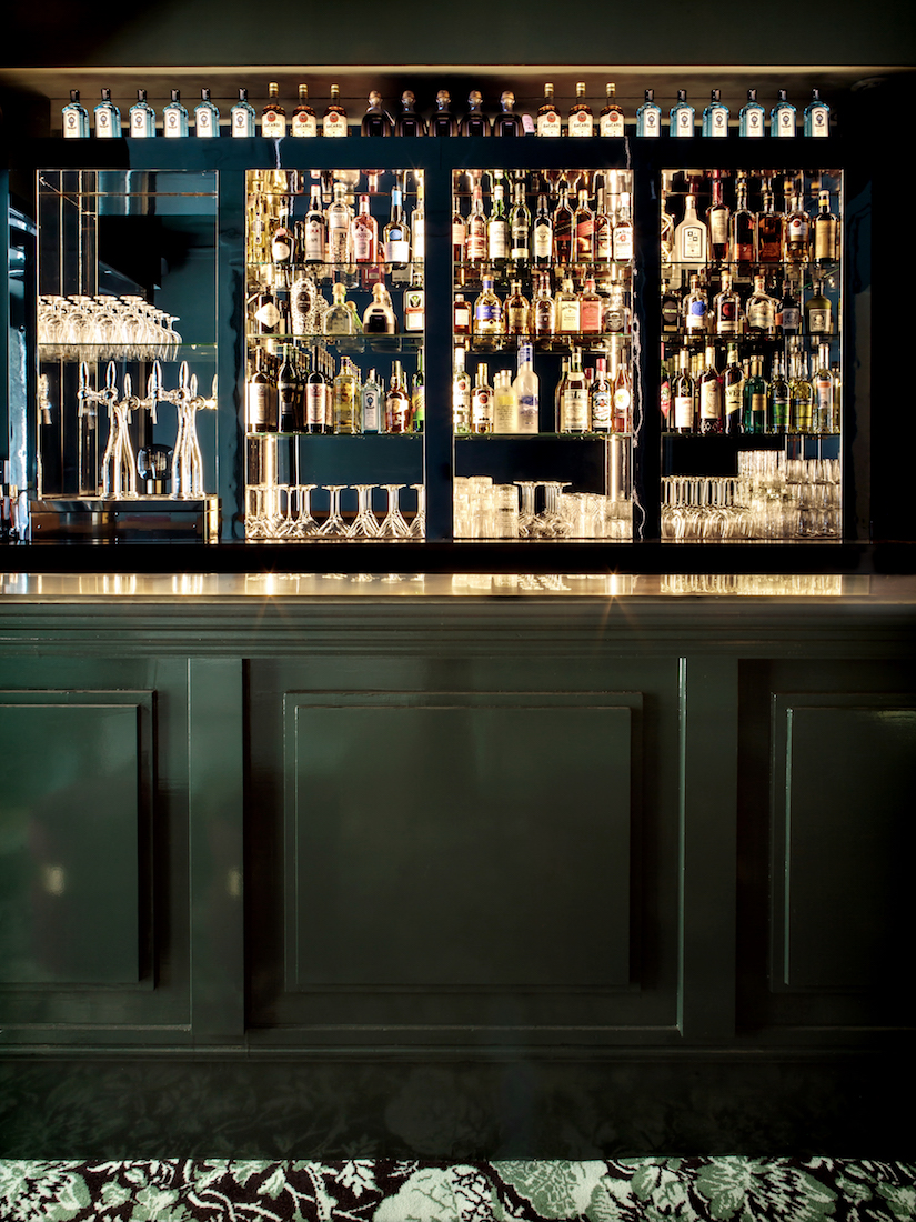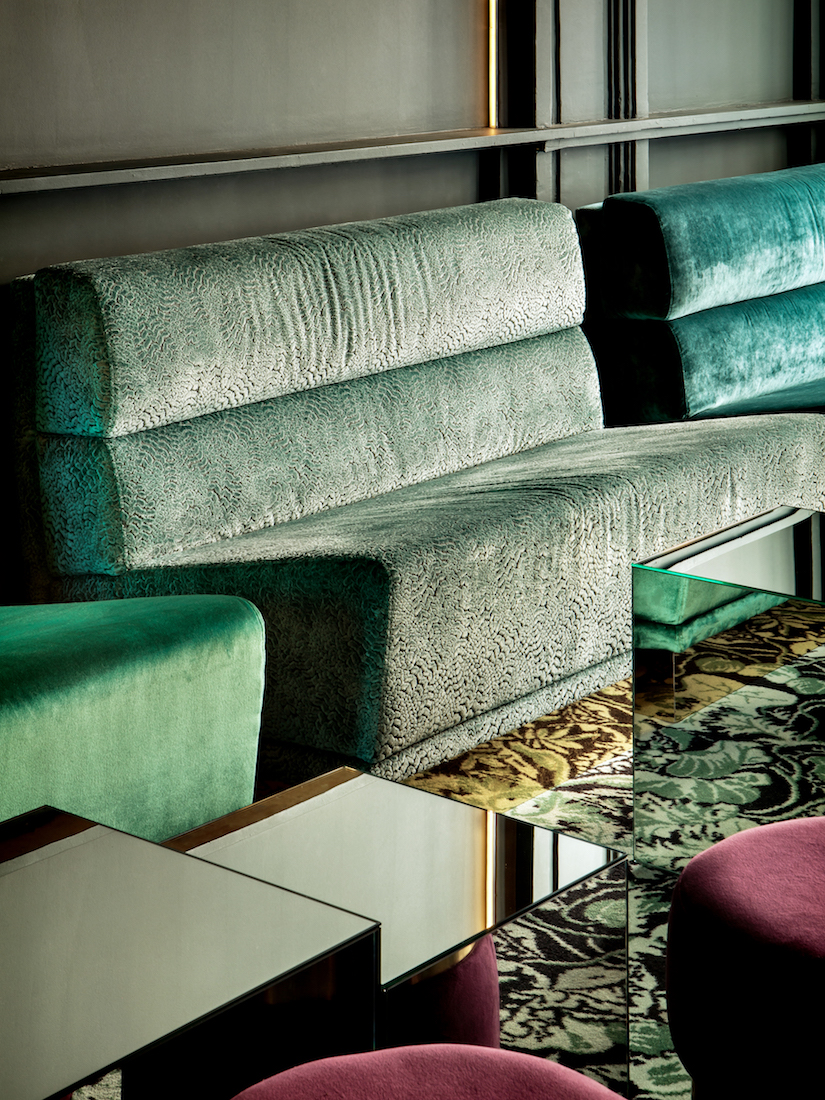 Les fauteuils et banquettes invitent aux confidences entre deux danses fiévreuses. Réalisé sur mesure le mobilier est habillé de tissus Dedar, de cuir plissé mais aussi de laiton, matériau brut et lumineux, que l’on retrouve par touche à l’instar des tables bijoux-miroir. Les couleurs dominantes alternent entre tonalités chaudes et froides, entre or, argent, bleu givré, vert malachite et violet améthyste pour créer une ambiance feutrée au charme enveloppant.