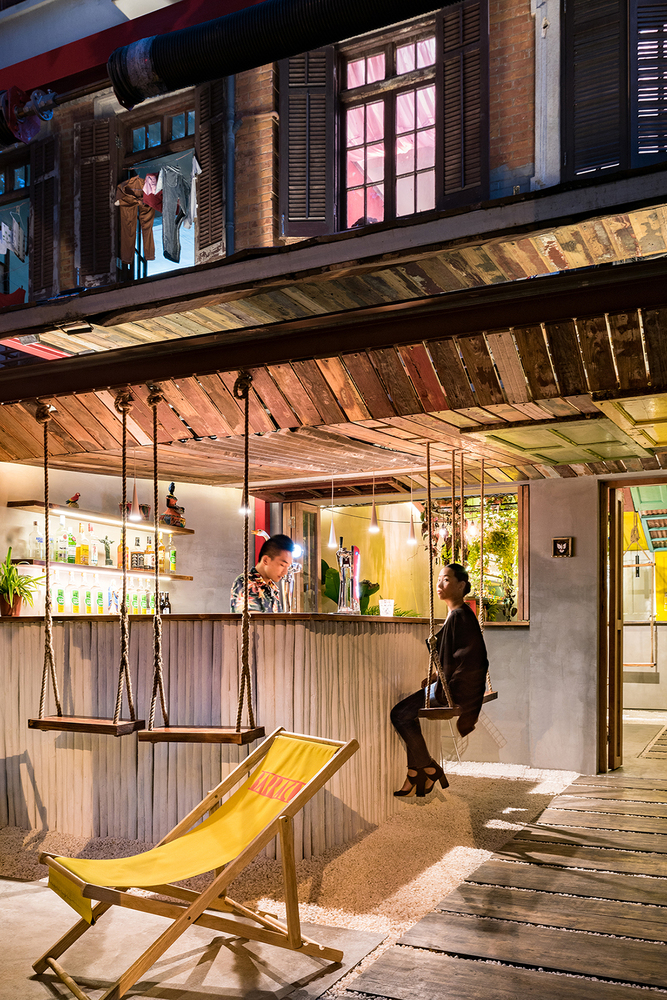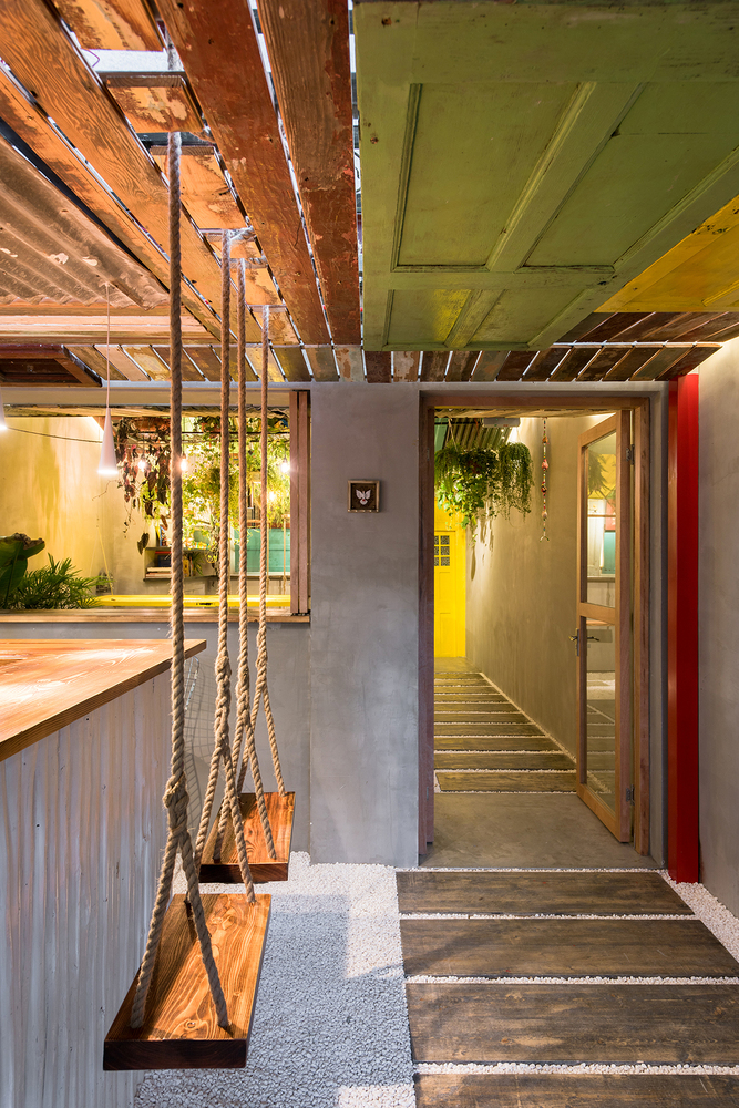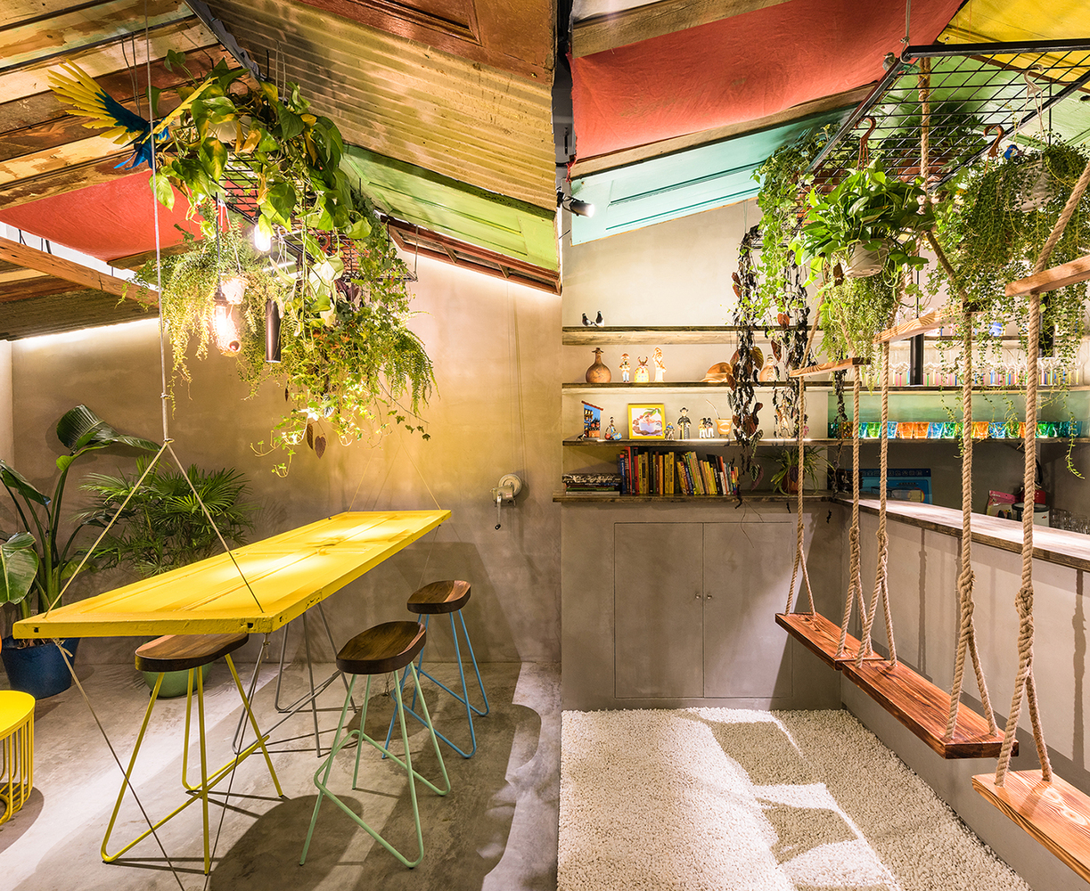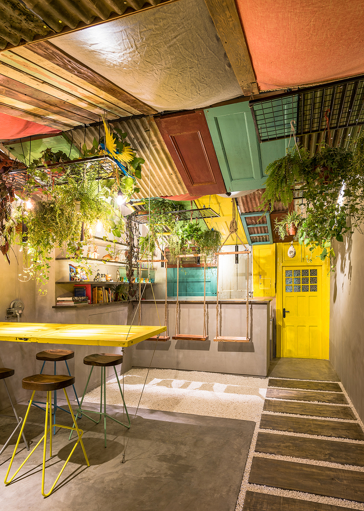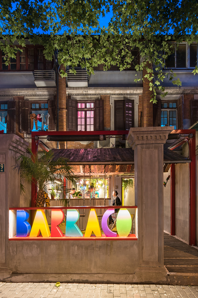 Conçu par le cabinet d’architecture Quarta & Armando, le bar brésilien Barraco utilise des matériaux récupérés, des portes et des fenêtres de bâtiments démolis à Shanghai et des objets trouvés pour mettre en scène l’atmosphère informelle, désordonnée et colorée des villes tropicales.