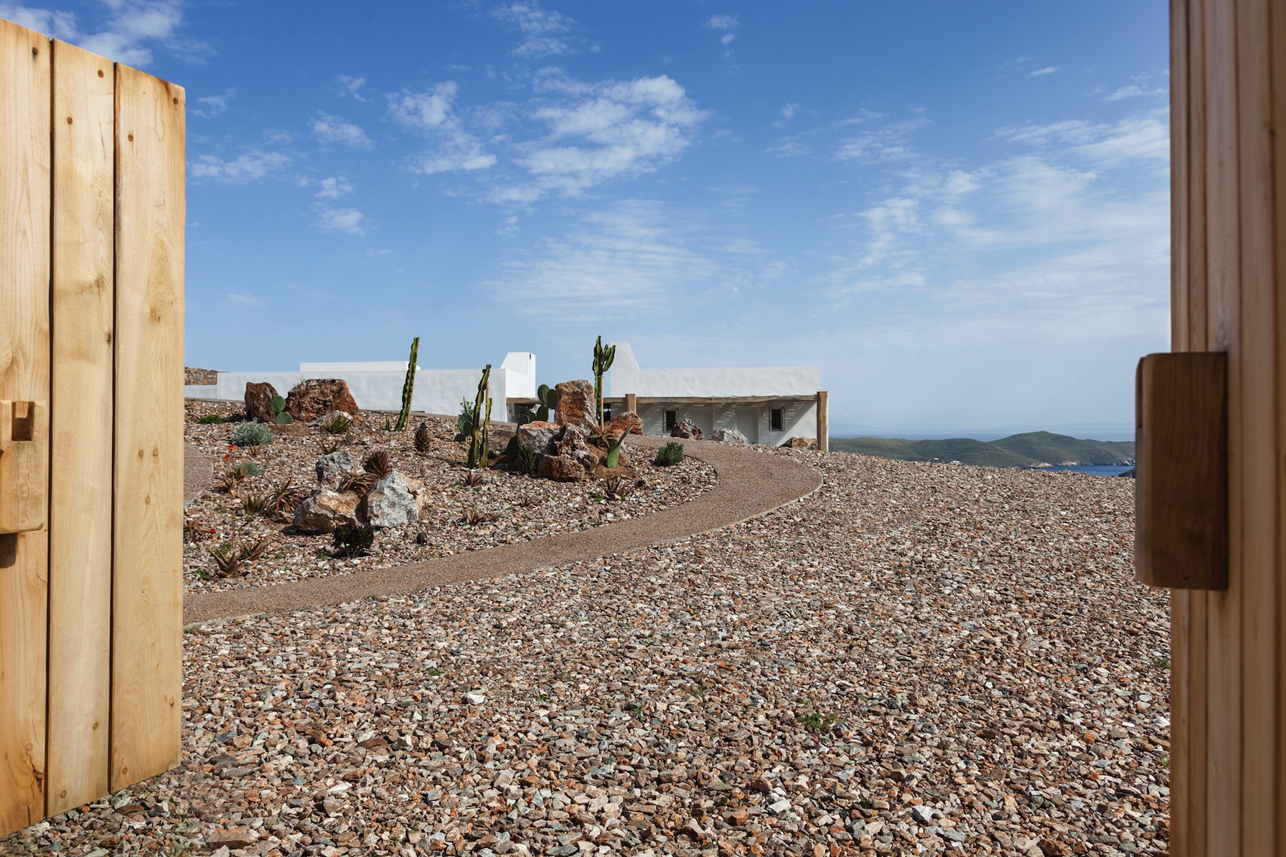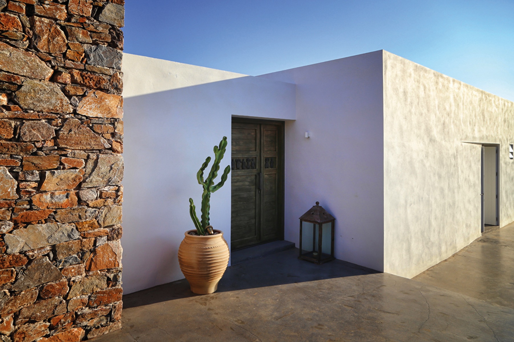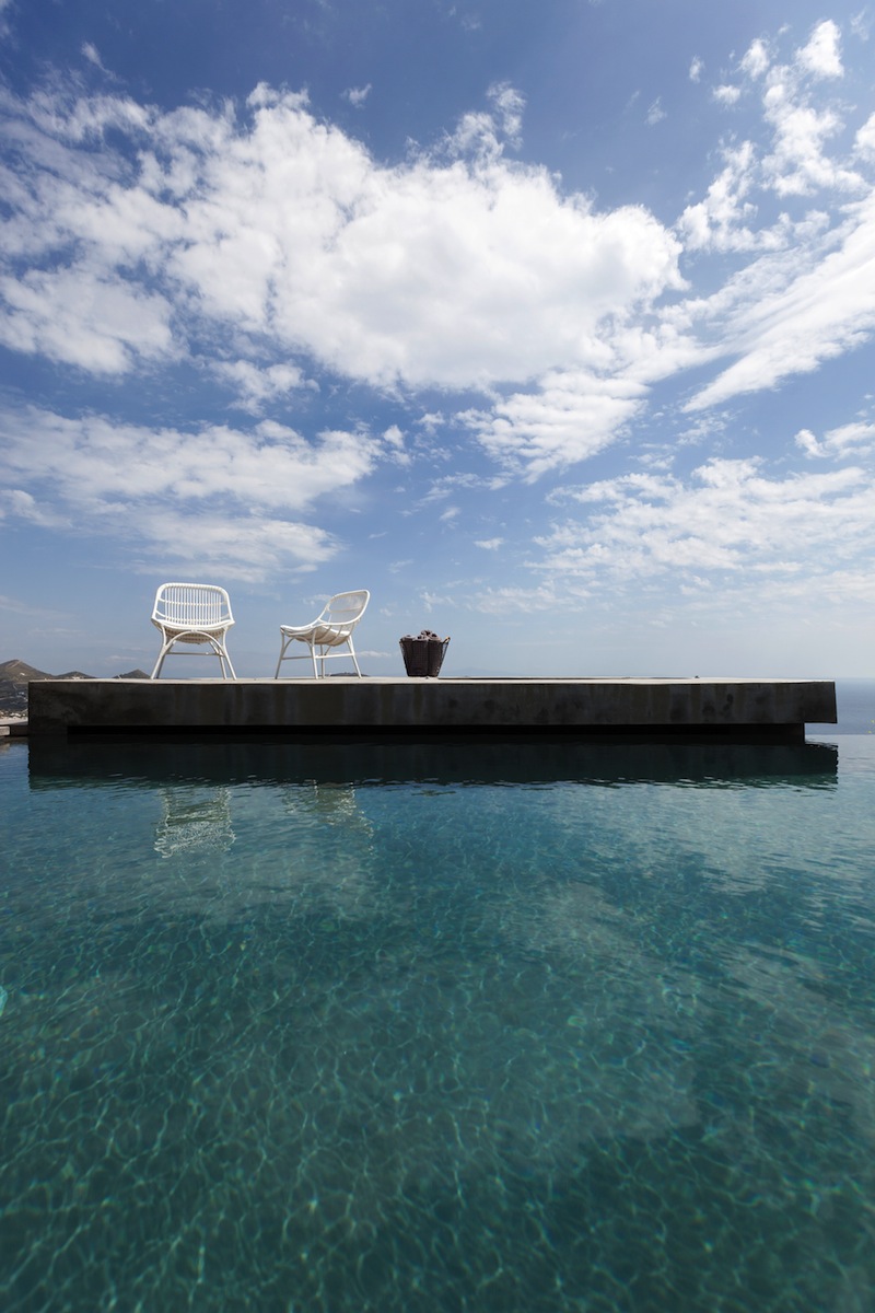 Pour y accéder, il faudra crapahuter un peu. Il faut dire qu’à cet endroit de l’île, les escarpements ont emboîté le pas sur la plaine qui se tient plus bas. Rocailleuse, vallonnée, cette hauteur de l’île de Syros est aussi celle qui offre l’un des plus beaux points de vue sur la mer Egée qui entoure cette île des Cyclades. Pour y inscrire leur projet architectural, les architectes de Block 722 ont alors imaginé une résidence qui ne manquerait pas de louer la beauté sauvage et naturelle du site. Ainsi, la maison Syros II, s’offre-t-elle comme une gourmandise. Quelque part entre beauté exquise et pureté magique de lignes qui disent juste ce qu’il faut pour que tout le monde comprenne qui, du lieu ou de la résidence, mène ici la danse. Enfin, l’on descend le grand escalier presque monumental qui domine la maison que l’on atteint en quelques pas, pour découvrir les espaces partagés du lieu, qui s’ouvrent vers le monde extérieur et la mer Egée, qui semble à portée de main. Comme pour la plupart de leurs projets, les architectes ont fait ici le choix de lignes claires et simples qui définissent en un seul trait les pièces de la maison. Ces pièces rejointes dans leur continuité par de grands espaces ouverts où la vie peut se poursuivre à découvert, en bord de piscine, ou bien encore, dans le coin repas, où l’on peut, les soirs d’un été trop chaud, venir se rafraîchir tout en dégustant quelques plats fraîchement préparés. Ce seront aux espaces privatifs, les chambres et la maison réservée aux hôtes, de surprendre un peu, puisque les deux bâtiments qui les accueillent ont été partiellement inscrits dans la déclivité du terrain. Un mur de pierres, extraites des sols du terrain, délimite leurs contours et permet aux deux bâtisses de s’inscrire presque naturellement dans ce paysage pittoresque.