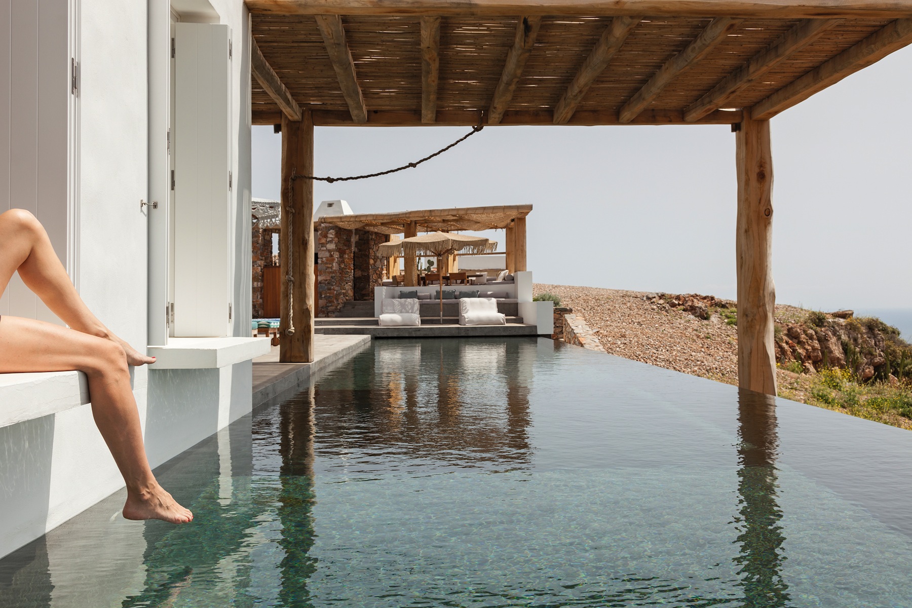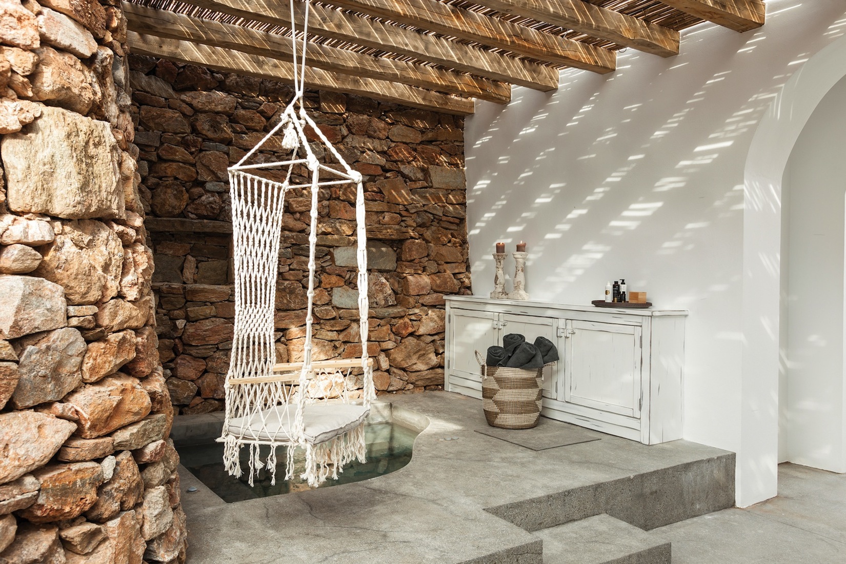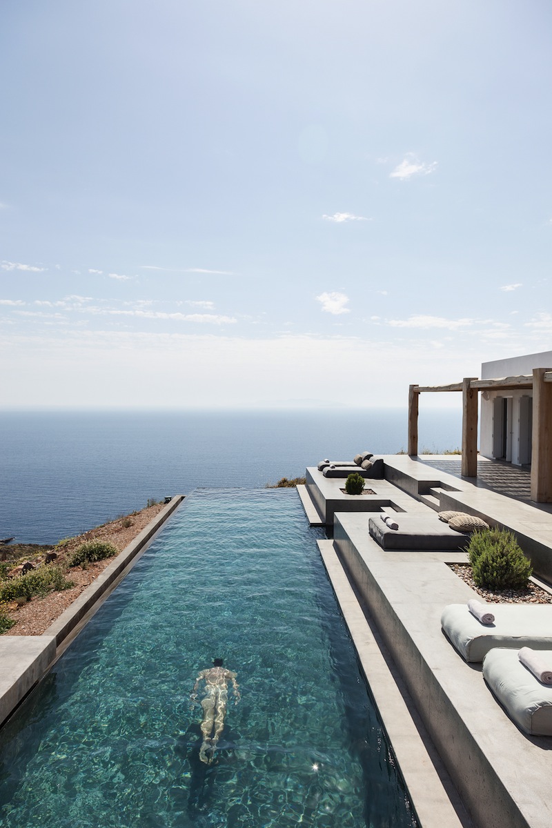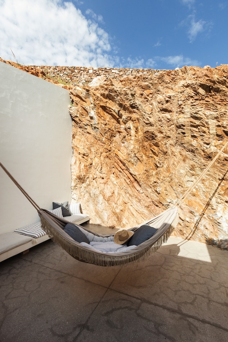 Pour y accéder, il faudra crapahuter un peu. Il faut dire qu’à cet endroit de l’île, les escarpements ont emboîté le pas sur la plaine qui se tient plus bas. Rocailleuse, vallonnée, cette hauteur de l’île de Syros est aussi celle qui offre l’un des plus beaux points de vue sur la mer Egée qui entoure cette île des Cyclades. Pour y inscrire leur projet architectural, les architectes de Block 722 ont alors imaginé une résidence qui ne manquerait pas de louer la beauté sauvage et naturelle du site. Ainsi, la maison Syros II, s’offre-t-elle comme une gourmandise. Quelque part entre beauté exquise et pureté magique de lignes qui disent juste ce qu’il faut pour que tout le monde comprenne qui, du lieu ou de la résidence, mène ici la danse. Enfin, l’on descend le grand escalier presque monumental qui domine la maison que l’on atteint en quelques pas, pour découvrir les espaces partagés du lieu, qui s’ouvrent vers le monde extérieur et la mer Egée, qui semble à portée de main. Comme pour la plupart de leurs projets, les architectes ont fait ici le choix de lignes claires et simples qui définissent en un seul trait les pièces de la maison. Ces pièces rejointes dans leur continuité par de grands espaces ouverts où la vie peut se poursuivre à découvert, en bord de piscine, ou bien encore, dans le coin repas, où l’on peut, les soirs d’un été trop chaud, venir se rafraîchir tout en dégustant quelques plats fraîchement préparés. Ce seront aux espaces privatifs, les chambres et la maison réservée aux hôtes, de surprendre un peu, puisque les deux bâtiments qui les accueillent ont été partiellement inscrits dans la déclivité du terrain. Un mur de pierres, extraites des sols du terrain, délimite leurs contours et permet aux deux bâtisses de s’inscrire presque naturellement dans ce paysage pittoresque.