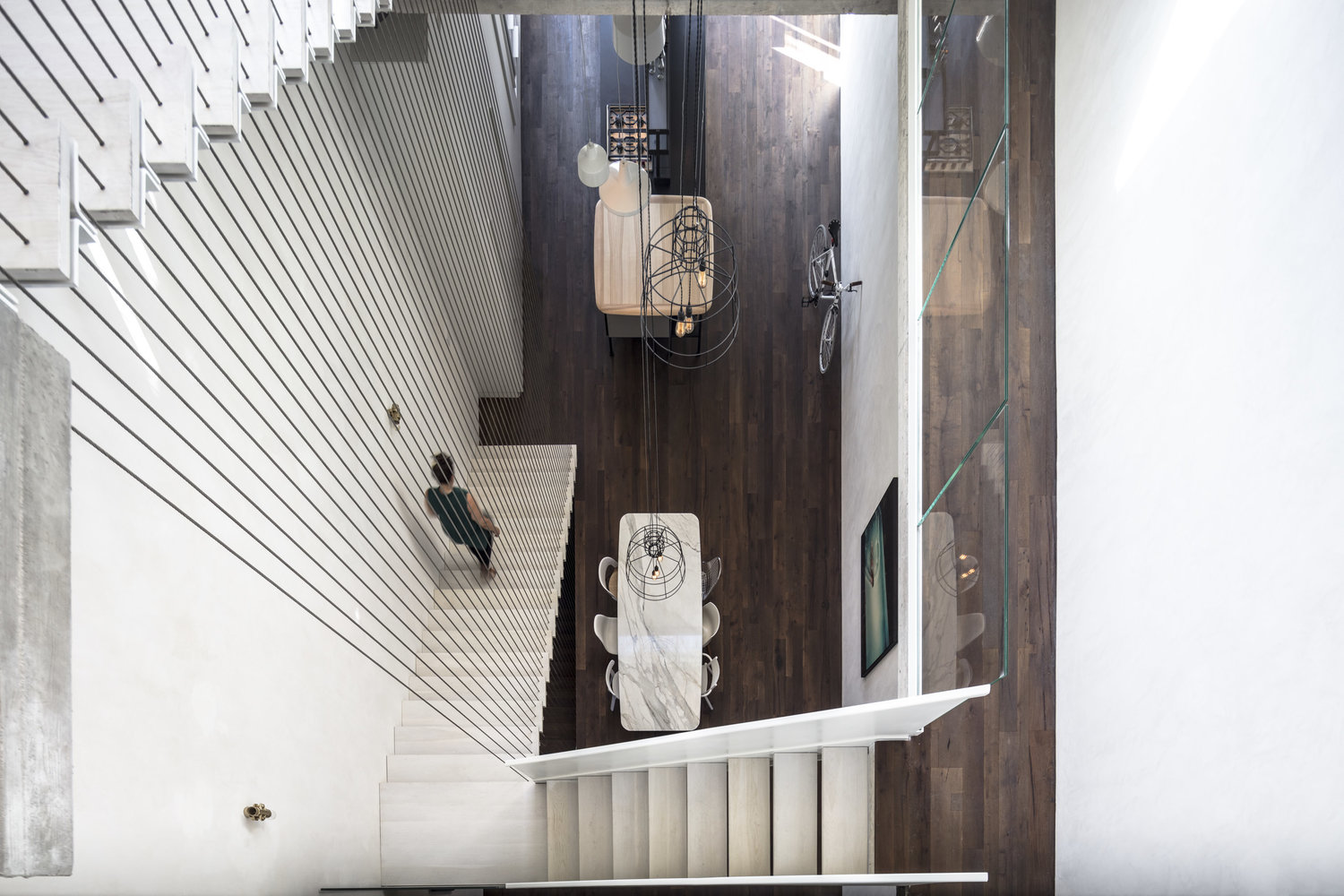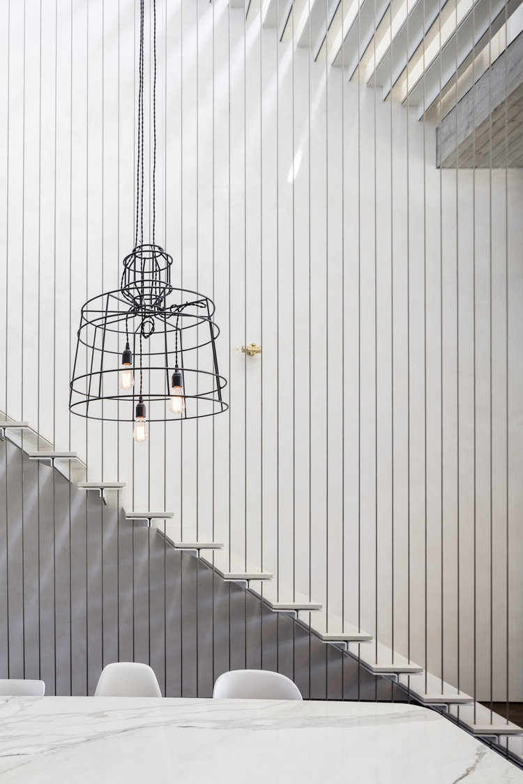 La fenêtre qui remplace l’accès à la terrasse sur le toit permet au soleil de se répandre dans toute la maison avec un nouvel éclairage et une pénombre. La lumière naturelle, qui change au cours des différentes heures de la journée, éclaire les intérieurs élégants de la maison et dessine les lignes de l’escalier.