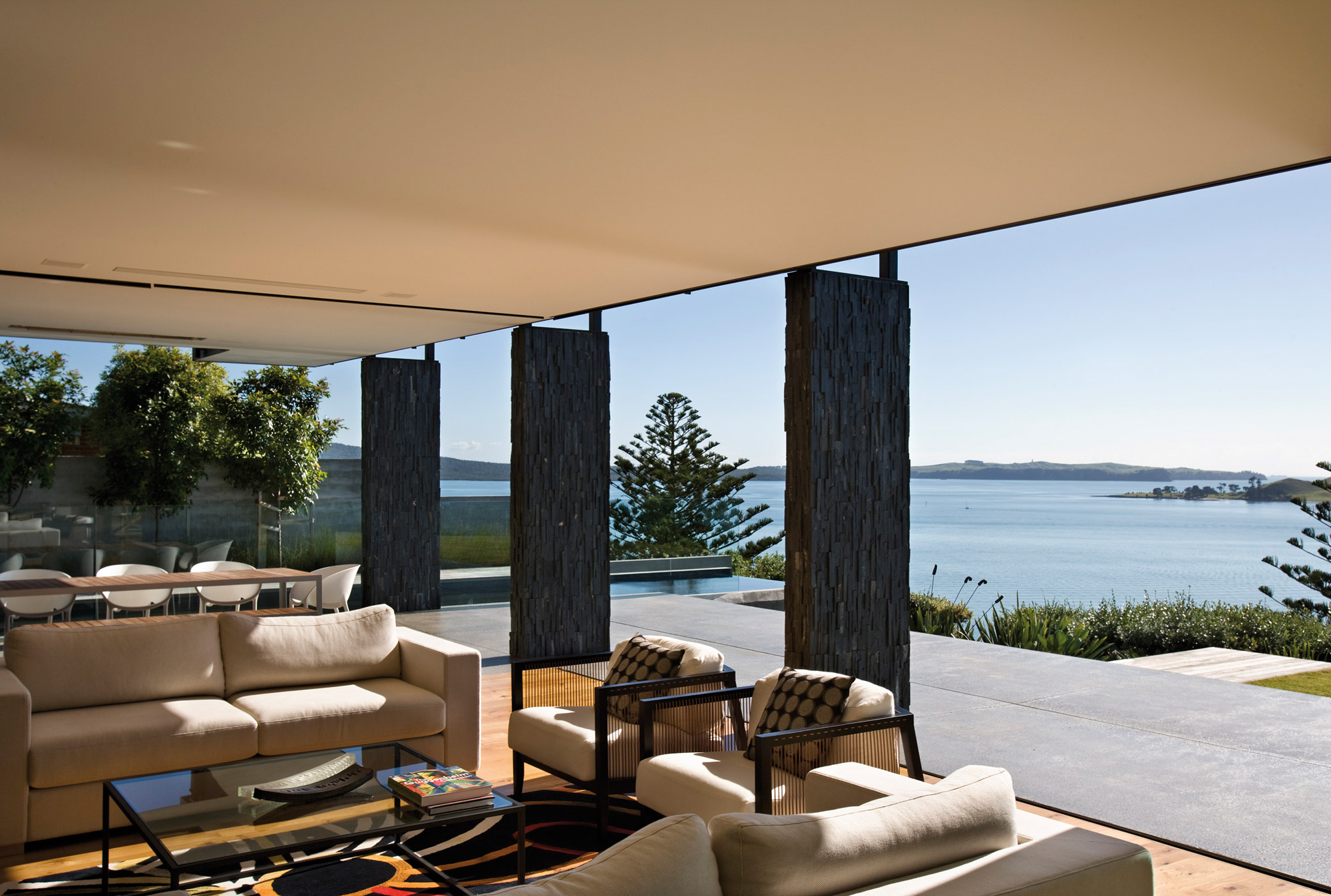 Ancrée dans son époque, voire en avance sur son temps, la Wairarohe House l’est parfaitement. Impressionnante, cette demeure entourée de verre, qui embrasse la baie de Karaka au sud d’Auckland, marie des matériaux bruts – pierre, bois, métal – dialoguant entre eux, à l’intérieur comme à l’extérieur… Ici, les espaces extérieurs s’imposent comme une réelle extension de l’intérieur, grâce aux imposantes baies vitrées qui, ouvertes, se cachent sur le côté… Cette impression est également renforcée par la présence d’une cheminée dehors. Les différents matériaux des sols, du béton poli pour la terrasse et du bois pour l’intérieur, nous rappellent cependant l’existence d’une mince frontière entre ces deux mondes. Les intérieurs, eux, ont été pensés pour s’adapter aux différents moments de vie des propriétaires. Le plan a été conçu à partir d’un espace central modulable reliant les différentes parties de la maison. Ainsi, le salon peut s’étendre pour les grands rassemblements. Un mur courbe de fines lattes de cèdre verticales menant vers le sous-sol vient, lui, rompre les lignes droites des volumes.