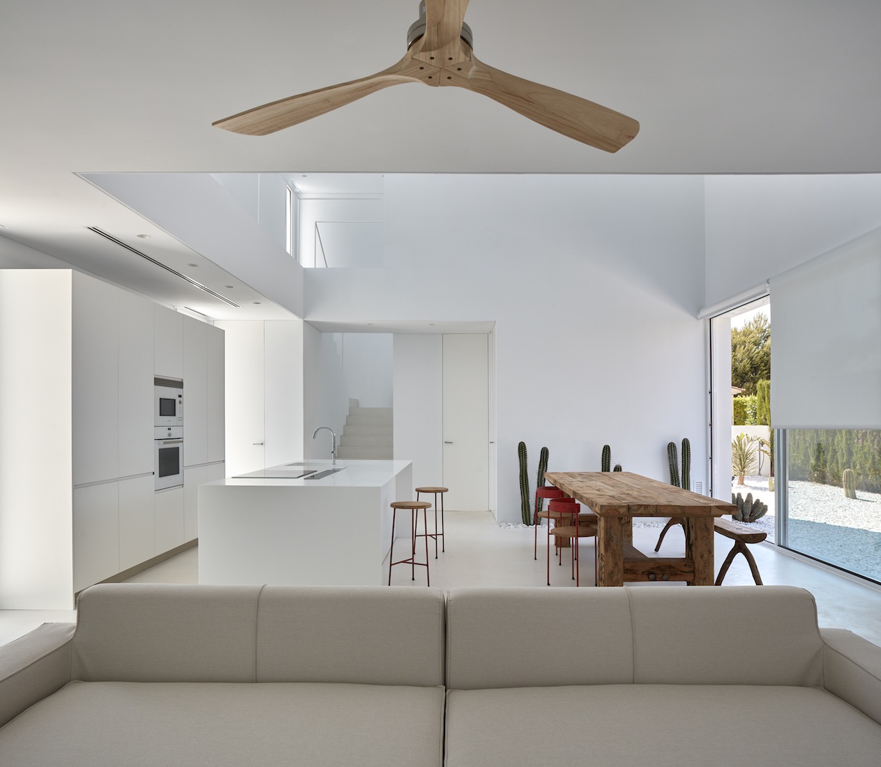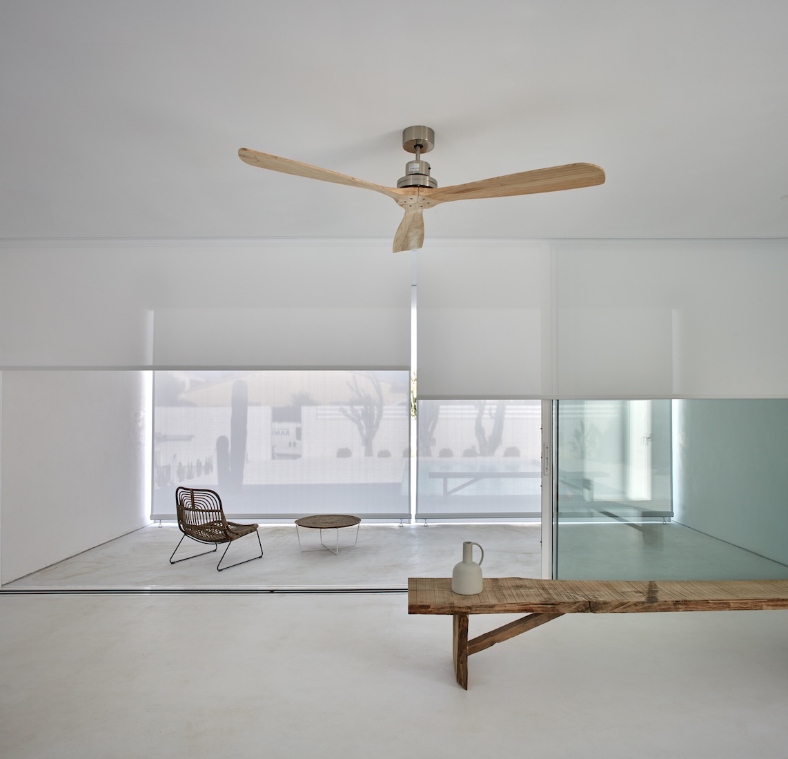 Un projet où la localisation des espaces est déterminée principalement par le trajet de la lumière tout au long de la journée. En entrant, la maison nous reçoit avec une grande ouverture donnant sur la piscine, au premier plan, et vers le château de Dénia sur un plan plus diffus. Cette grande ouverture, avec la possibilité de brouiller, une fois ouverte, la relation intérieur-extérieur, est encadrée par un porche de mêmes dimensions, qui atténue l’entrée du soleil dans les mois les plus chauds de l’année.