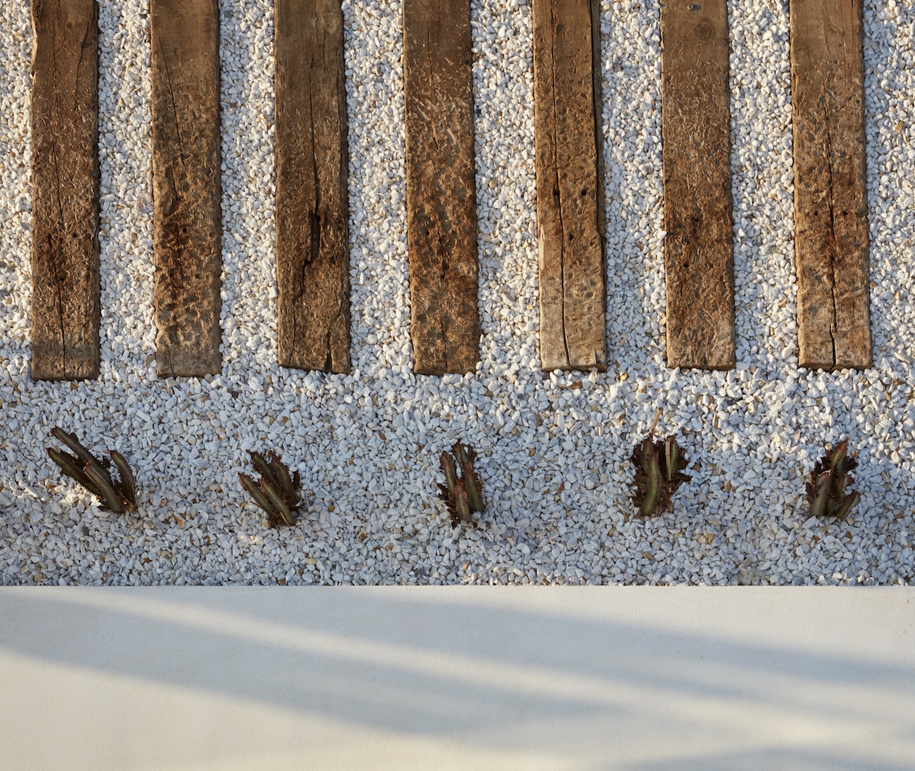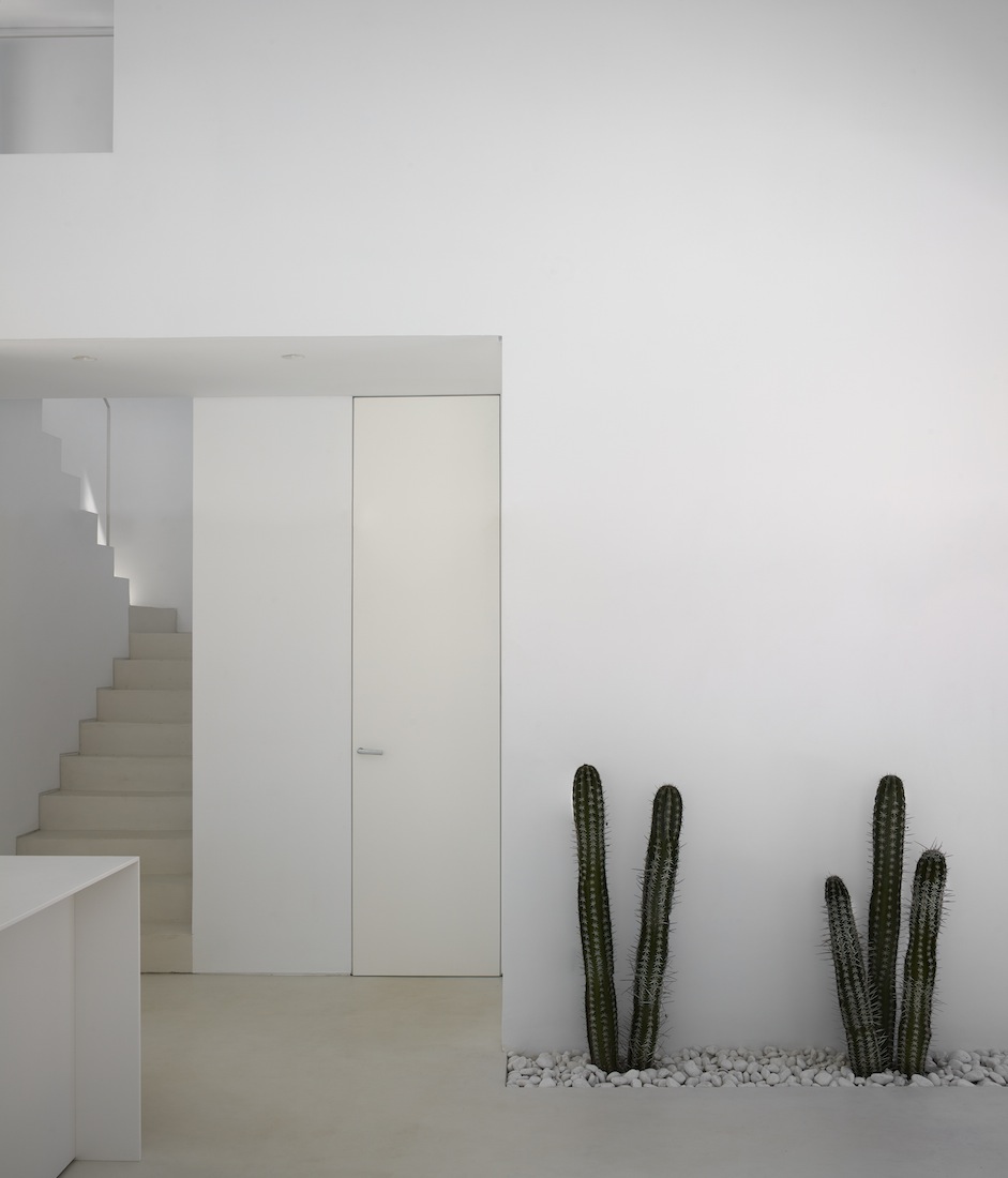 Le blanc comme sujet principale. C’est la prémisse qu’ils ont suivi du début à la fin. Blanc comme générateur et conducteur de lumière. Des ombres noires atténuées par son fond blanc. Une chaux blanche, dans ses faces verticales extérieures qui, lorsqu’elle atteint sa base, suit la même traçabilité et même linéarité en utilisant le microcement blanc comme continuité. La base du projet pourrait se traduire par une grande toile blanche dotée de différents pigments blancs pour constituer tous les espaces.