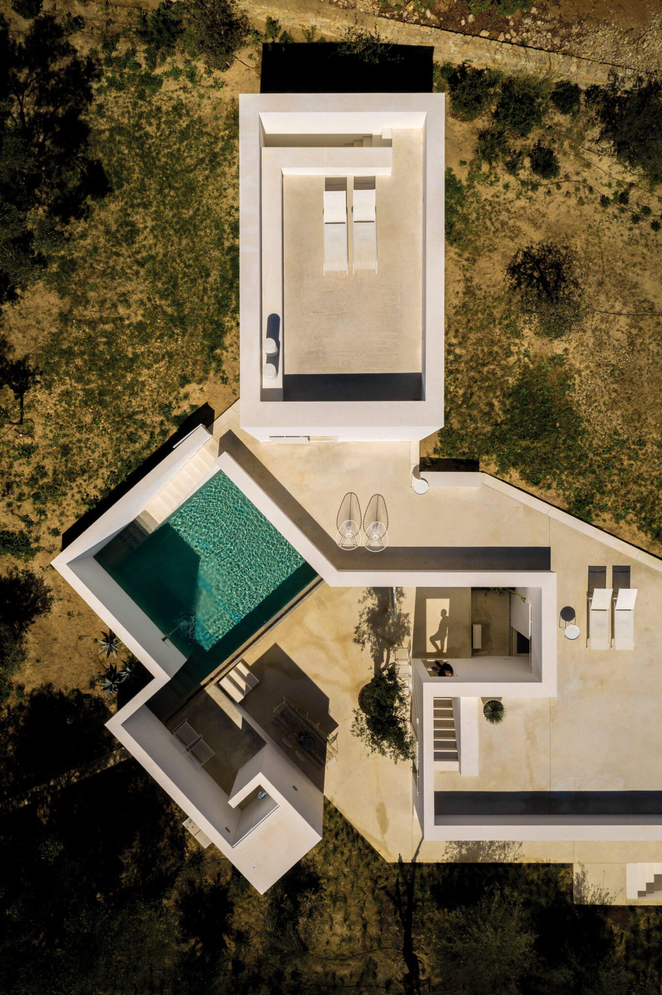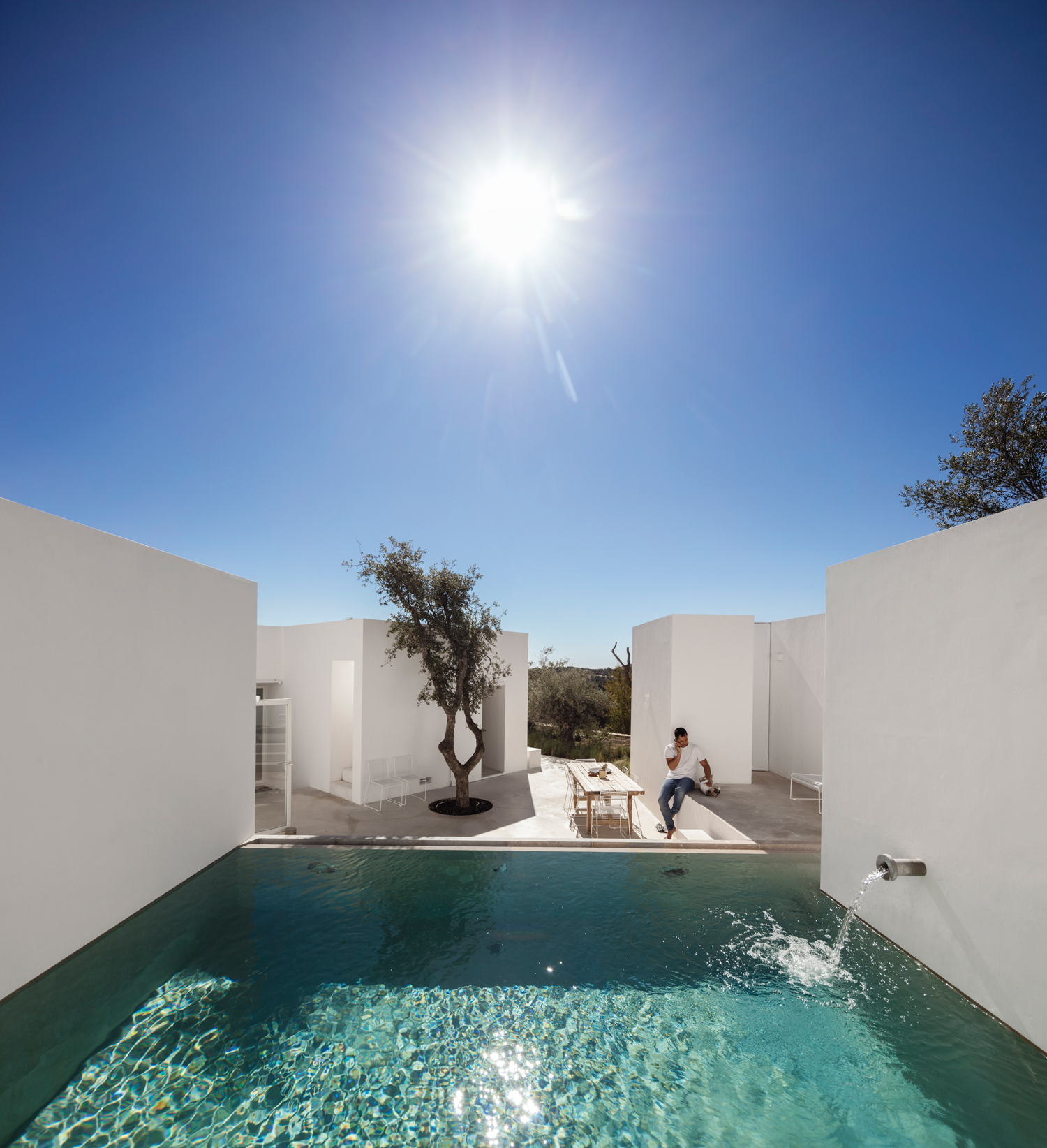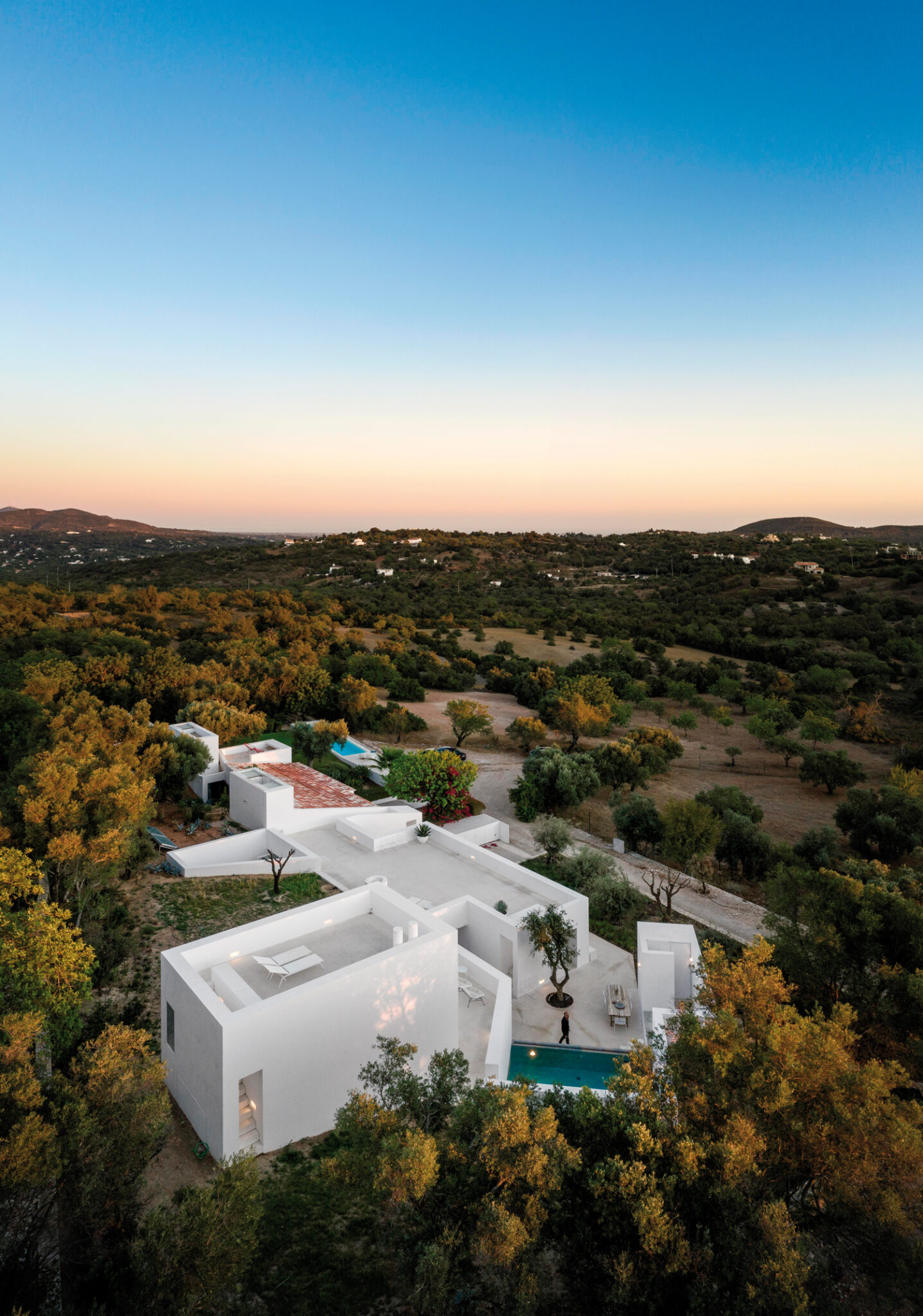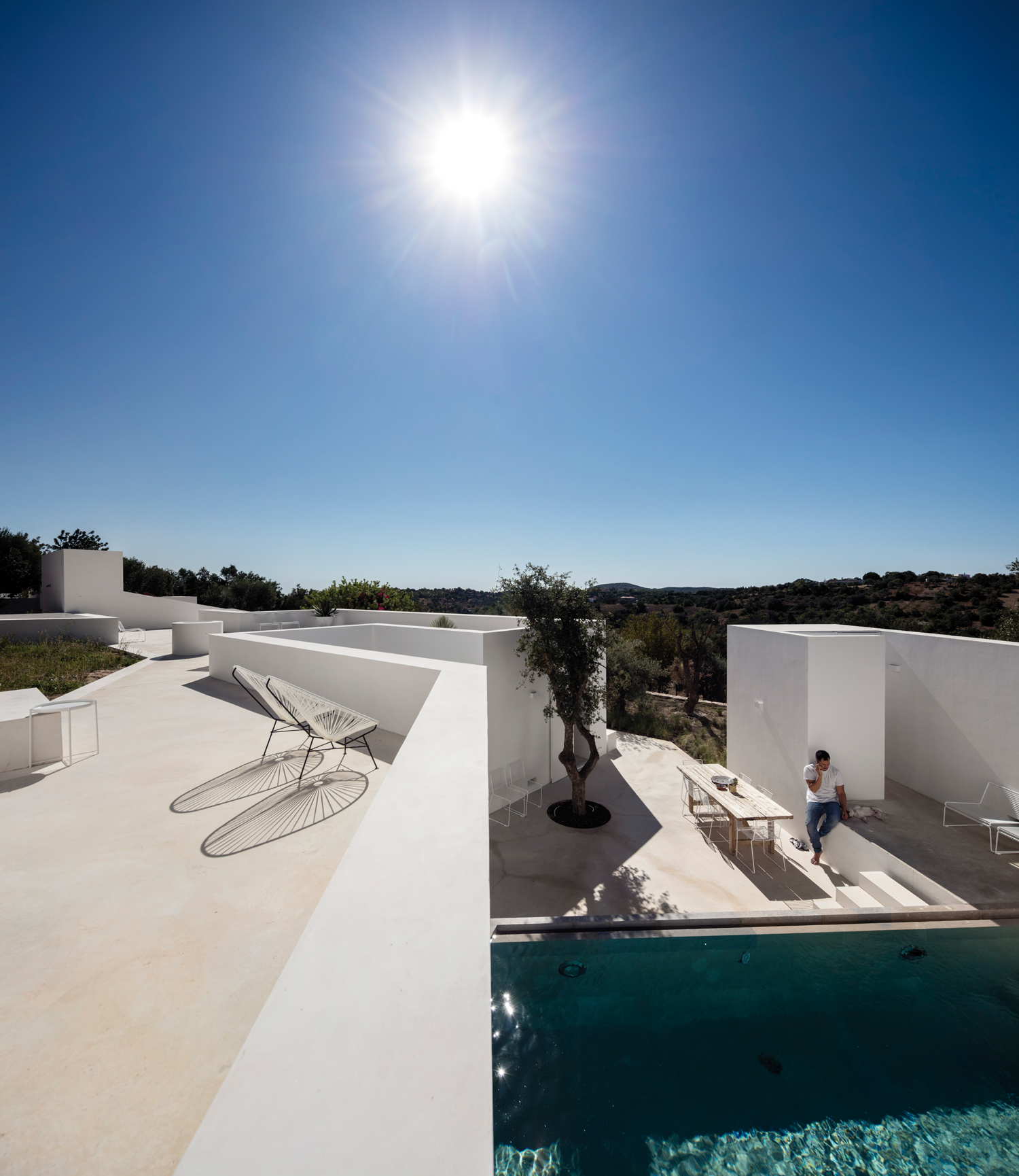 Aujourd’hui, avec la Casa Luum, Pedro Domingos continue de montrer sa sensibilité minimaliste. Nichée sur les hauteurs de la ville de Faro, au cœur d’un champ d’oliviers, d’amandiers et de chênes-lièges, la maison Luum est une réalisation directe- ment inspirée des maisons traditionnelles des environs. De fait, sols, murs et toit, sont tous parés d’un béton blanc qui unifie visuellement toute la construction. Établie sur les principes de la construction méditerranéenne, la Casa Luum est délimitée par un mur de pierre, mais aussi agrémentée d’arbres, d’un bassin d’eau et de bâtisses distinctes, de fenêtres de bois et de larges baies vitrées aux structures métalliques, élément, de fait, plus contemporain. Pièce centrale de l’édifice, le patio, autour duquel se déploie toute la maison Luum et qui joue, avec son bassin d’eau, les extensions du salon, version plein air. Bâtie sur deux étages, la casa Luum abrite quatre chambres et une cuisine toutes conscrites sur le premier étage. En offrant à cette partie un accès direct au patio et au bassin, mais aussi à un espace divinement baigné d’ombres et de lumière naturelle, l’architecte choisit là d’offrir le confort domestique de la maison, conçue pleinement pour la vie de ses habitants. À l’étage, là où se trouvent le salon et le solarium, l’espace est davantage dédié à la relaxation, à la contemplation ; celle de la nature environnante qui apaise autant qu’elle élève.