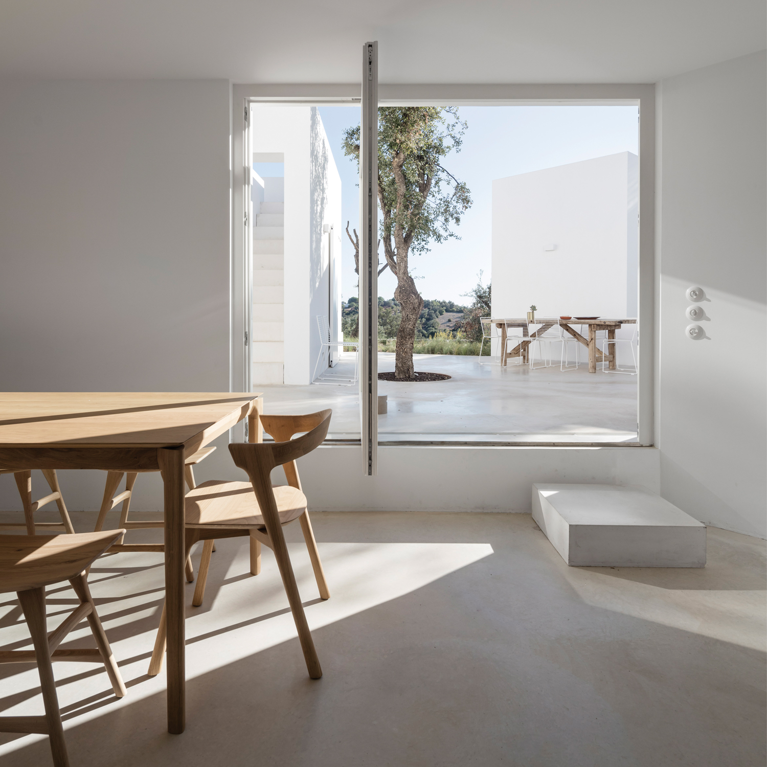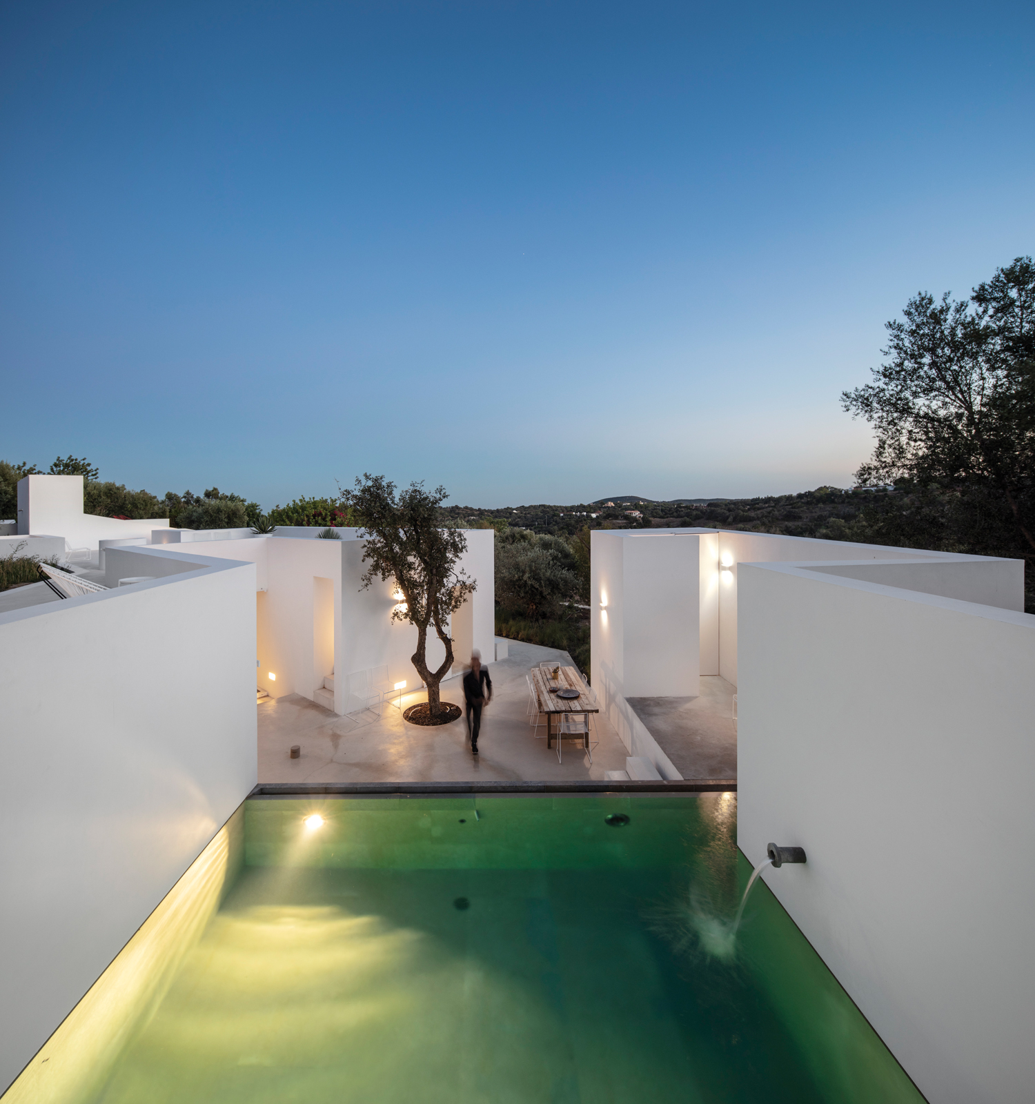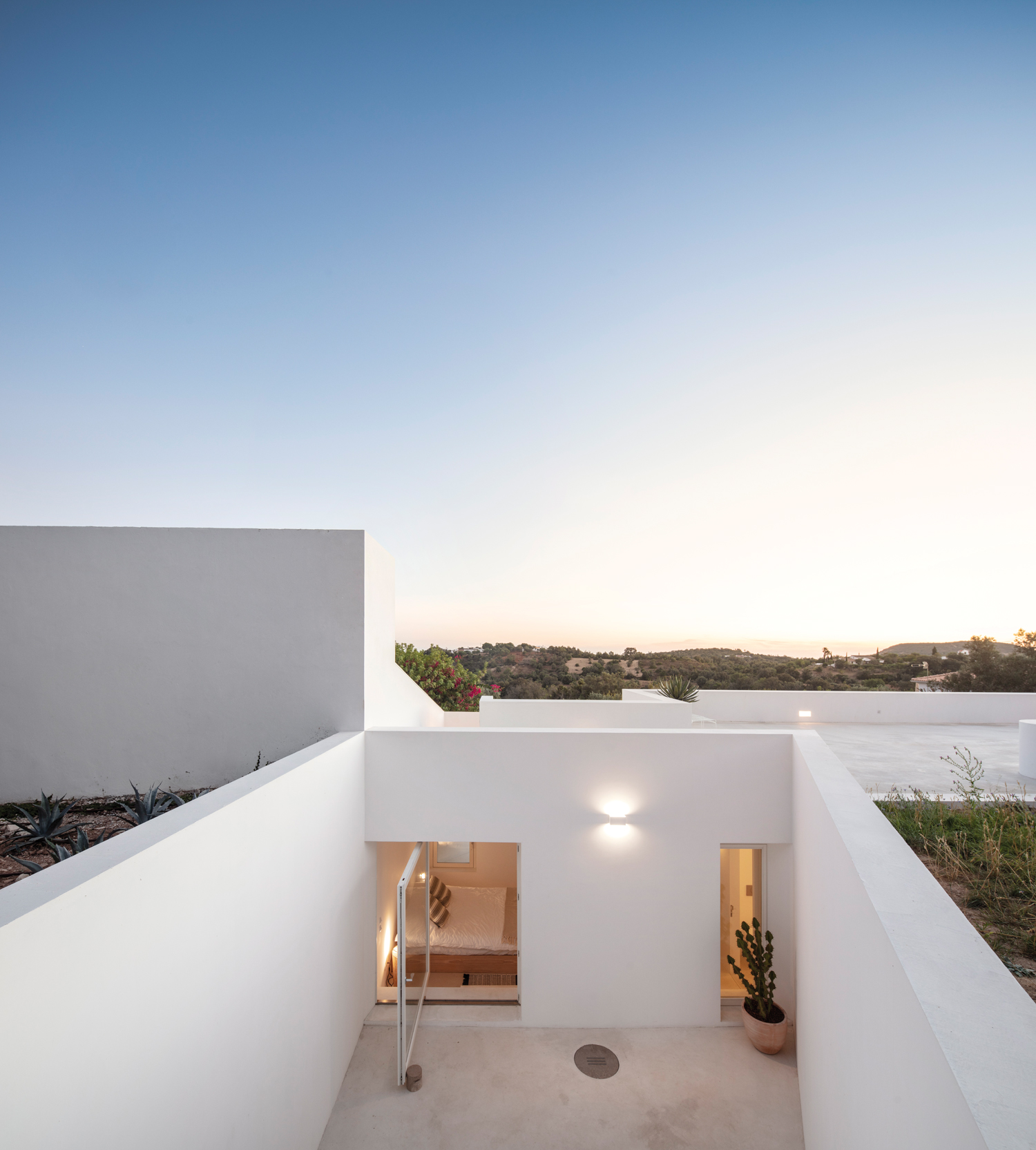 Aujourd’hui, avec la Casa Luum, Pedro Domingos continue de montrer sa sensibilité minimaliste. Nichée sur les hauteurs de la ville de Faro, au cœur d’un champ d’oliviers, d’amandiers et de chênes-lièges, la maison Luum est une réalisation directe- ment inspirée des maisons traditionnelles des environs. De fait, sols, murs et toit, sont tous parés d’un béton blanc qui unifie visuellement toute la construction. Établie sur les principes de la construction méditerranéenne, la Casa Luum est délimitée par un mur de pierre, mais aussi agrémentée d’arbres, d’un bassin d’eau et de bâtisses distinctes, de fenêtres de bois et de larges baies vitrées aux structures métalliques, élément, de fait, plus contemporain. Pièce centrale de l’édifice, le patio, autour duquel se déploie toute la maison Luum et qui joue, avec son bassin d’eau, les extensions du salon, version plein air. Bâtie sur deux étages, la casa Luum abrite quatre chambres et une cuisine toutes conscrites sur le premier étage. En offrant à cette partie un accès direct au patio et au bassin, mais aussi à un espace divinement baigné d’ombres et de lumière naturelle, l’architecte choisit là d’offrir le confort domestique de la maison, conçue pleinement pour la vie de ses habitants. À l’étage, là où se trouvent le salon et le solarium, l’espace est davantage dédié à la relaxation, à la contemplation ; celle de la nature environnante qui apaise autant qu’elle élève.