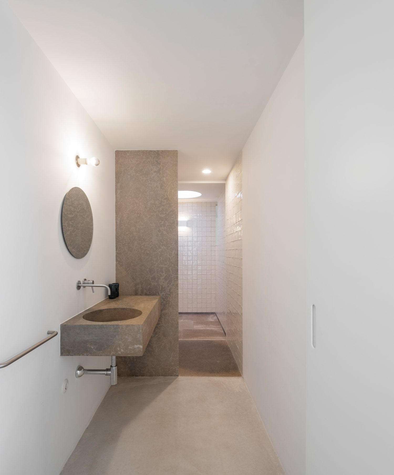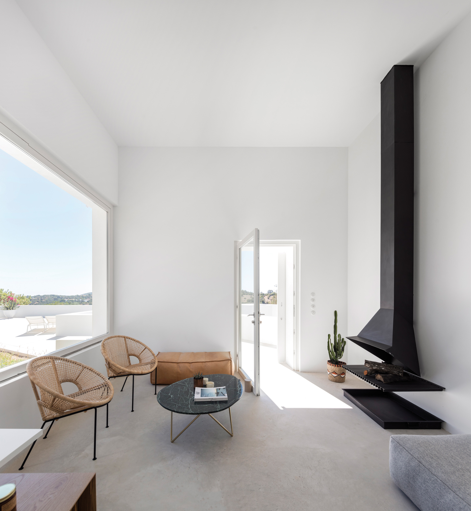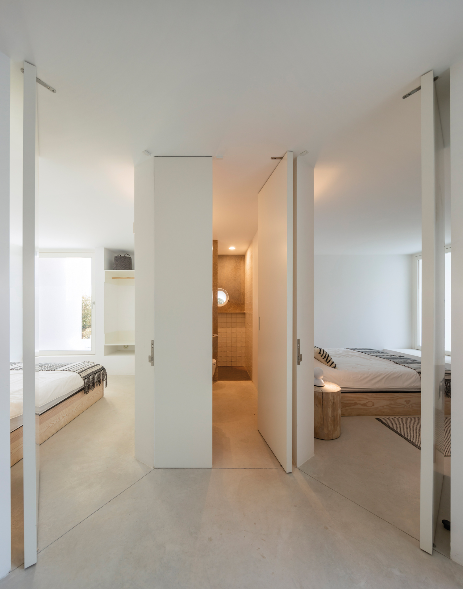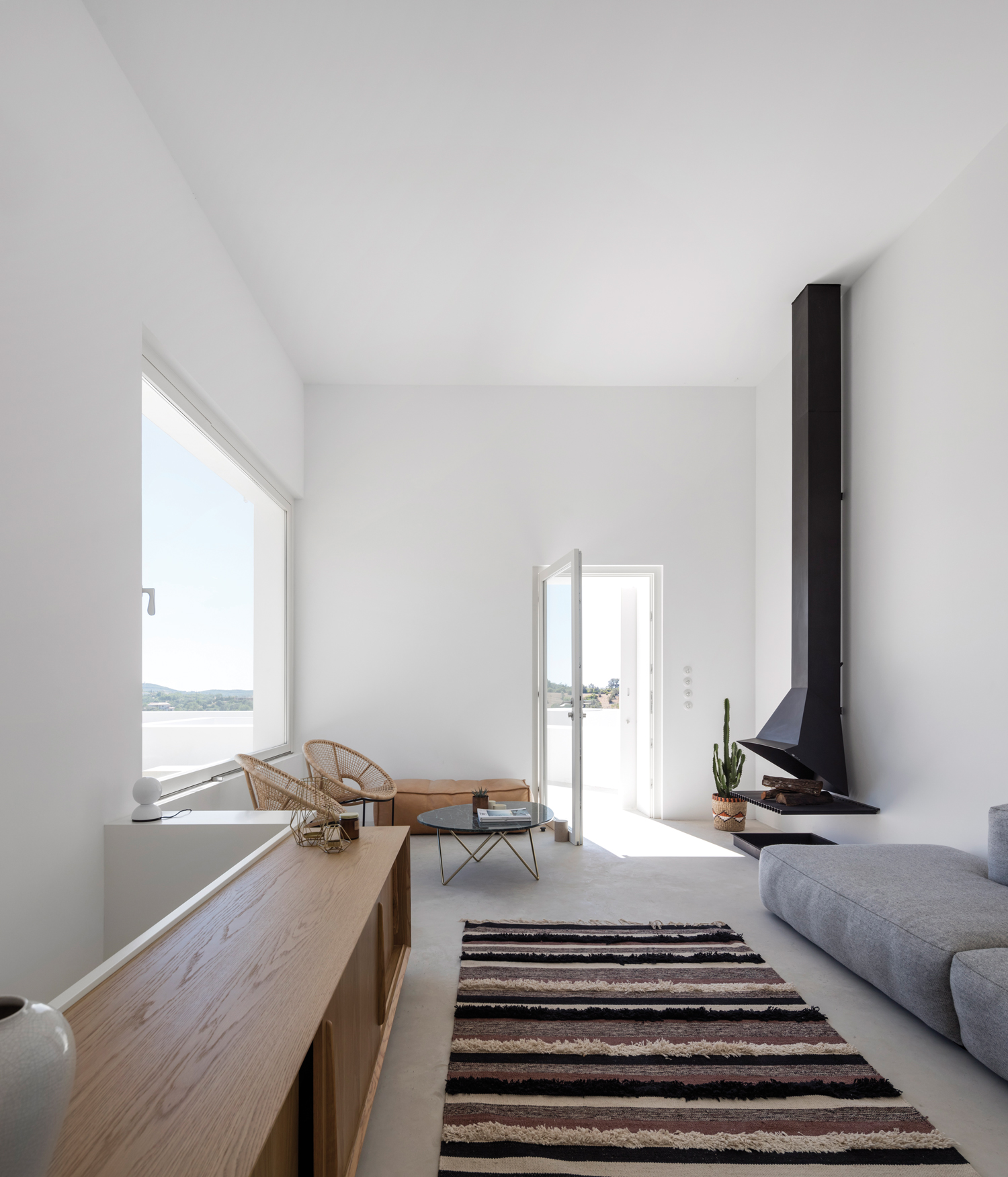 Aujourd’hui, avec la Casa Luum, Pedro Domingos continue de montrer sa sensibilité minimaliste. Nichée sur les hauteurs de la ville de Faro, au cœur d’un champ d’oliviers, d’amandiers et de chênes-lièges, la maison Luum est une réalisation directe- ment inspirée des maisons traditionnelles des environs. De fait, sols, murs et toit, sont tous parés d’un béton blanc qui unifie visuellement toute la construction. Établie sur les principes de la construction méditerranéenne, la Casa Luum est délimitée par un mur de pierre, mais aussi agrémentée d’arbres, d’un bassin d’eau et de bâtisses distinctes, de fenêtres de bois et de larges baies vitrées aux structures métalliques, élément, de fait, plus contemporain. Pièce centrale de l’édifice, le patio, autour duquel se déploie toute la maison Luum et qui joue, avec son bassin d’eau, les extensions du salon, version plein air. Bâtie sur deux étages, la casa Luum abrite quatre chambres et une cuisine toutes conscrites sur le premier étage. En offrant à cette partie un accès direct au patio et au bassin, mais aussi à un espace divinement baigné d’ombres et de lumière naturelle, l’architecte choisit là d’offrir le confort domestique de la maison, conçue pleinement pour la vie de ses habitants. À l’étage, là où se trouvent le salon et le solarium, l’espace est davantage dédié à la relaxation, à la contemplation ; celle de la nature environnante qui apaise autant qu’elle élève.