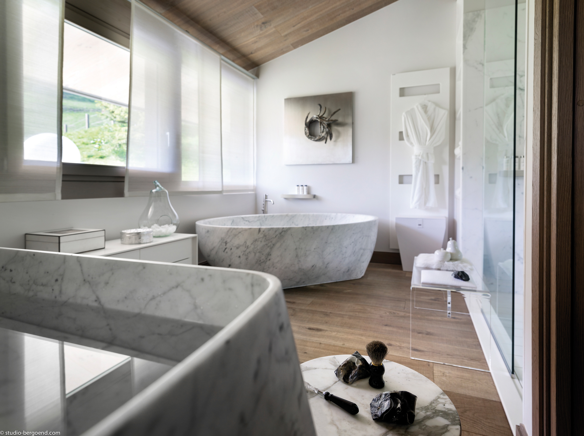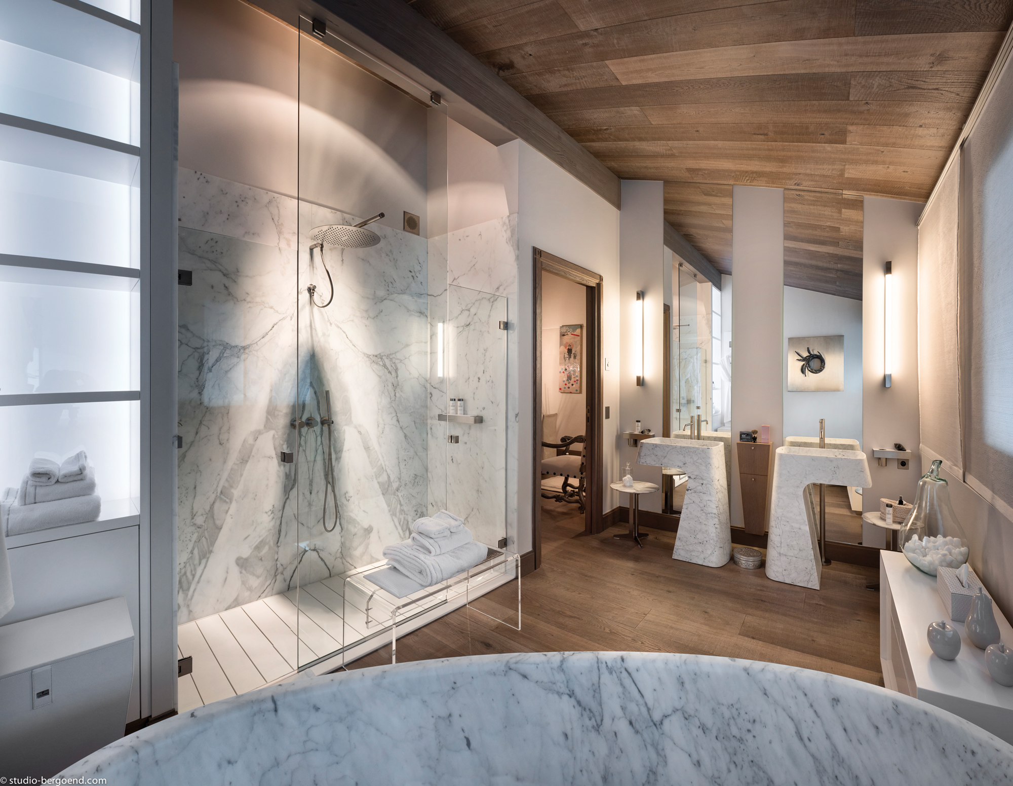 Les 4 suites, toutes différentes et pourvues chacune d’une salle de bains, ont été pensées dans le même esprit. Réalisées avec des matériaux nobles, dont du marbre, elles imitent des refuges silencieux au confort ultra douillet… Le chalet d’invités, quant à lui, plus intimiste peut-être, profite de prestations tout aussi haut de gamme. Prévu pour 8 personnes, il montre également un espace entièrement dédié aux enfants, pour le plus grand bonheur des petits… et de leurs parents !