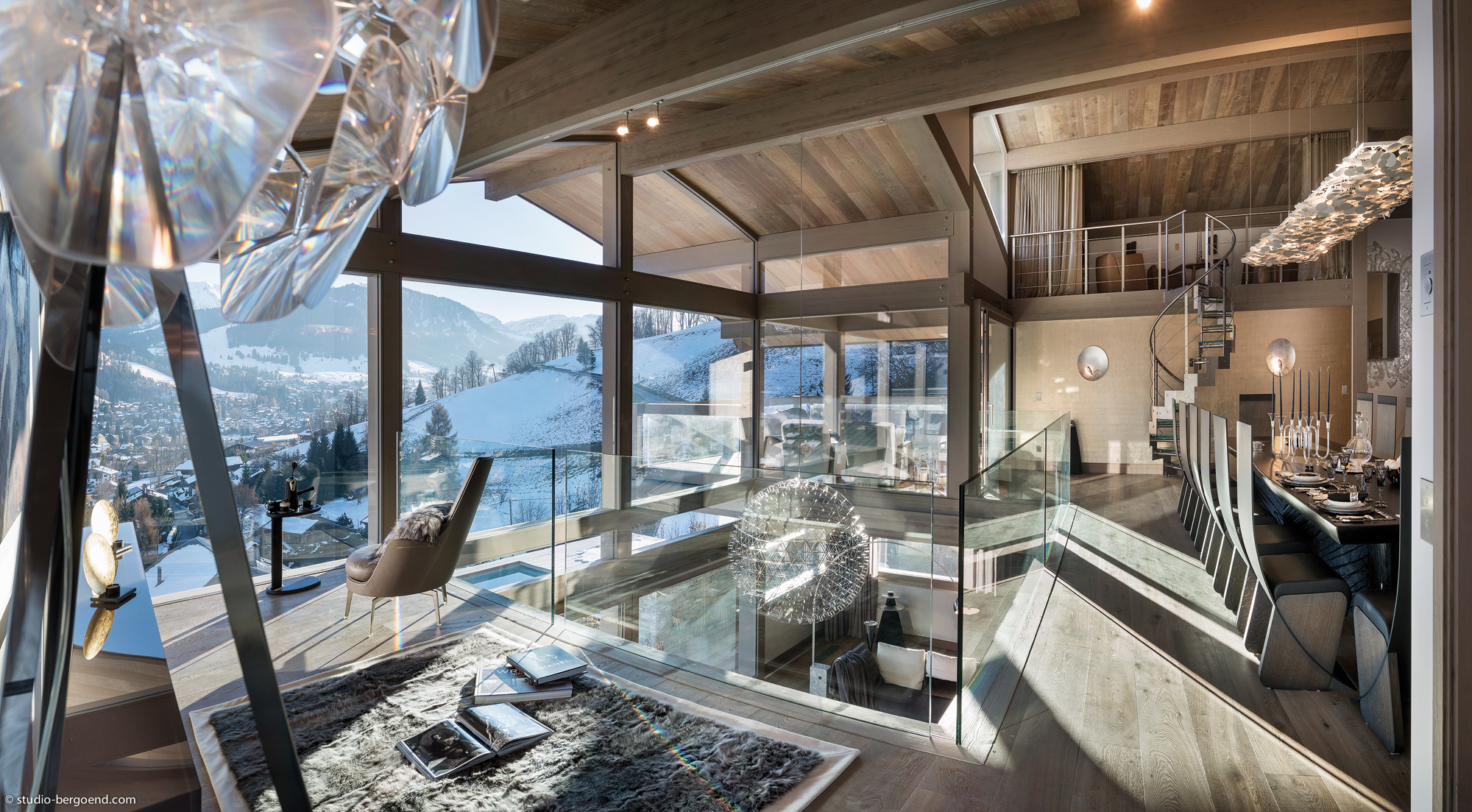 Spectaculaires, les espaces entièrement ouverts sur l’extérieur offrent des panoramas à couper le souffle sur la montagne et le village des Alpes. Avec ses surfaces vitrées partout, AXE&D Architecture a souhaité conférer au lieu de multiples transparences. Dans tous les différents niveaux joliment entremêlés entre eux, le verre demeure en effet un matériau très présent, tout comme le bois aux finitions plurielles. Même la cheminée du salon bar, à l’ambiance très feutrée, est en verre ! Espaces conviviaux ou plus intimes, chaque zone du chalet jouit d’un éclairage savamment étudié pour créer l’atmosphère idéale.