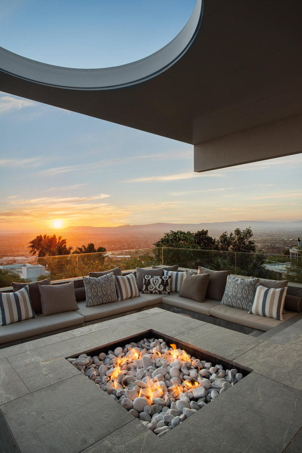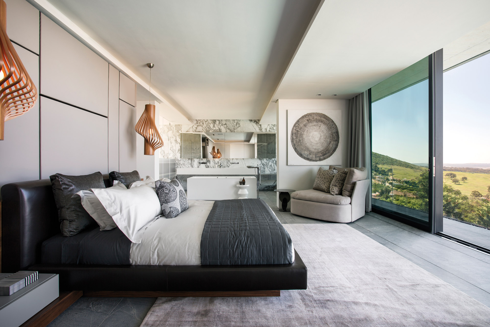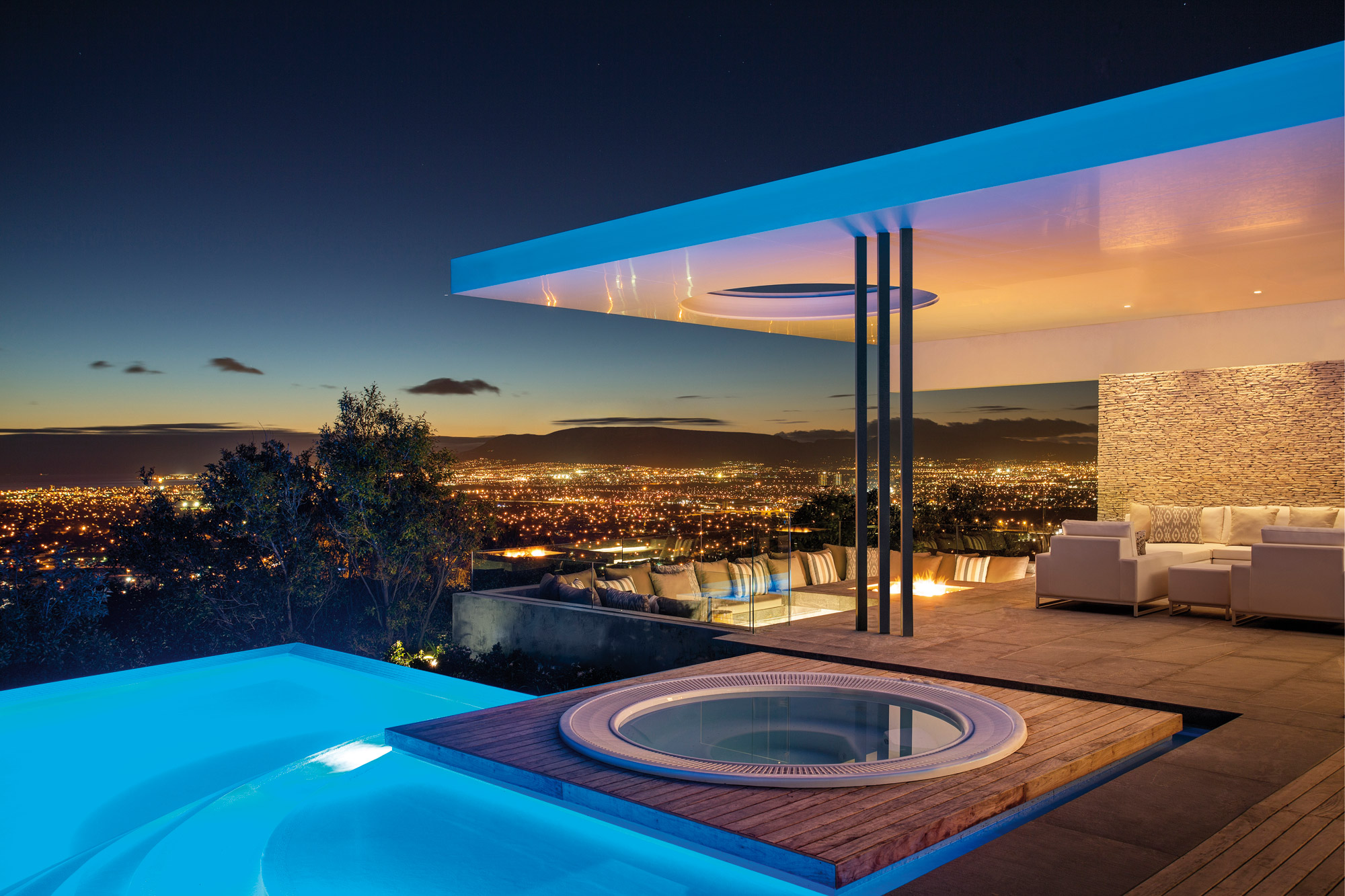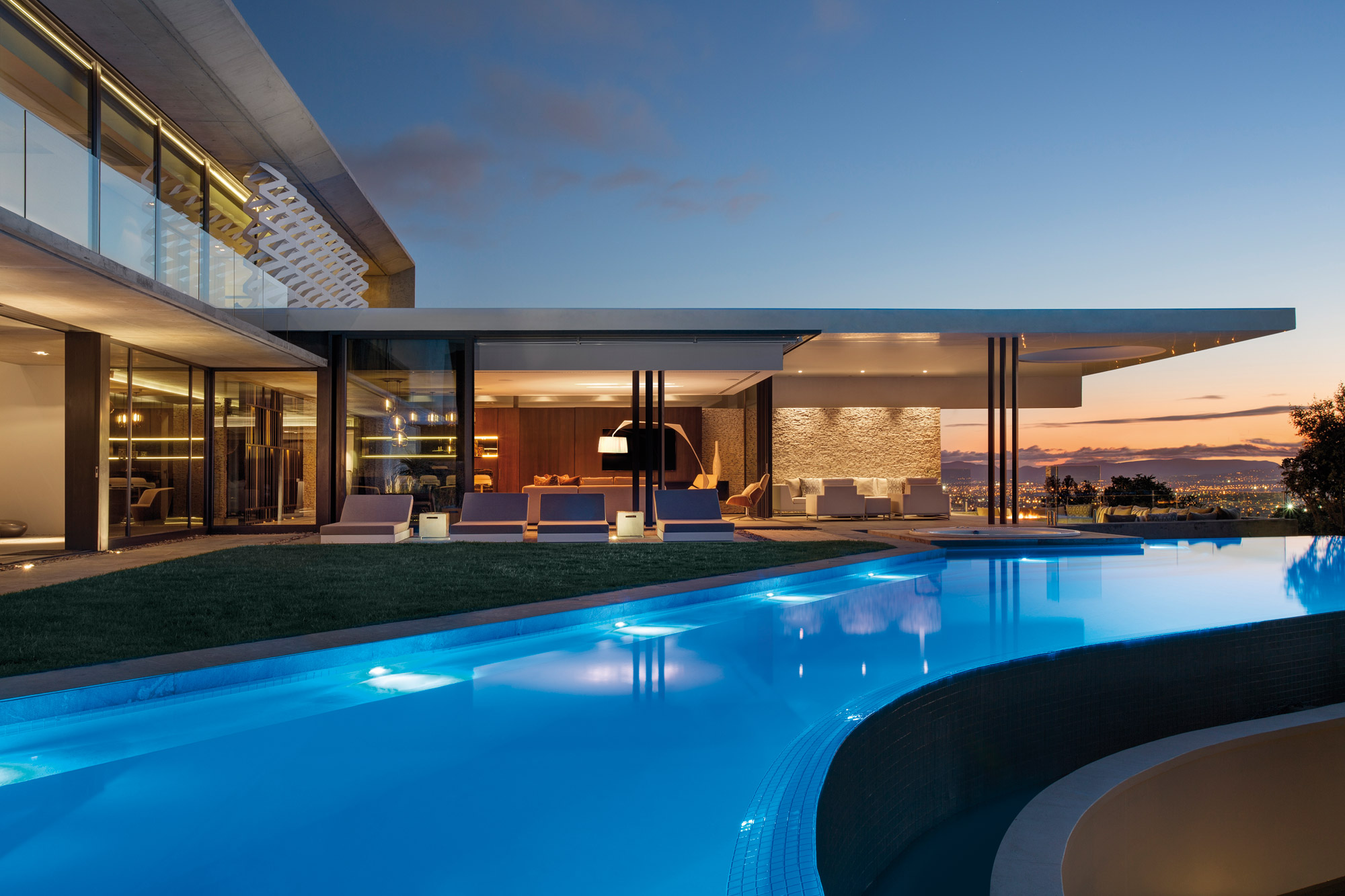Une piscine à débordement et un jacuzzi voisinent avec un salon presque suspendu au-dessus du vide. « Un écran blanc géométrique, installé à l’extérieur du niveau supérieur, ajoute des textures à la façade », complète l’agence. Quant à la casquette qui coiffe une partie de la terrasse pour lui conférer de l’ombre, elle dévoile une ouverture arrondie qui sculpte la lumière, et qui contraste avec les lignes tendues de la villa. Au premier étage, les quatre chambres très claires et lumineuses, dont la chambre des maîtres, jouissent de panoramas époustouflants sur la cité et la montagne. Avec des salles de bains pensées comme des boîtes de verre profitant de cette même vue. ARRCC réussit un projet contemporain ultra soigné, bien intégré dans son contexte, et sublimé par le spectacle de la ville qui se dessine au loin.
