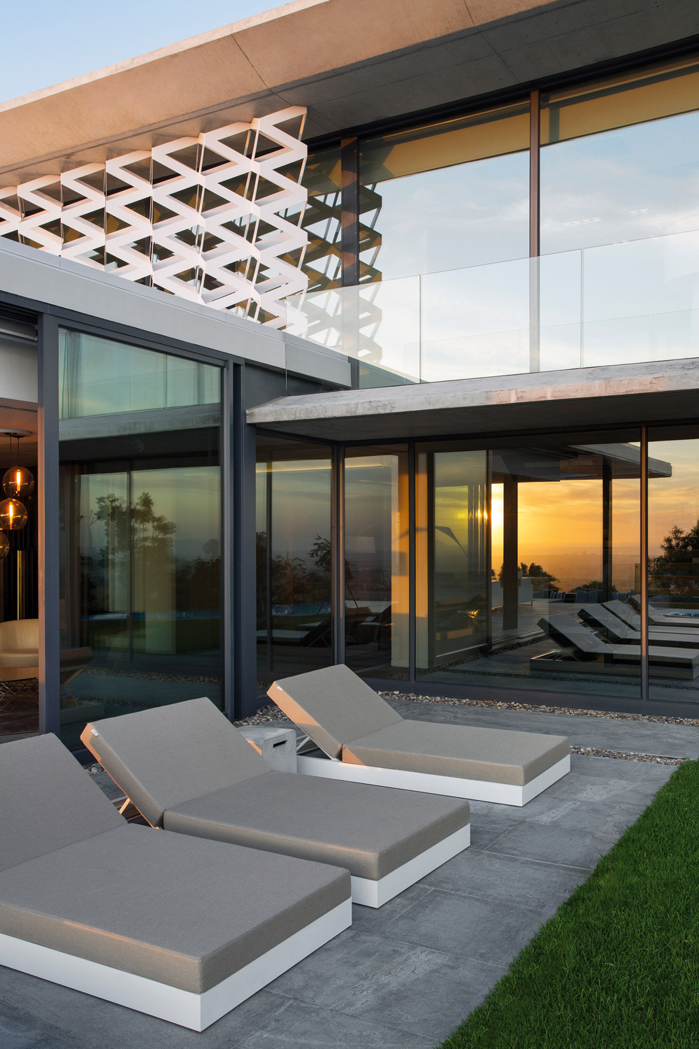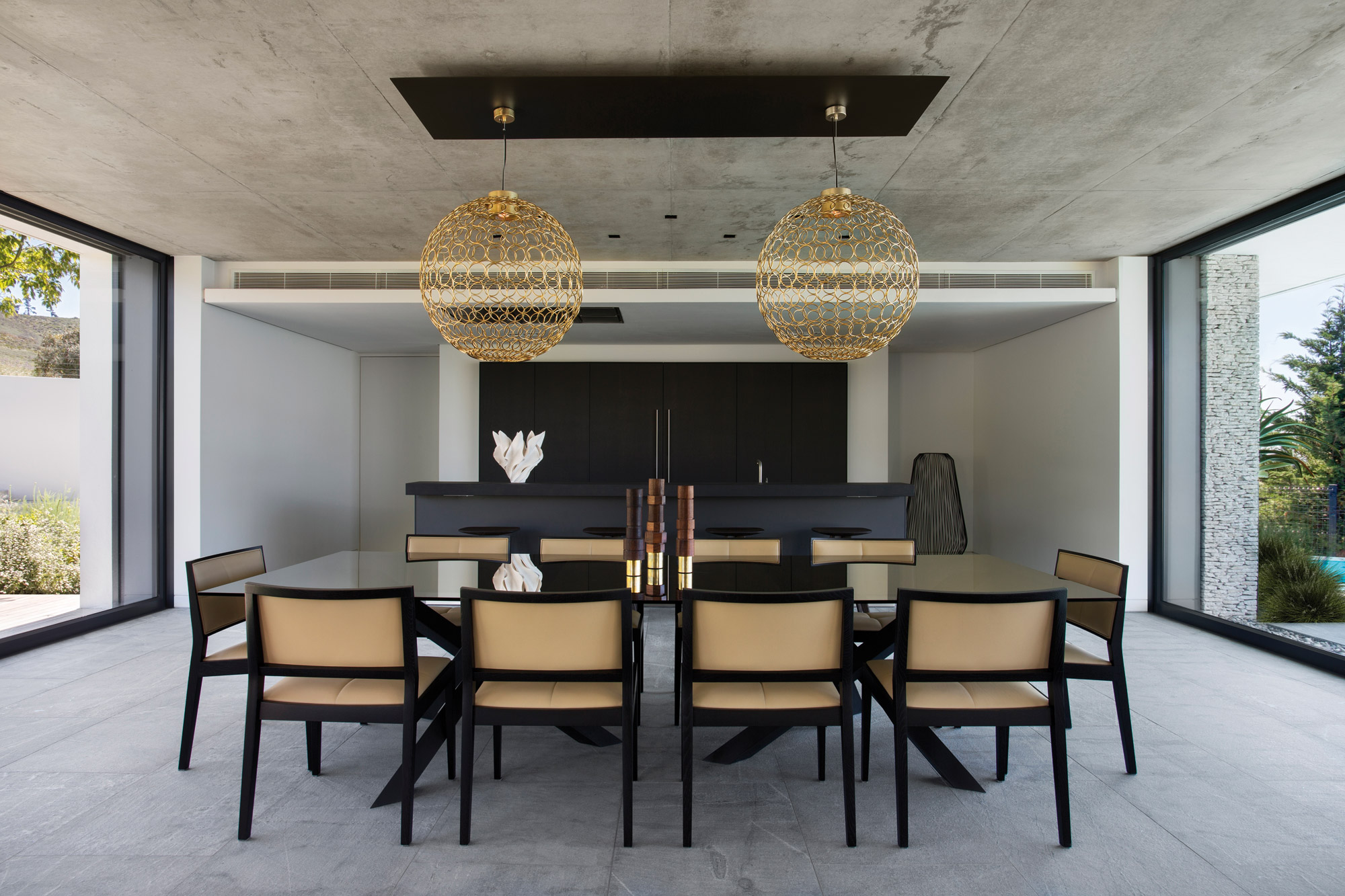 On y pénètre par une porte d’entrée en laiton semblant flotter, encadrée dans un cube aux parois vitrées, dans lequel le béton prend possession de l’espace. Un escalier agrémenté d’un garde-corps en acier mat noir et bronze mène ensuite au rez-de-chaussée et à la pièce de vie enfermant une cuisine Bulthaup, une salle à manger et un salon. Mais le plus impressionnant ici, c’est l’incroyable vue sur la ville qui jaillit à travers les grandes baies vitrées. Les surfaces extérieures, agrémentées de mobilier Manutti, découvrent également des espaces généreux et luxueux. Avec des finitions de sols identiques à celles des intérieurs pour gommer cette frontière entre le dedans et le dehors.