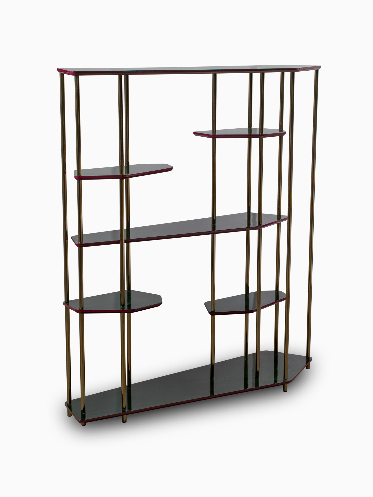 La bibliothèque Molecole appartient également à la même collection et rappelle les mêmes lignes aériennes; la structure élancée accueille des étagères plaquées en Briarwood et laquées en rouge rubis.