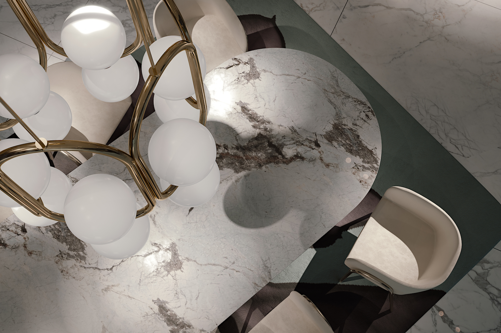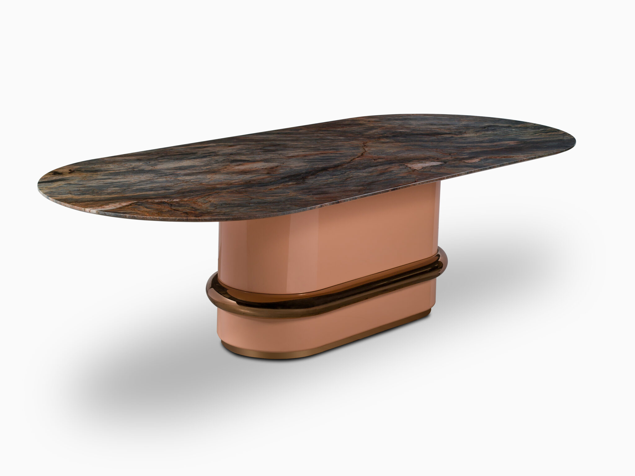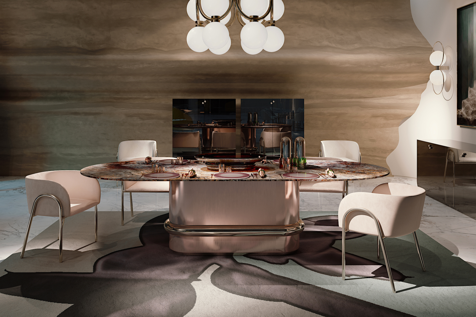 Ring, une table à manger à base cylindrique (qui dissimule un cœur en bois) et entourée d’un anneau doré, accentue la matérialité raffinée d’Antolini. Des nuances de rose délicates illuminent la pièce et son design contemporain, entourées de gracieuses chaises bébé à structure tubulaire et assise enveloppante.