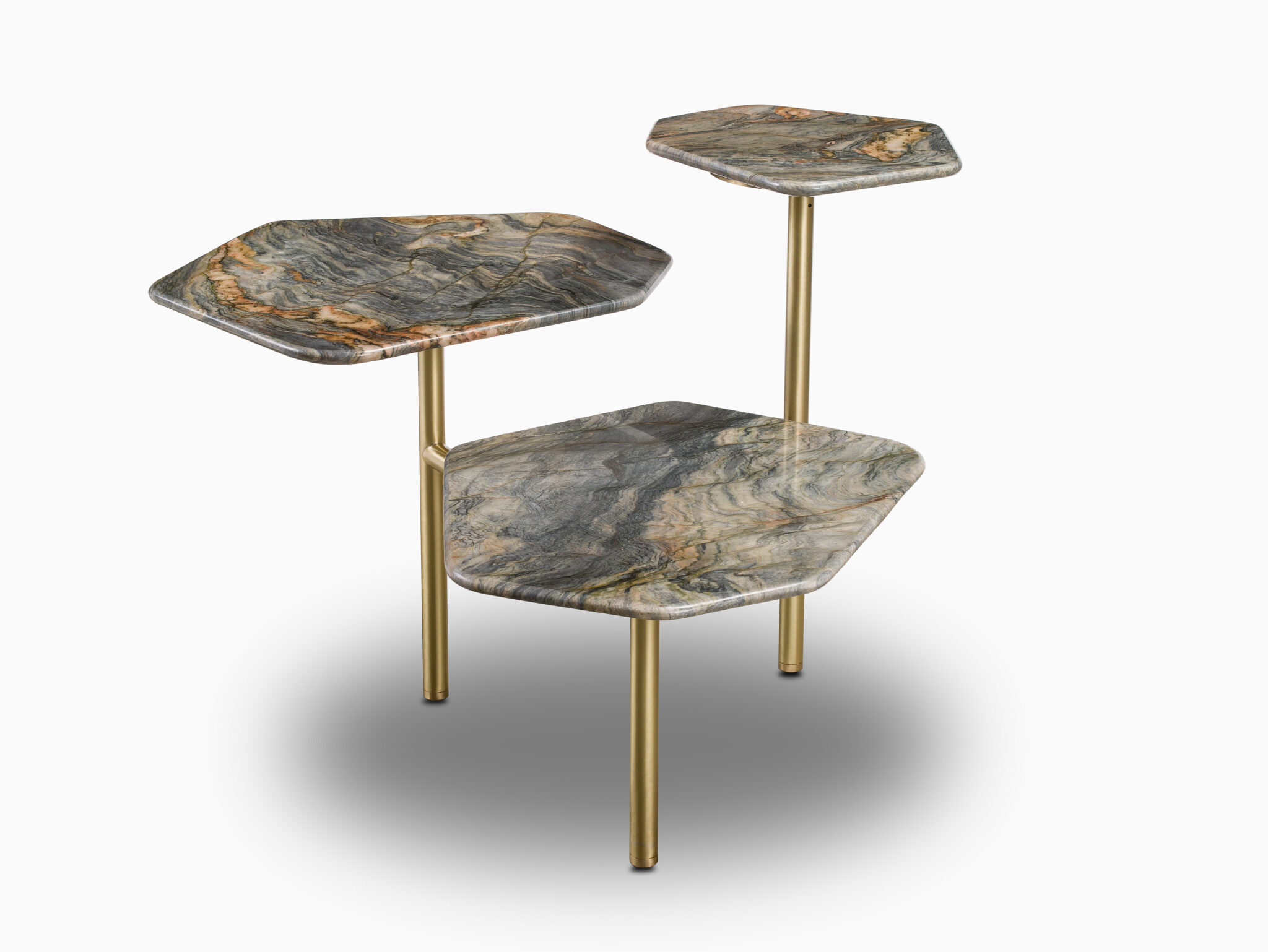 The Molecole Table Coffee de Clan Milano présente une structure minimaliste – finition laiton – soulignée par des dessus en marbre décalés (fabriqués à partir d’une seule dalle) choisis et traités par Antolini. Une pièce dynamique qui souligne fortement la précieuse tactilité de la pierre naturelle.
