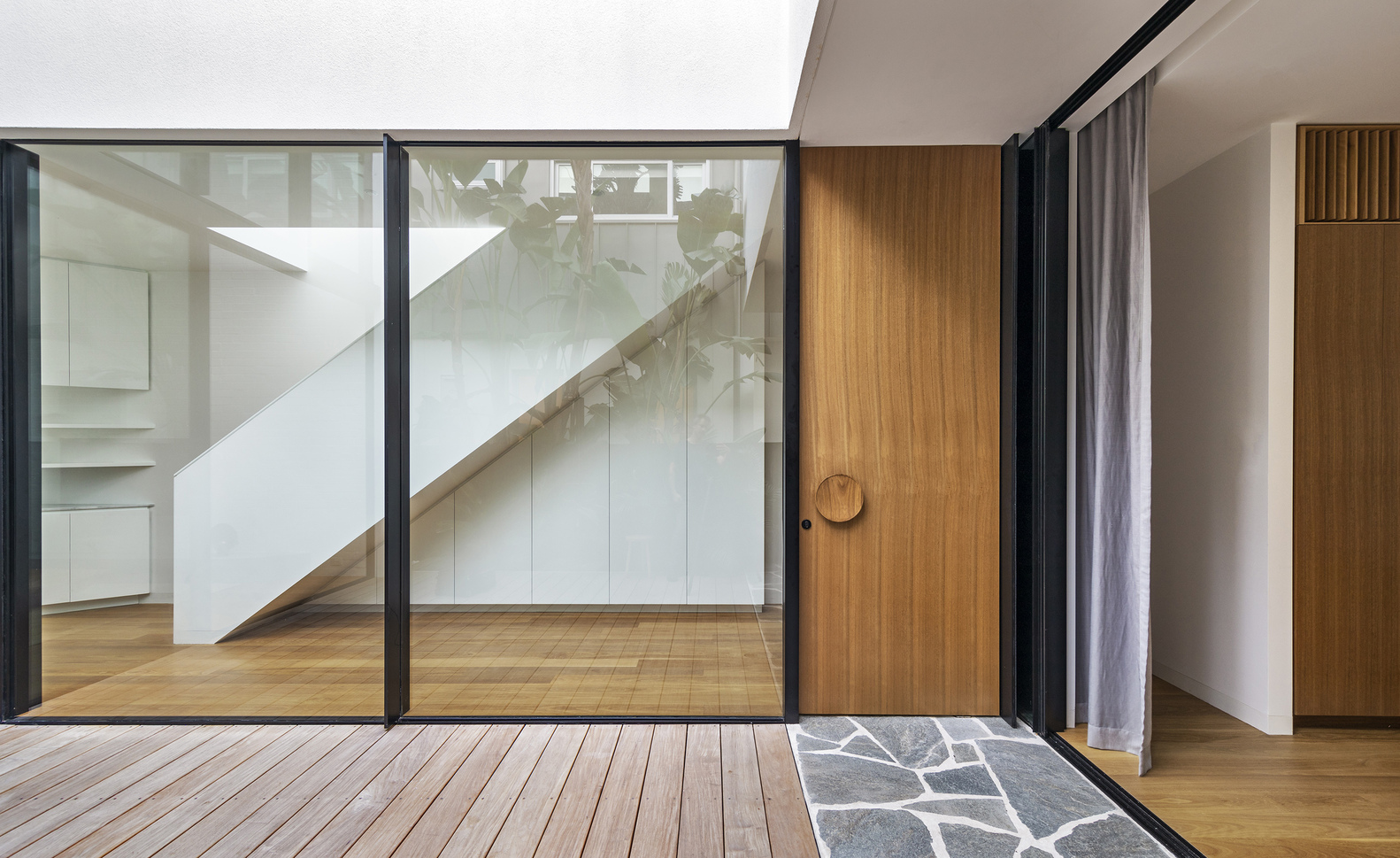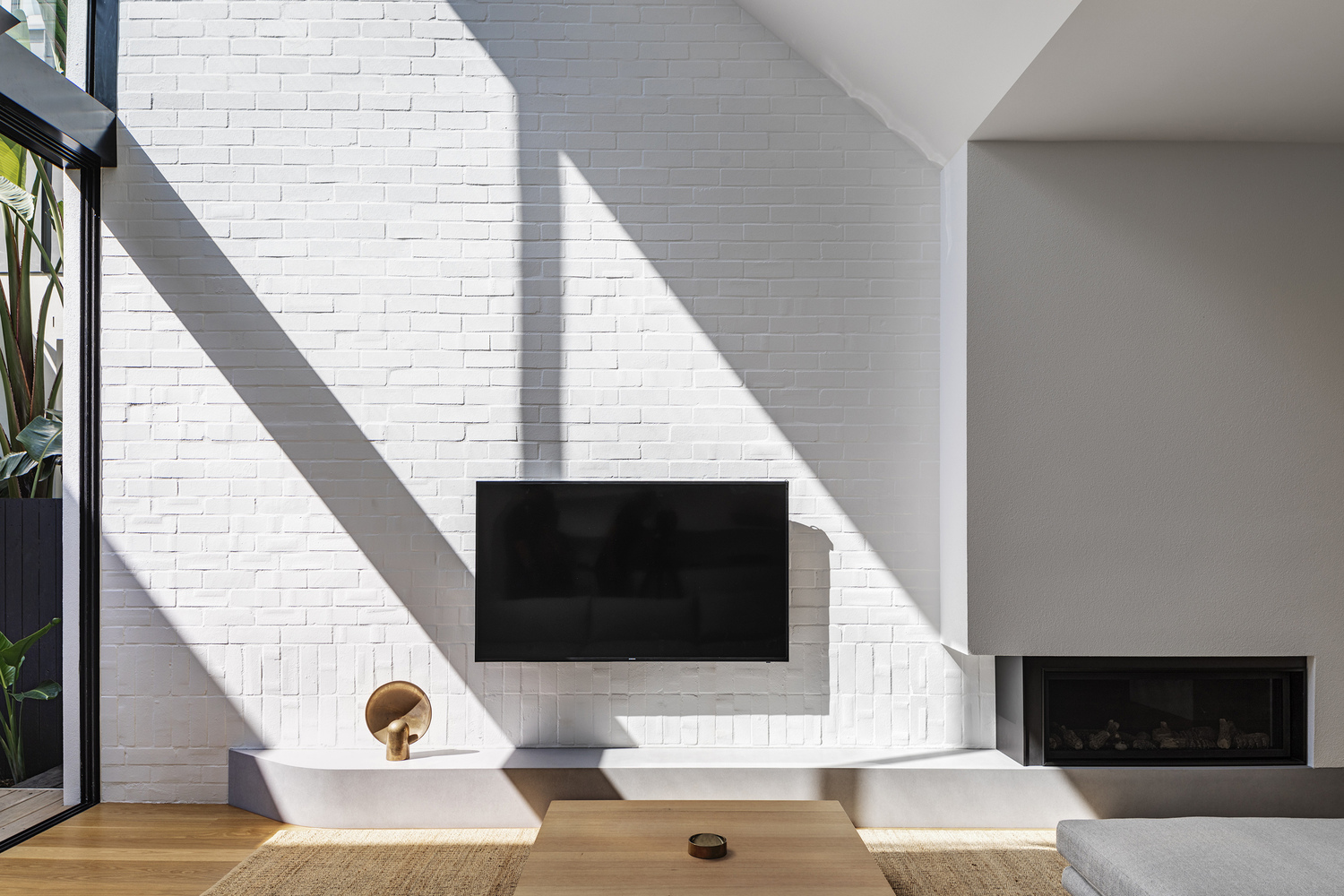 A l’intérieur de la maison, une palette de couleurs sobres composée de bois, de blancs et de gris chauds permet de relier le contexte côtier de Bondi, tandis que les finitions murales telles que les briques légèrement ensachées capturent la lumière changeante tout au long de la journée.