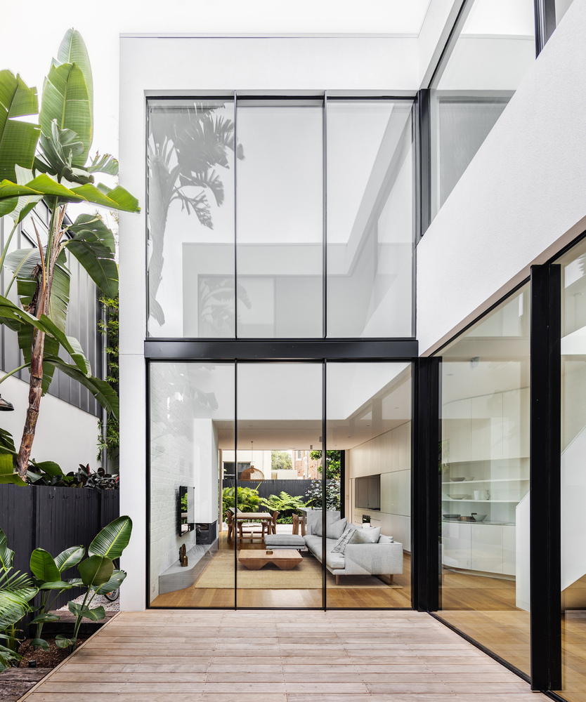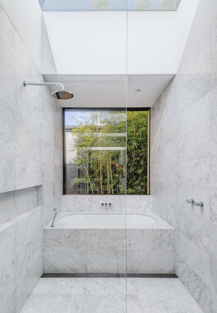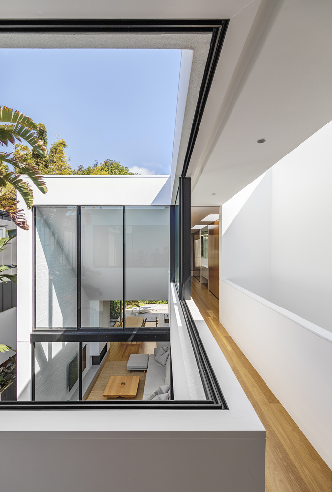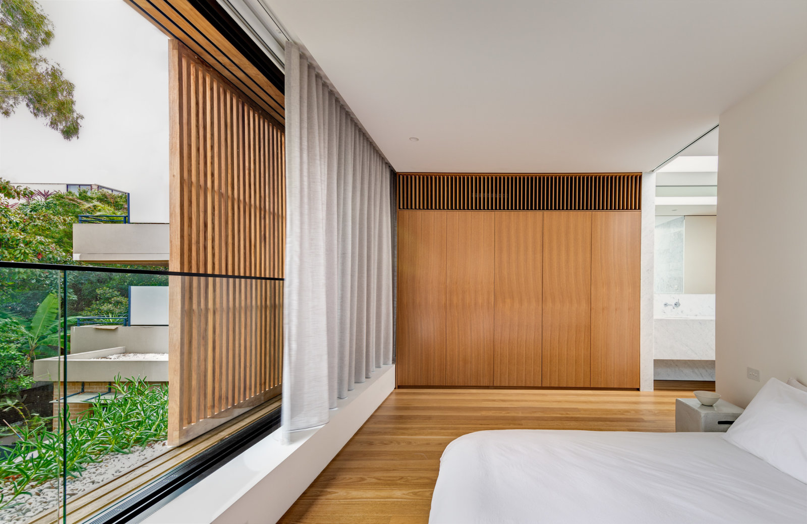 L’aménagement paysager faisait partie intégrante de la conception dès la conception et la collaboration avec Dangar Barin Smith a permis d’intégrer de manière transparente des espaces extérieurs tels que le jardin arrière, la douche extérieure et la cour en bois au rez-de-chaussée, tandis qu’un lit de jardinière adoucit le bord de la chambre principale. au premier étage. Le projet était simple et a été réalisé en combinant des détails de conception rigoureux et le savoir-faire de l’équipe de construction. Des collaborations avec des entrepreneurs spécialisés ont permis de réaliser des éléments sur mesure tels qu’un socle en béton incurvé, une fenêtre circulaire en acier pivotante et des écrans de protection de la vie privée en bois ouvrables.